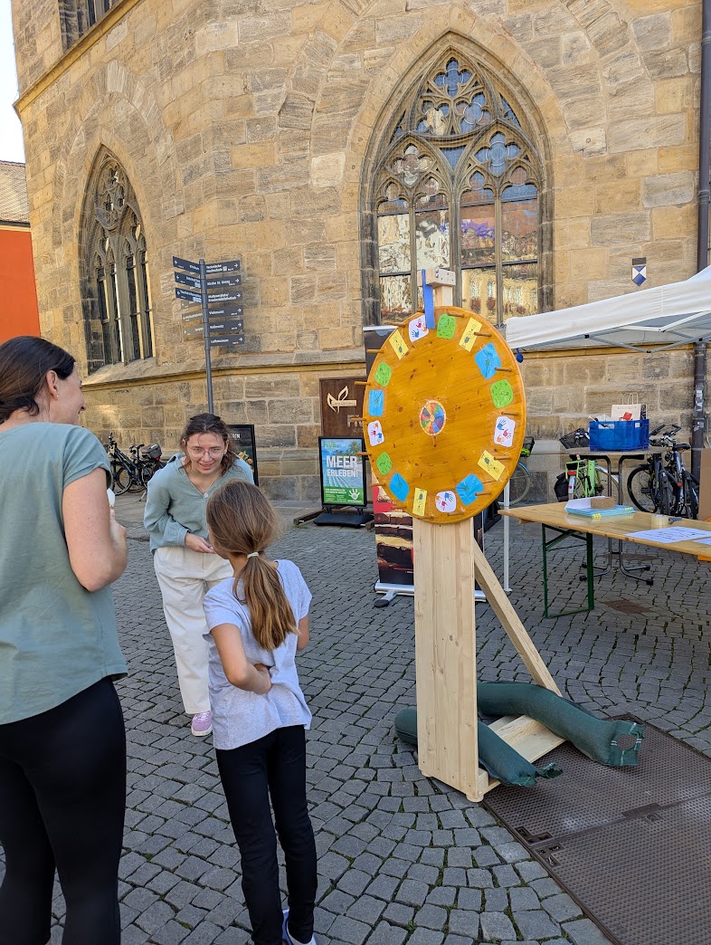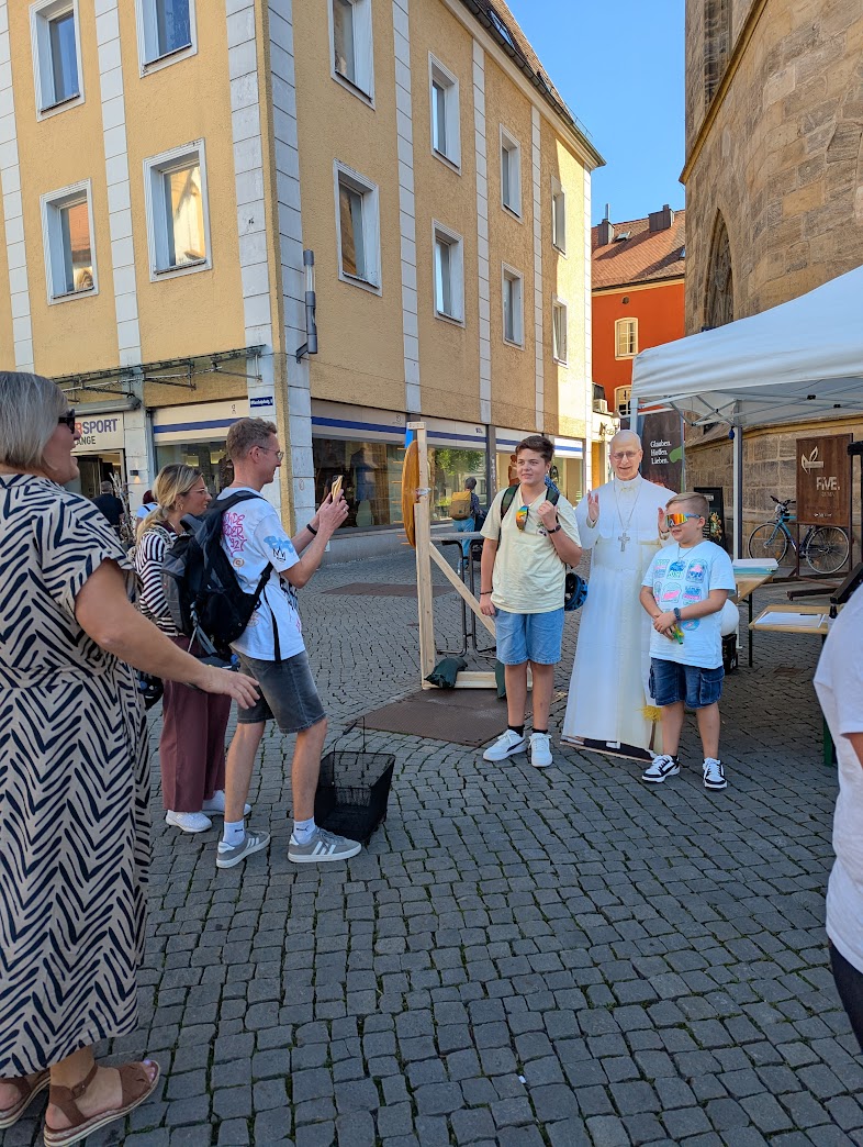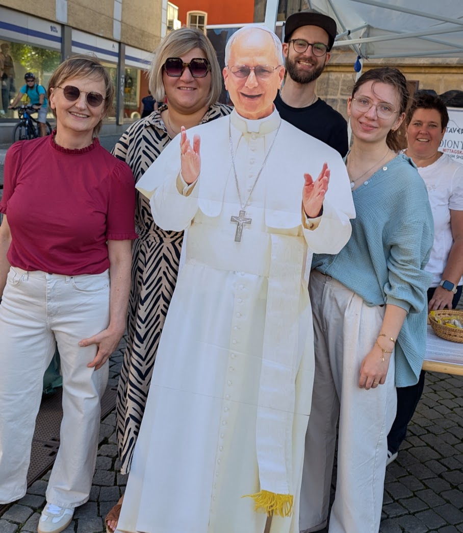 Segenskärtchen sowie ein Freigetränk sorgten für einen unkomplizierten Gesprächseinstieg. Am Glücksrad, das auch von Pastoralpraktikantin Sarah Koch betreut wurde, durfte man Wissens- und Schätzfragen beantworten oder in Aktion treten und z. B. Weihrauchsorten am Geruch erraten. Besonders für Kinder war das Glücksrad ein Magnet, was auch an den kleinen Preisen lag, die man gewinnen konnte. Das „Selfie“-Angebot mit Papst Leo wurde von vielen Passanten gerne angenommen.
