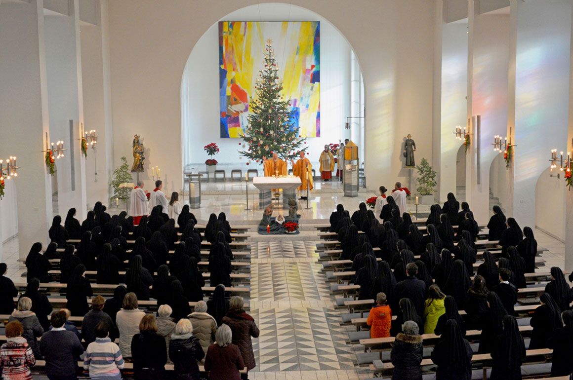 Das Kloster Mallersdorf, Mutterhaus der Armen Franziskanerinnen von der Heiligen Familie seit 1869, konnte am 31. Dezember, dem Fest der Heiligen Familie das Patrozinium der Ordensgemeinschaft feiern. Rund 600 Schwestern überwiegend in Mallersdorf, der Pfalz, Siebenbürger und Südafrika zählen zum Orden. Im weihnachtlichen Festschmuck empfing die Klosterkirche Mallersdorf am Fest der Heiligen Familie ihre Besucher. Nach dem feierlichen Einzug der Geistlichkeit und der Ministranten sprach Superior Prälat Gottfried Dachauer einen herzlichen Willkommensgruß an den Diözesanbischof und dankte ihm, dass er in diesem Jahr dreimal das Kloster Mallersdorf besucht hat. Schön sei es auch, dass dieser Gottesdienst mittels neuer Technik auch zu den Kranken im Schwersternaltenheim Sankt Maria übertragen werde und sich dadurch die Zahl der Mitfeiernden verdopple. Bischof Rudolf Voderholzer blickte an diesem Silvestertag auf die Krippe, die uns zeigt, dass mit diesem Kind die revolutionäre Wende eingetreten ist. Bei der Zeitrechnung gebe es "vor und nach Christi Geburt"; mit diesem Wissen würden wir nun in das Jahr 2018 eintreten. Der Regensburger Oberhirte nutzte die Gelegenheit, im Mutterhaus einen herzlichen Dank für die vielen Dienste an den verschiedenen Plätzen der Welt zu sagen. Gleichzeitig sprach er die Bitte aus, das von Paul Josef Nardini gegründete Werk fortzusetzen.