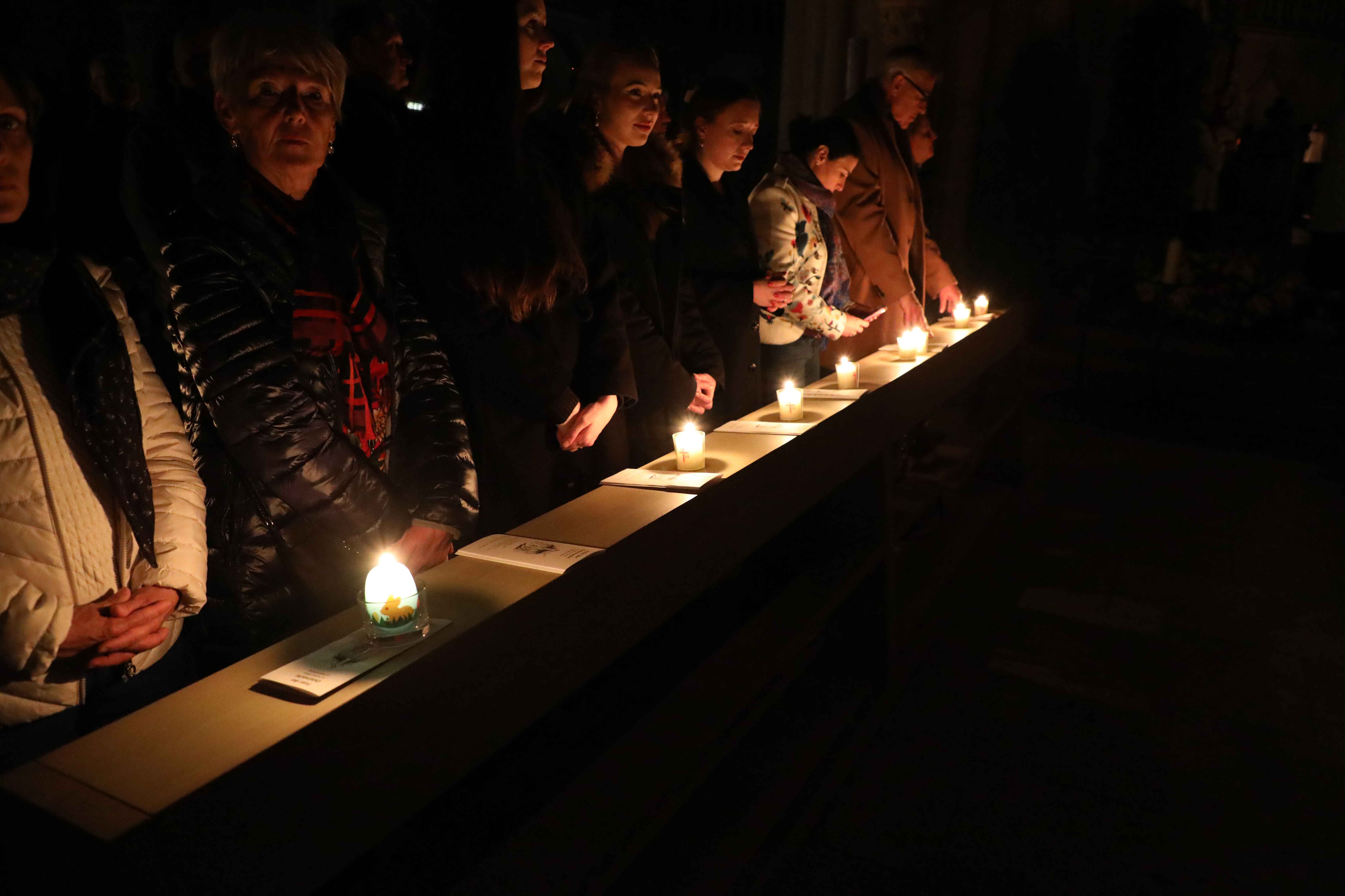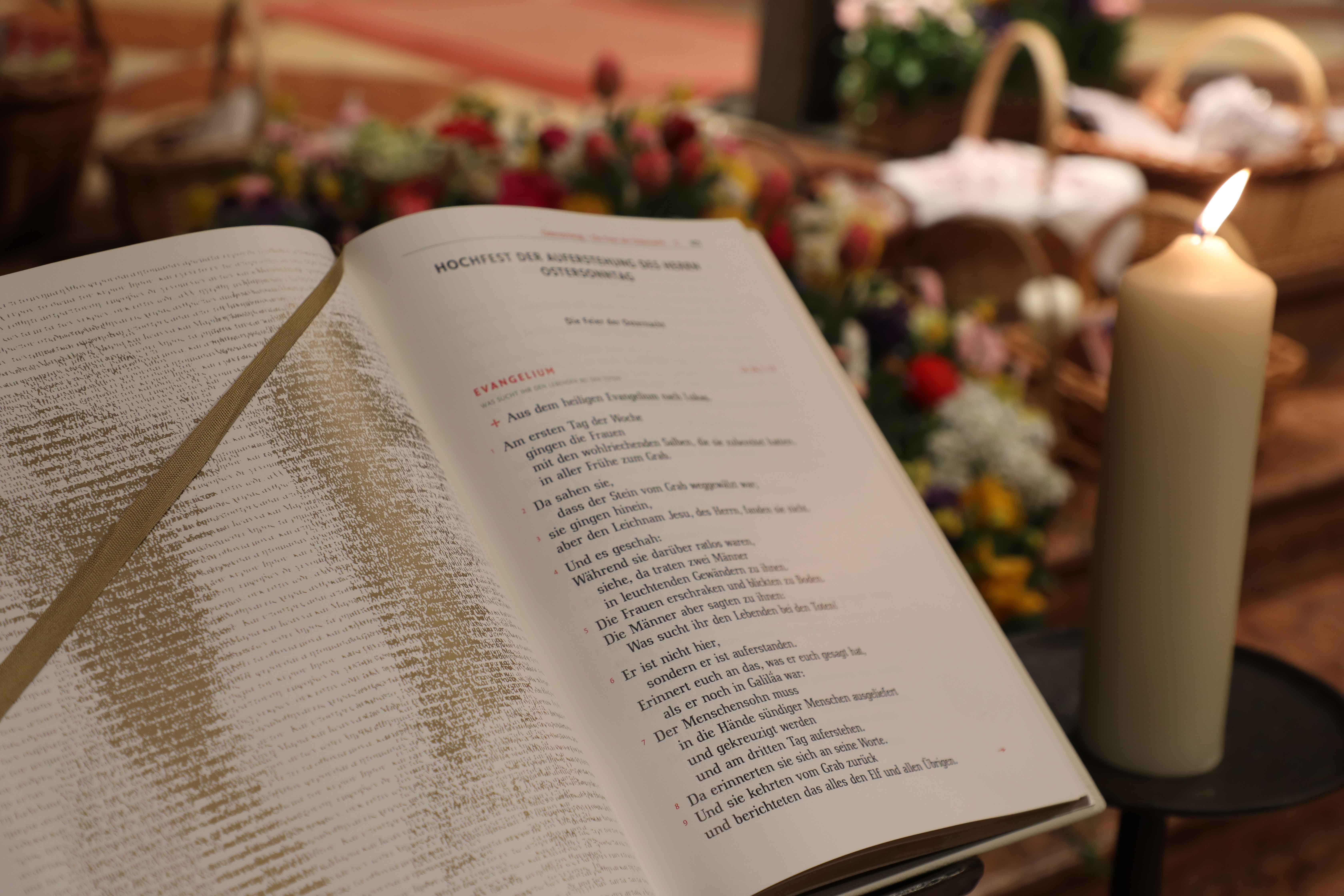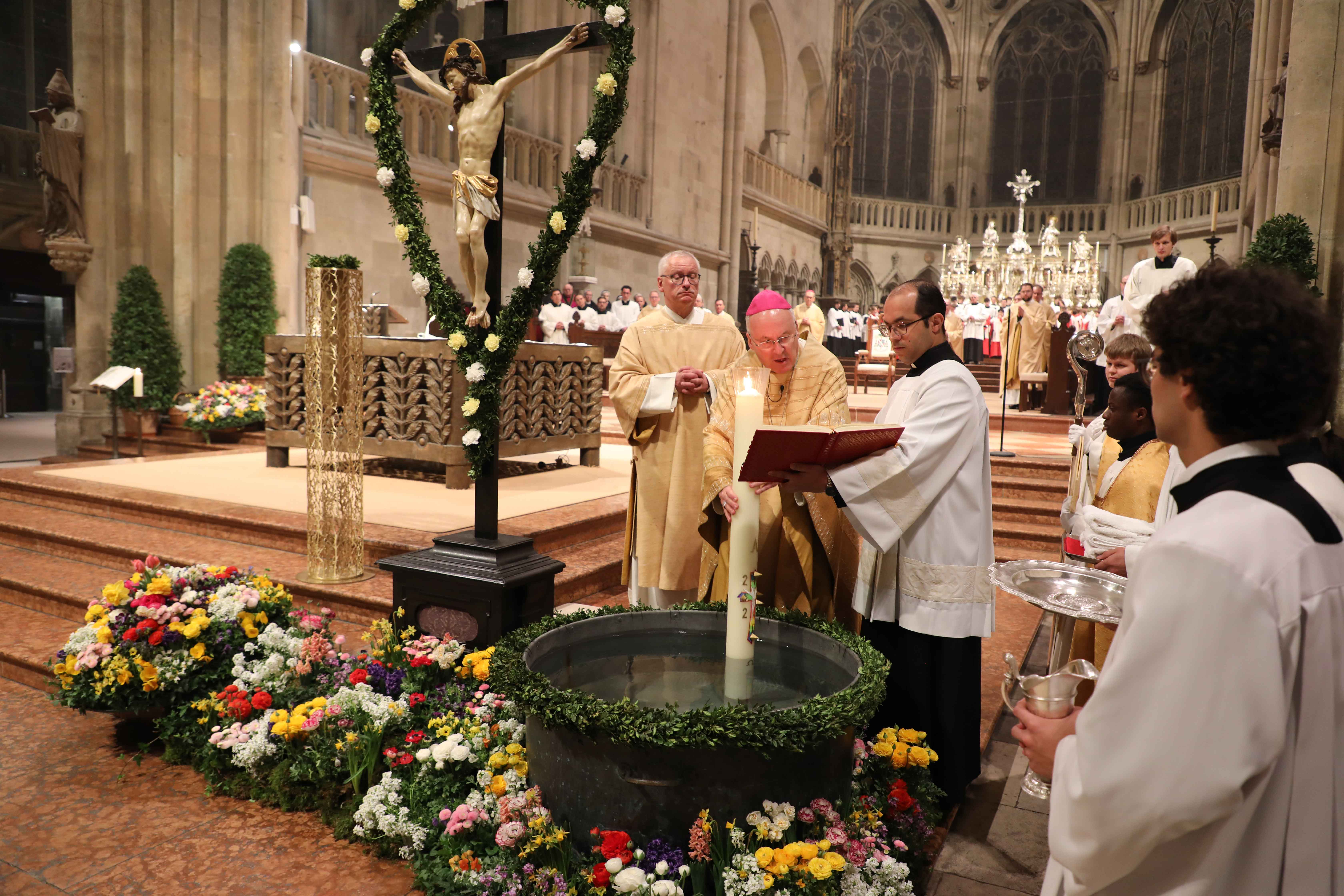 Nach dem feierlichen Lob der Osterkerze („Exsultet“) folgten die Lesungen aus dem Alten Testament, die im Licht Christi gelesen auf das Osterereignis vorausverweisen. Nachdem zum Gloria alle Lichter entzündet wurden und der Klang der Glocken und der Orgel zurückgekehrt waren, wurde im Wortgottesdienst die Osterbotschaft des Neuen Testaments verkündet, das Evangelium von der Auferstehung, die im Sakrament der Taufe für uns alle Gegenwart wird.