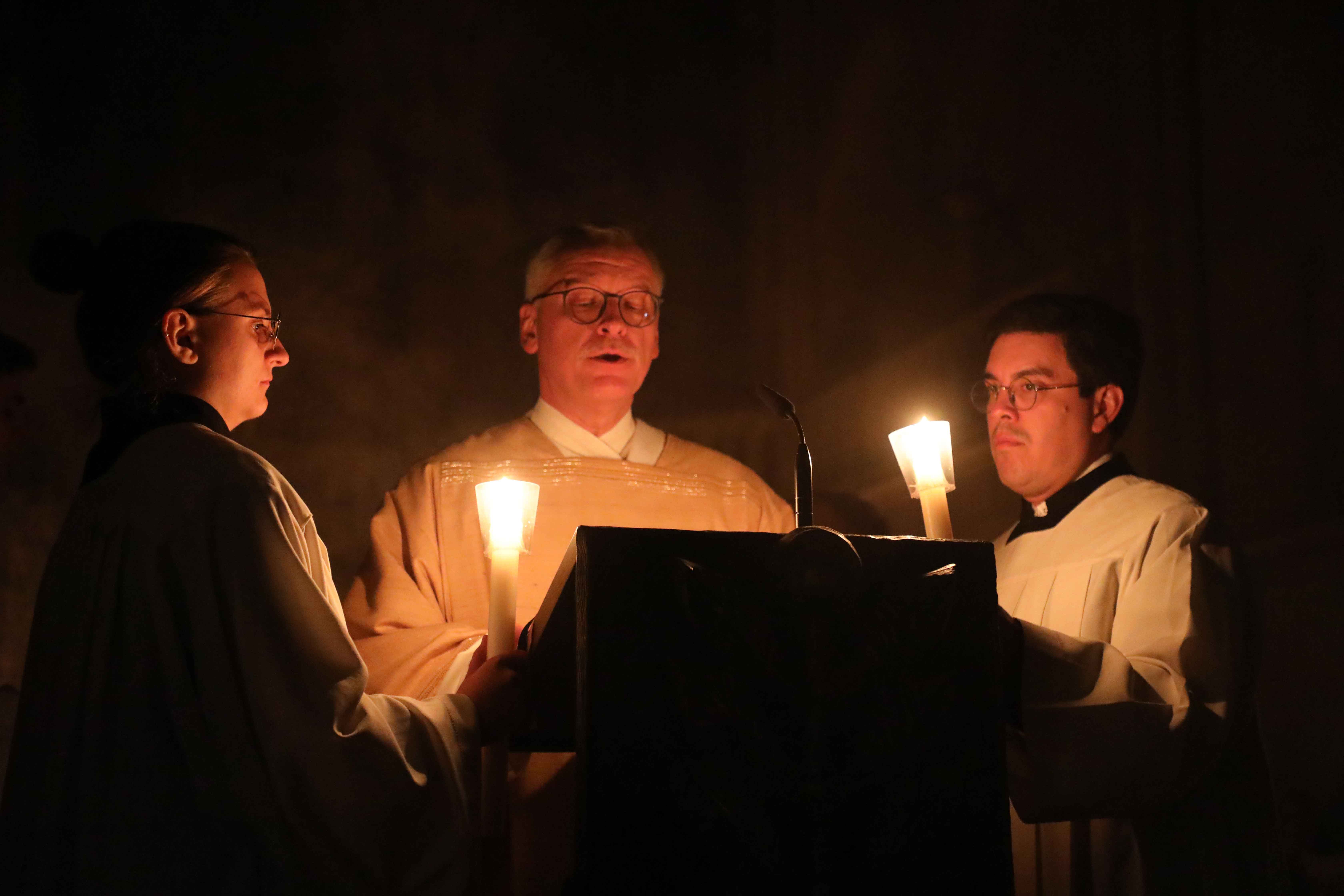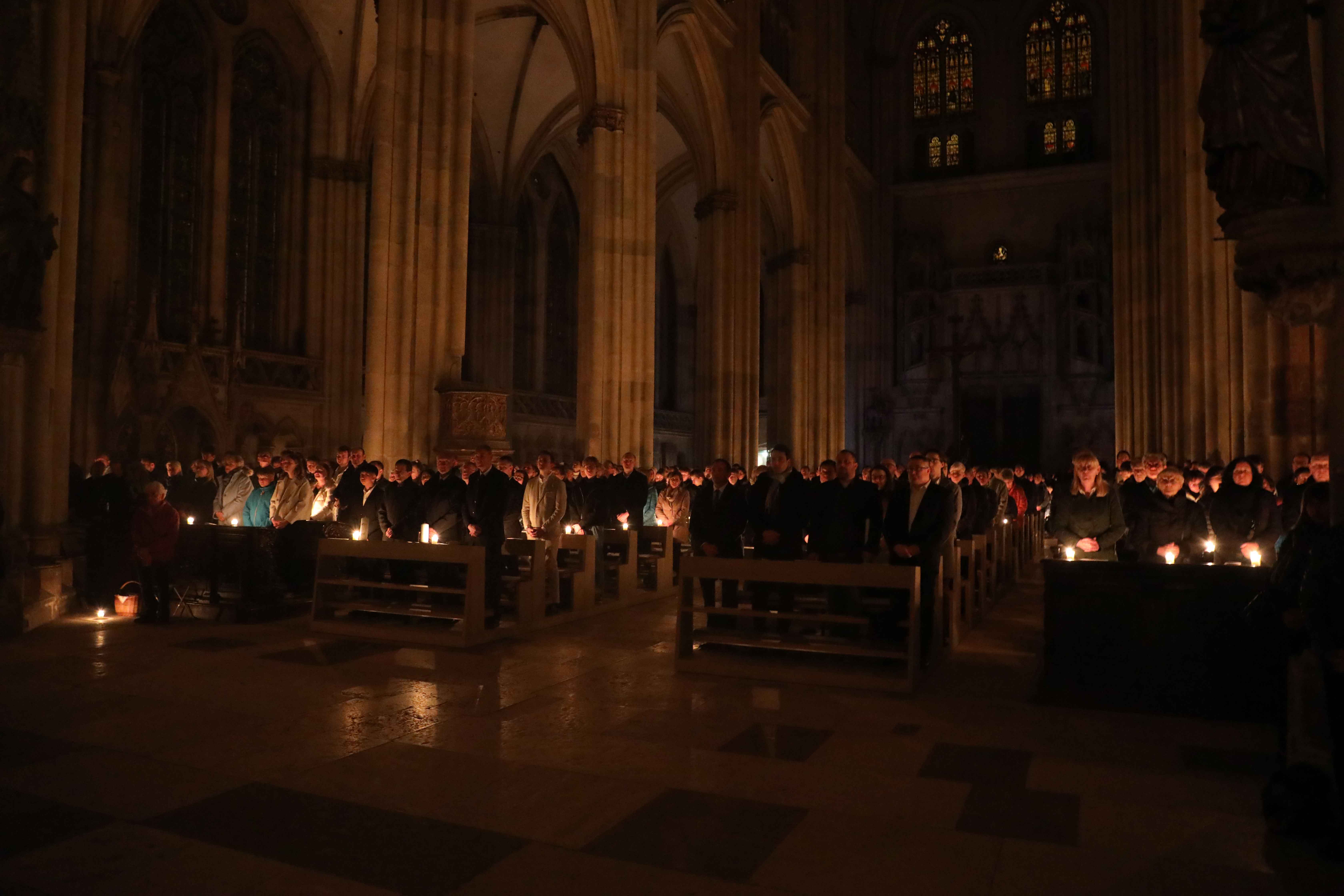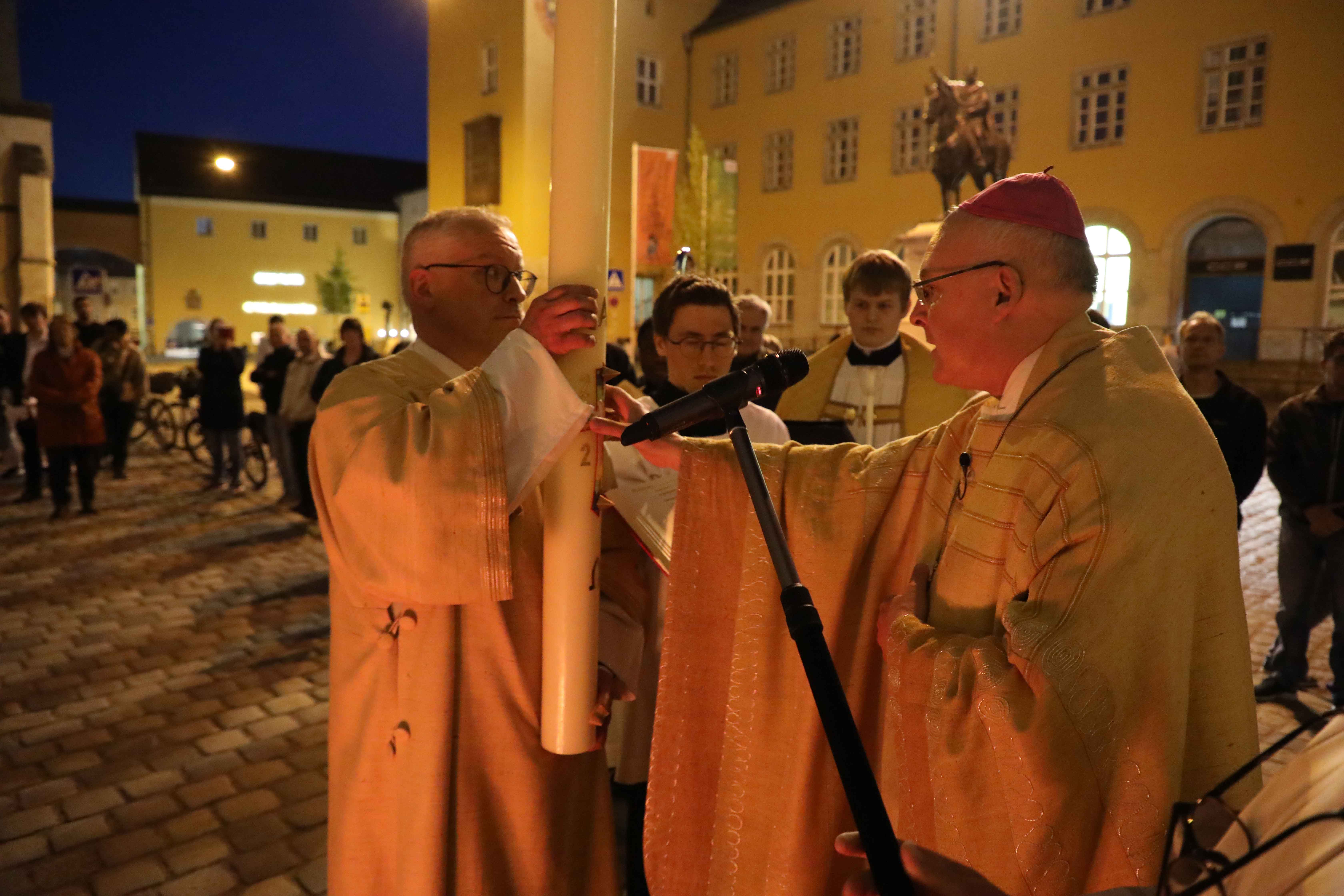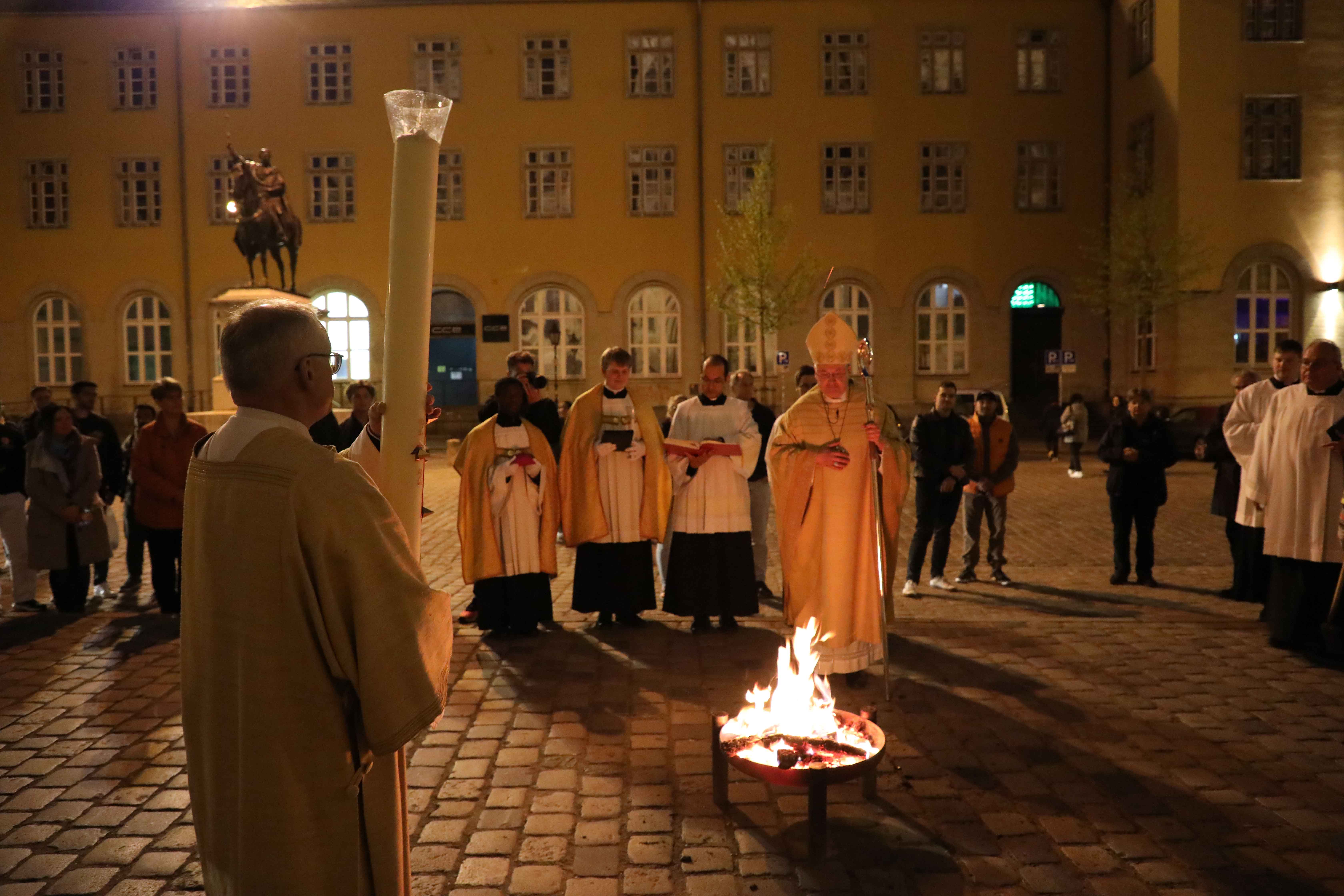 Die Osternacht begann nach Sonnenuntergang mit dem Entzünden des Osterfeuers auf der Südseite des Doms. An dessen Glut wurde die große Osterkerze entzündet und in einer stillen Prozession in den dunklen Dom getragen. Mit dem dreifachen Ruf „Lumen Christi“ verkündete der Diakon das Licht Christi, das anschließend unter den Gläubigen weitergegeben wurde – ein symbolträchtiges Ritual, das den Kirchenraum allein durch den Schein der Kerzen in warmes Licht tauchte.