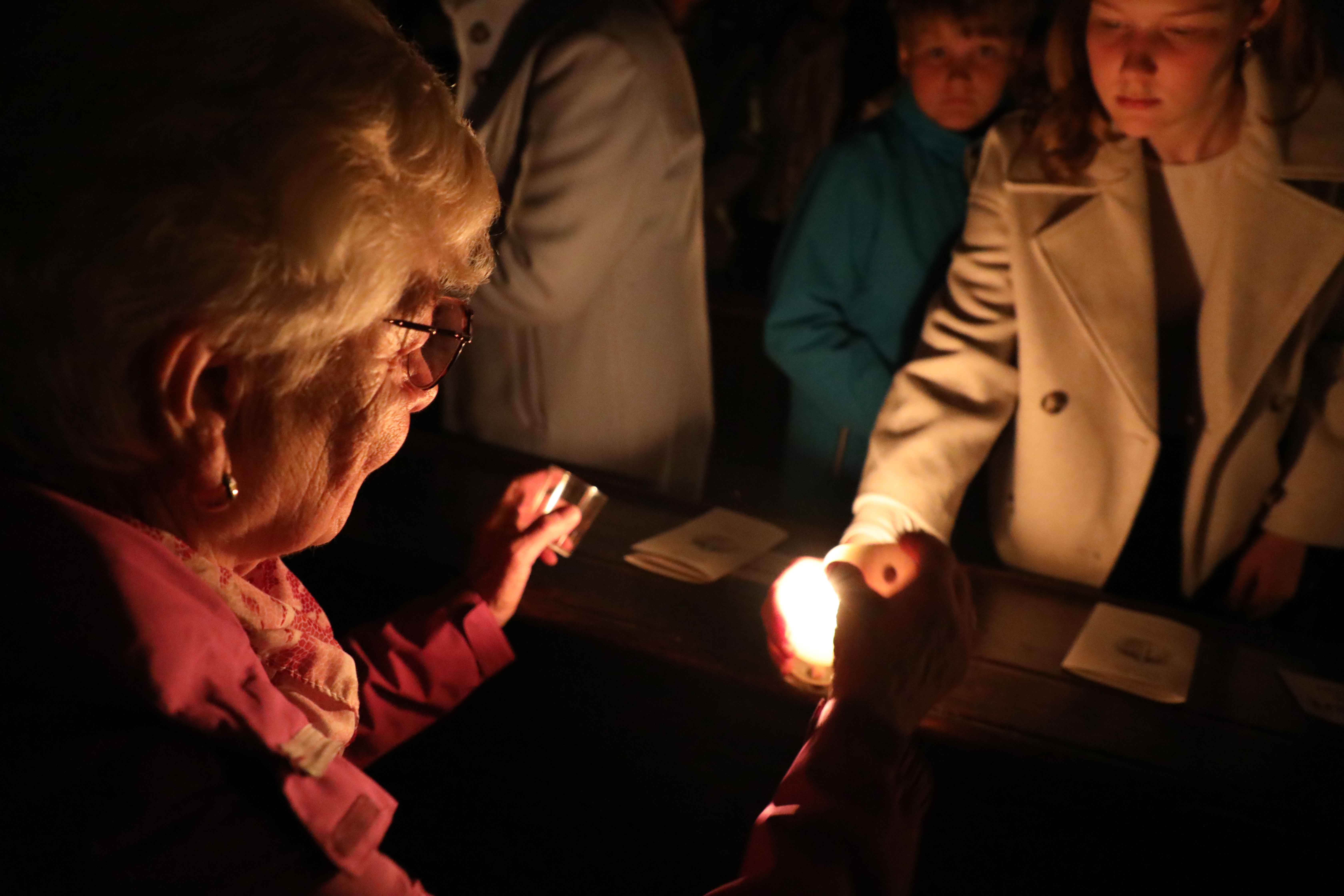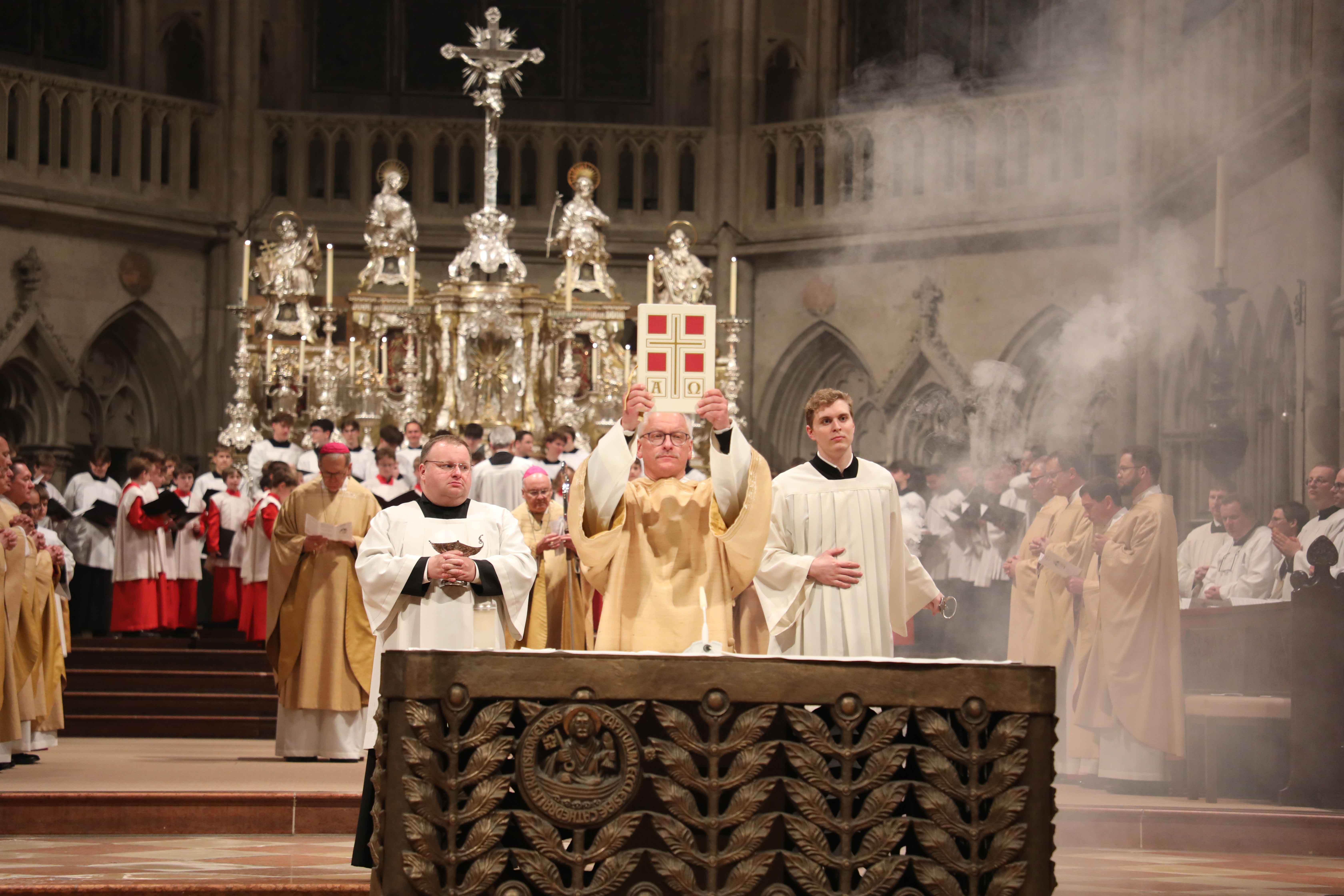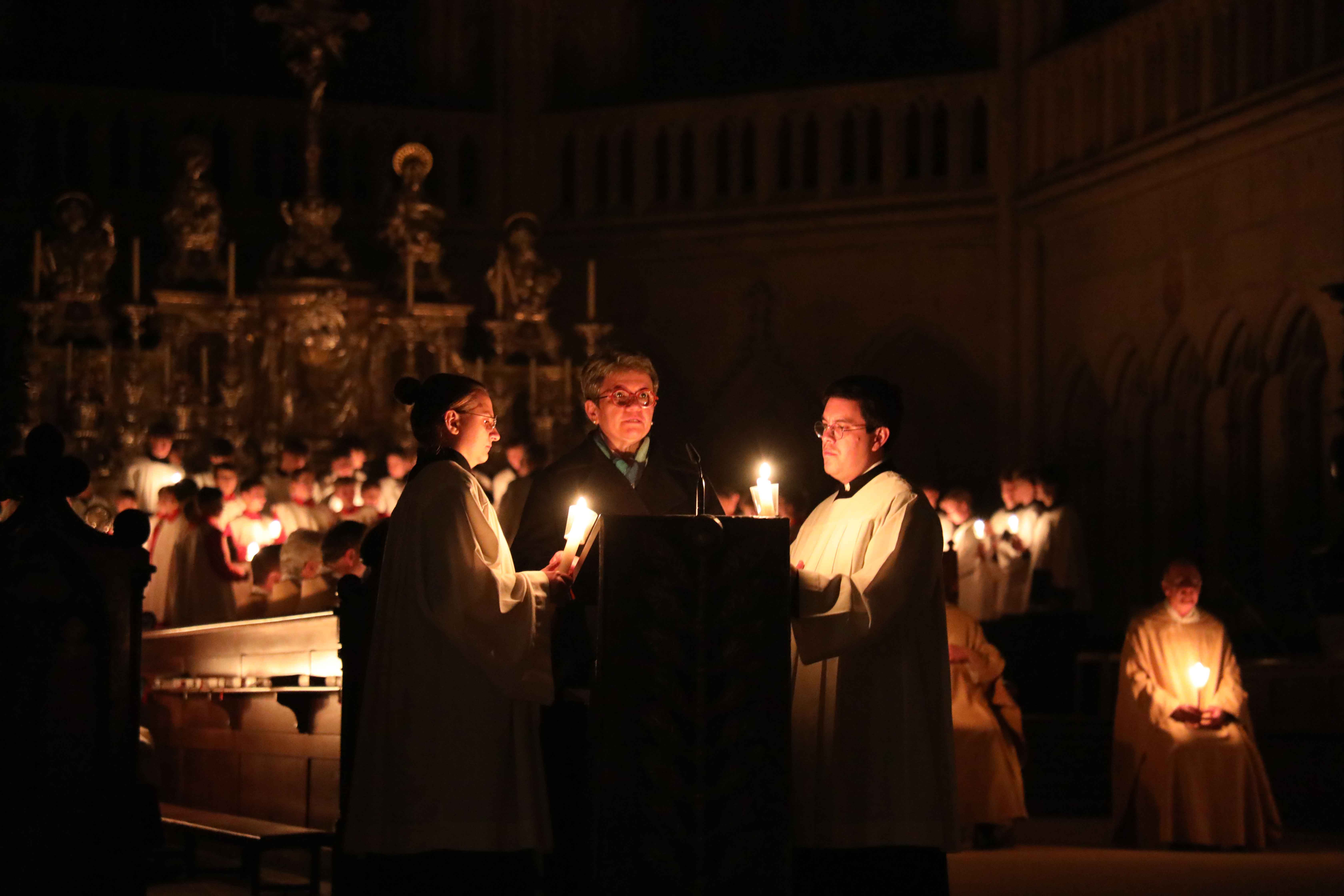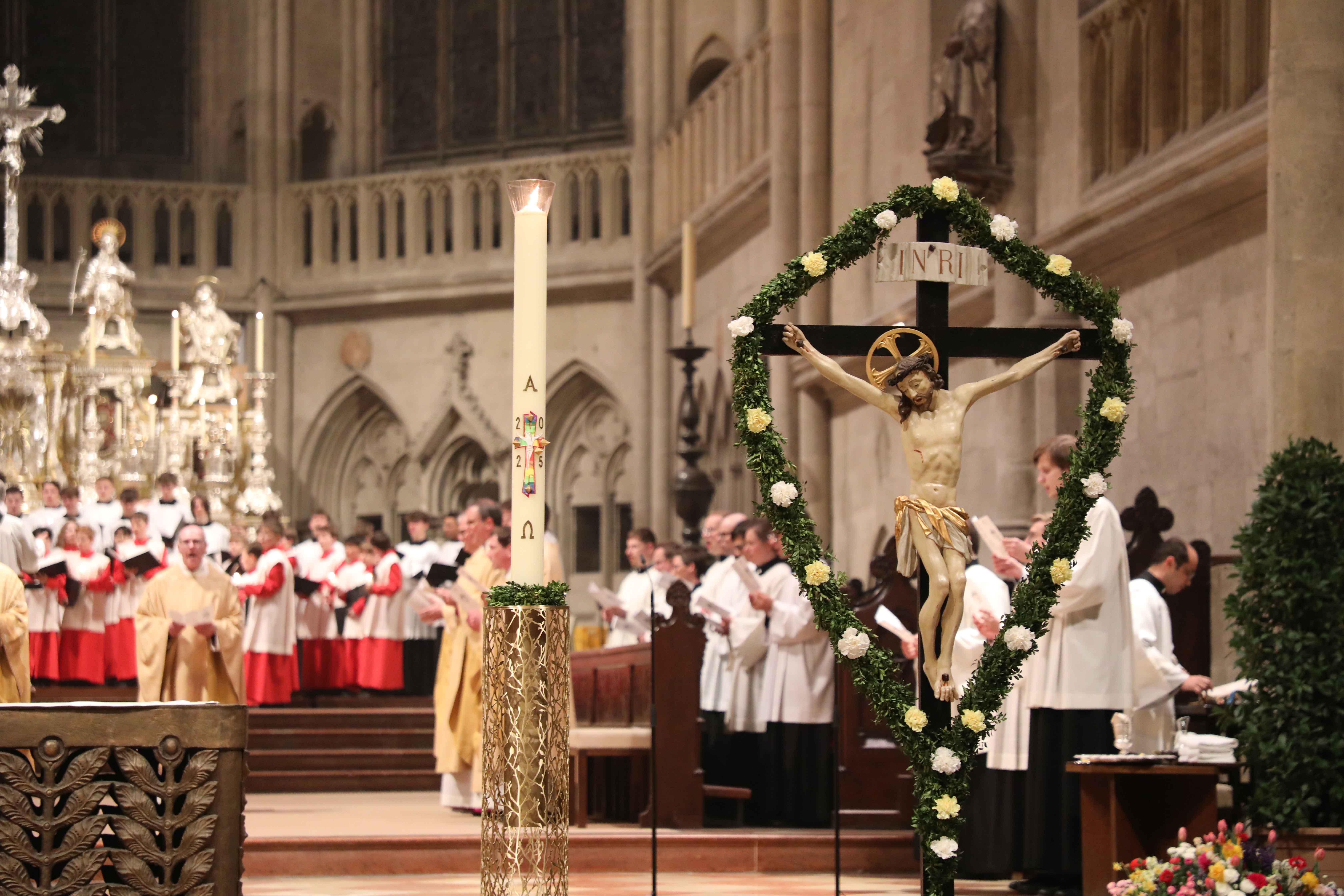 Die Osternacht begann nach Sonnenuntergang mit dem Entzünden des Osterfeuers auf der Südseite des Doms. An dessen Glut wurde die große Osterkerze entzündet und in einer stillen Prozession in den dunklen Dom getragen. Mit dem dreifachen Ruf „Lumen Christi“ verkündete der Diakon das Licht Christi, das anschließend unter den Gläubigen weitergegeben wurde – ein symbolträchtiges Ritual, das den Kirchenraum allein durch den Schein der Kerzen in warmes Licht tauchte.