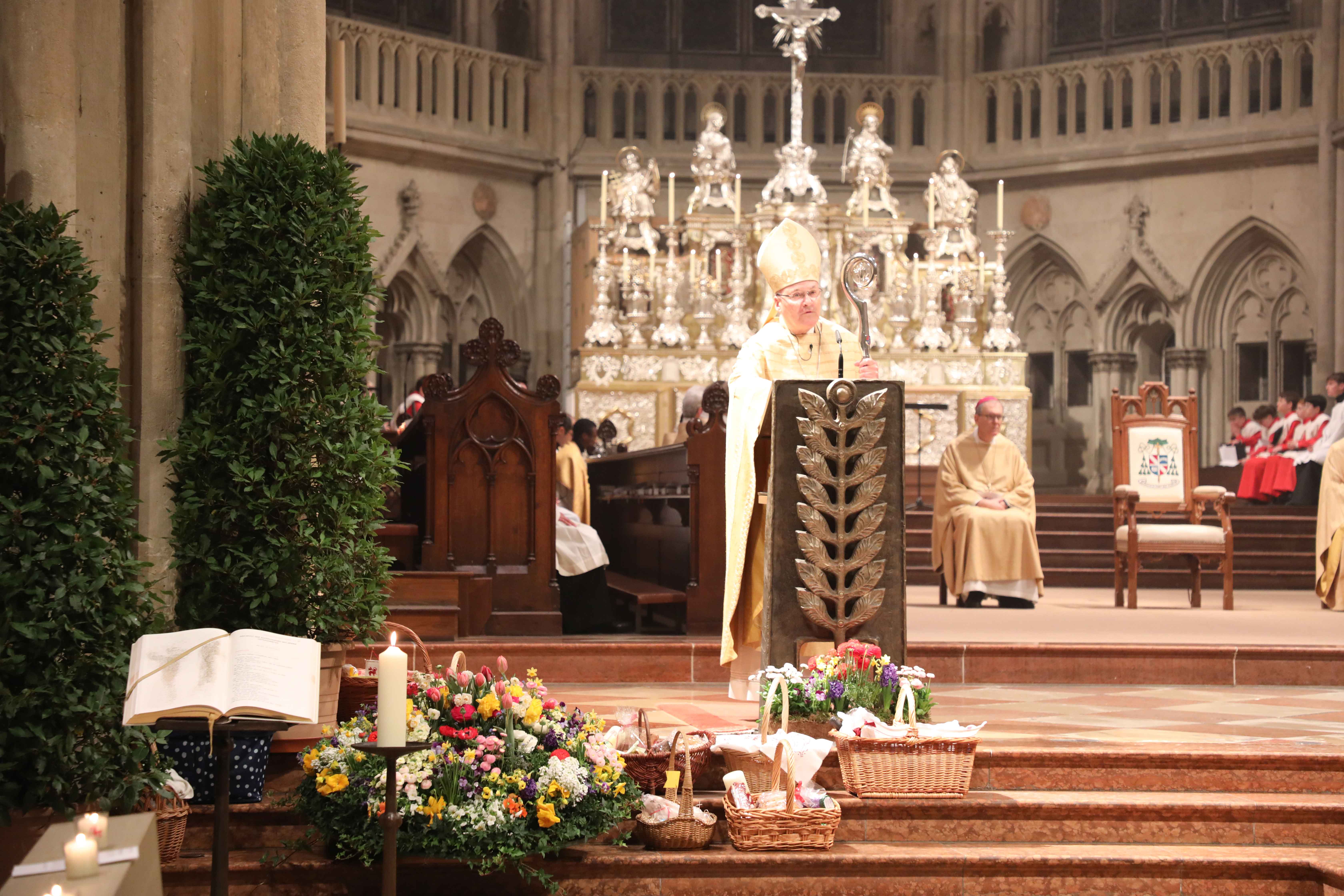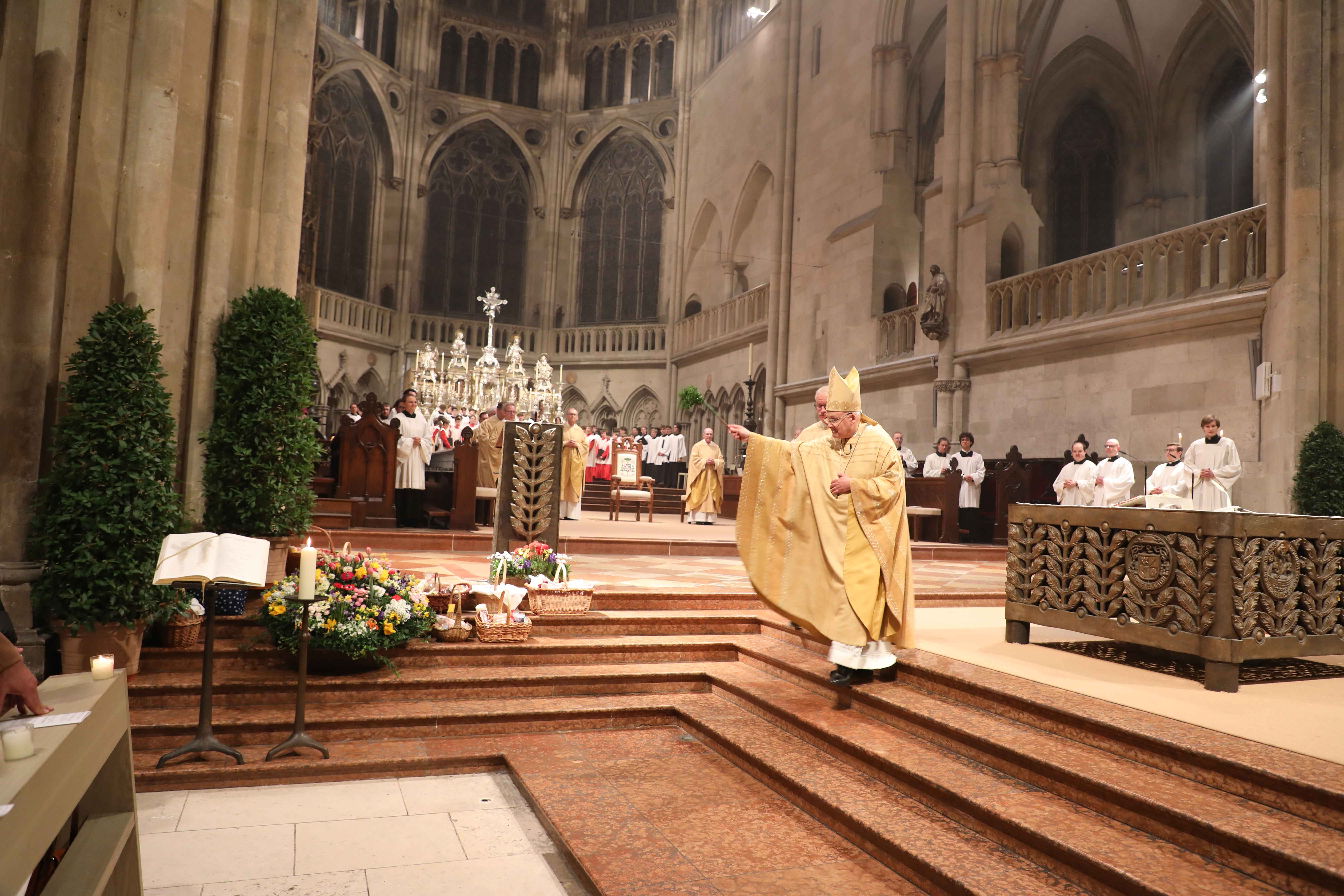 Zum Abschluss der Osternachtsfeier spendete Bischof Rudolf Voderholzer – nach alter Tradition – noch den Speisesegen für die mitgebrachten Osterspeisen, die in verzierten Körben vor den Stufen des Altares und auf den Bänken der Kathedrale aufgestellt wurden.