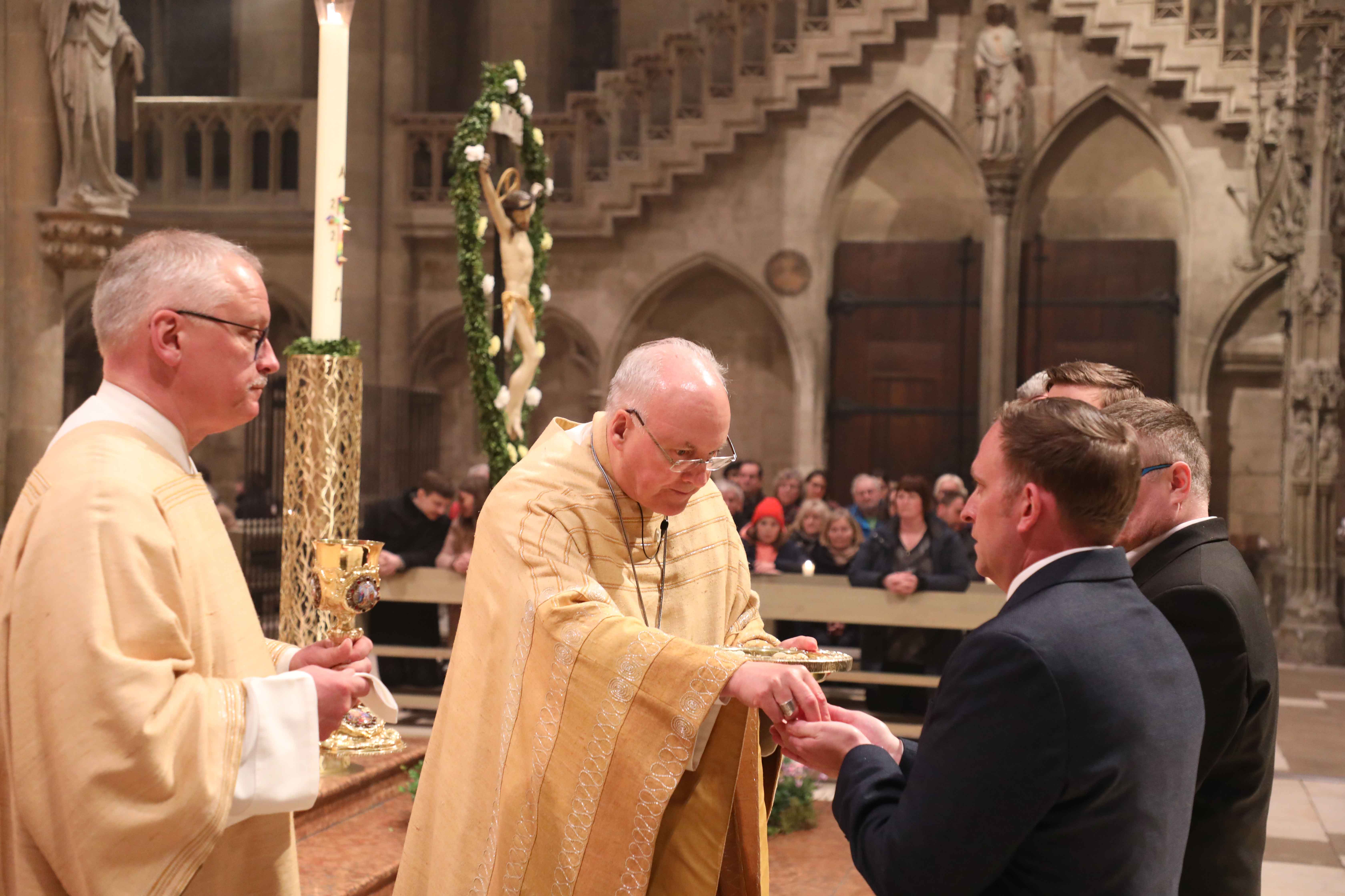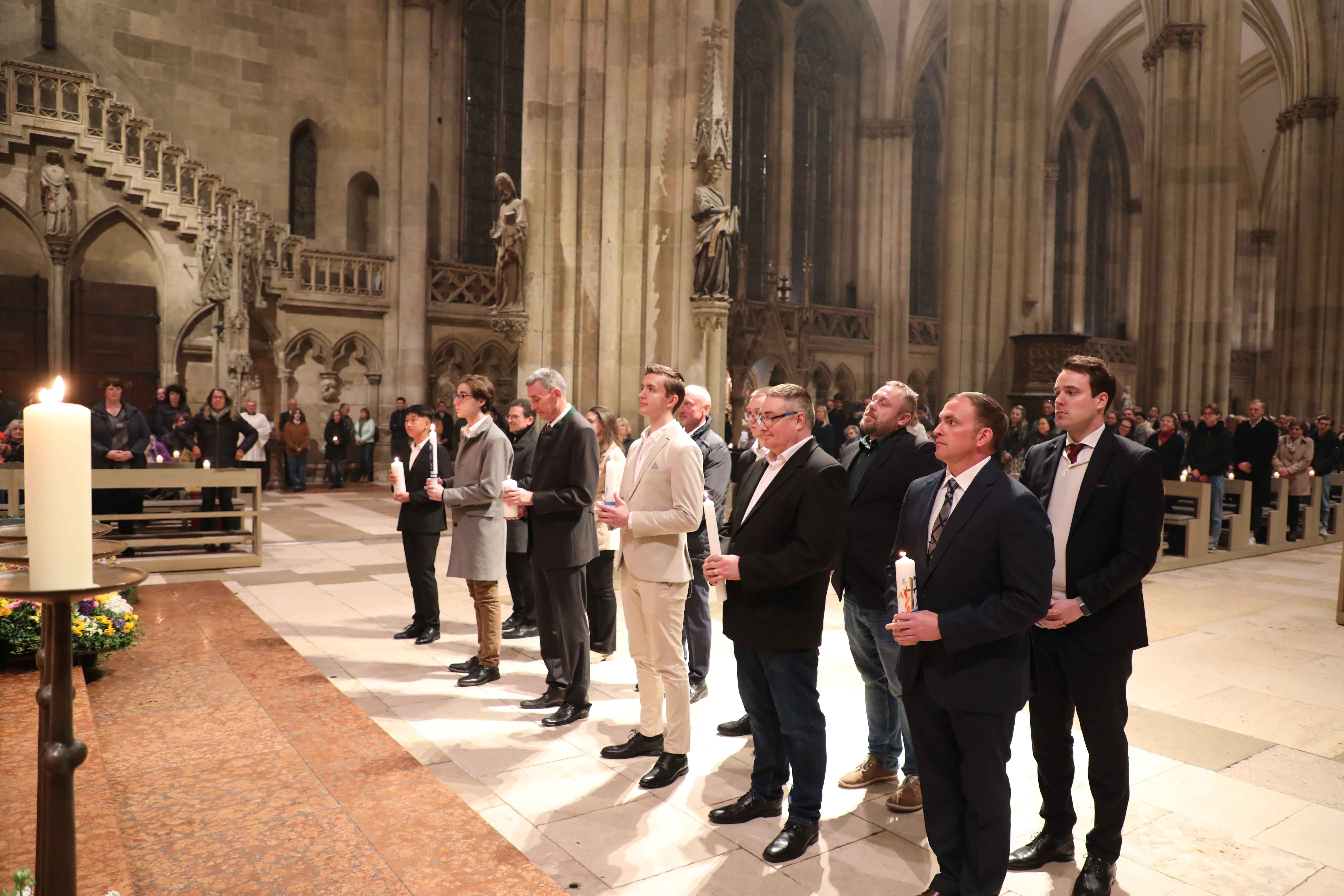 Der Regensburger Oberhirte freute sich, die erwachsenen Taufbewerber mit dem gesegneten Osterwasser hinein in die Lebensfülle des dreifaltigen Gottes taufen zu dürfen und mit dem frischen Chrisam – geweiht in der Chrisammesse am Montag der Karwoche – zu salben. Zum Abschluss der Predigt bedankte er sich bei den sechs Taufbewerbern und ihren Wegbereiterinnen und Wegbereitern. Viele Menschen haben im Vorfeld dieser Taufe für die Bewerber – die Katechumenen – gebetet. Jetzt wünschte ihnen Bischof Rudolf, dass die Taufgnade kräftig in ihnen wirken möge, um sie zu lebendigen Zeugen seiner Auferstehung werden zu lassen.