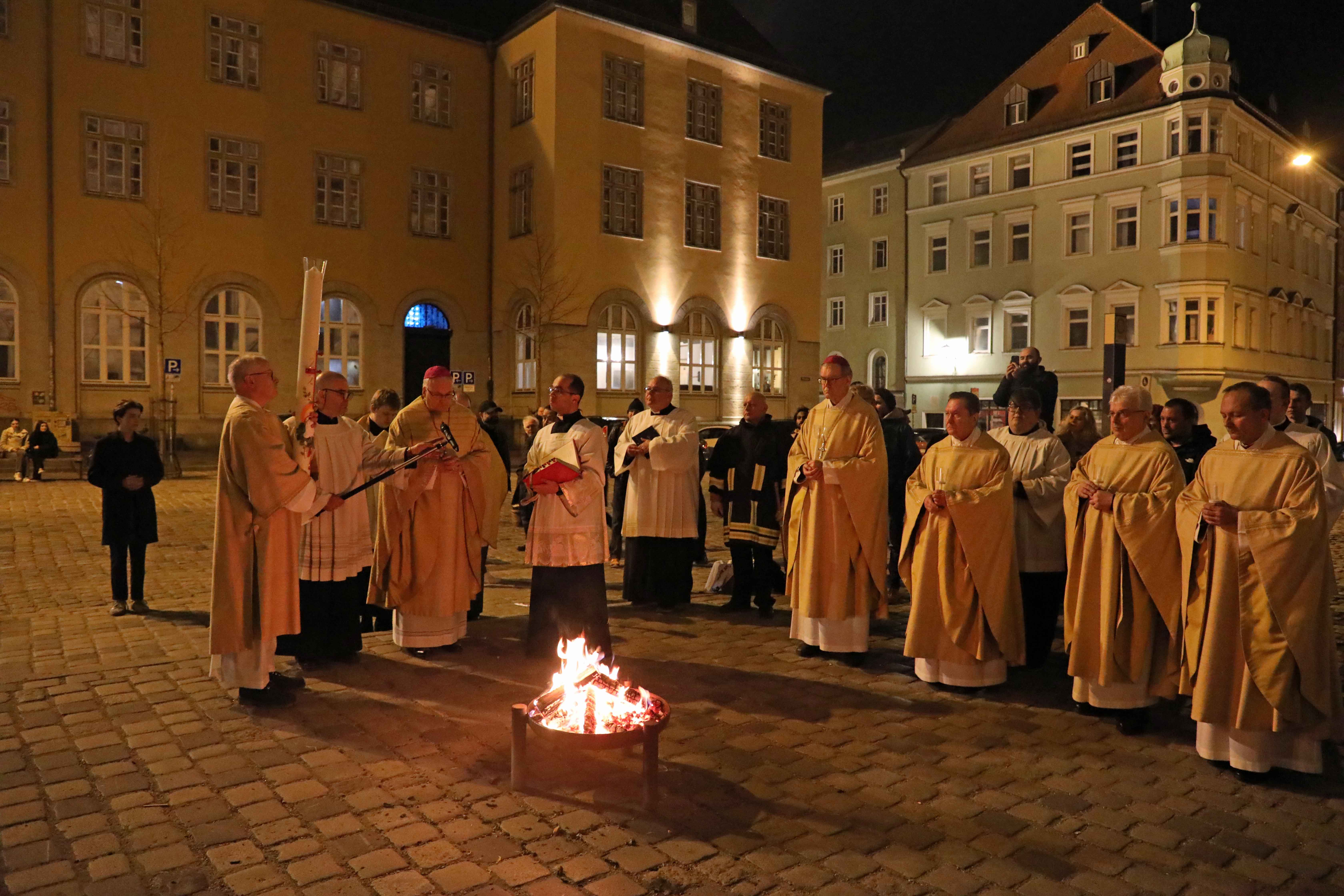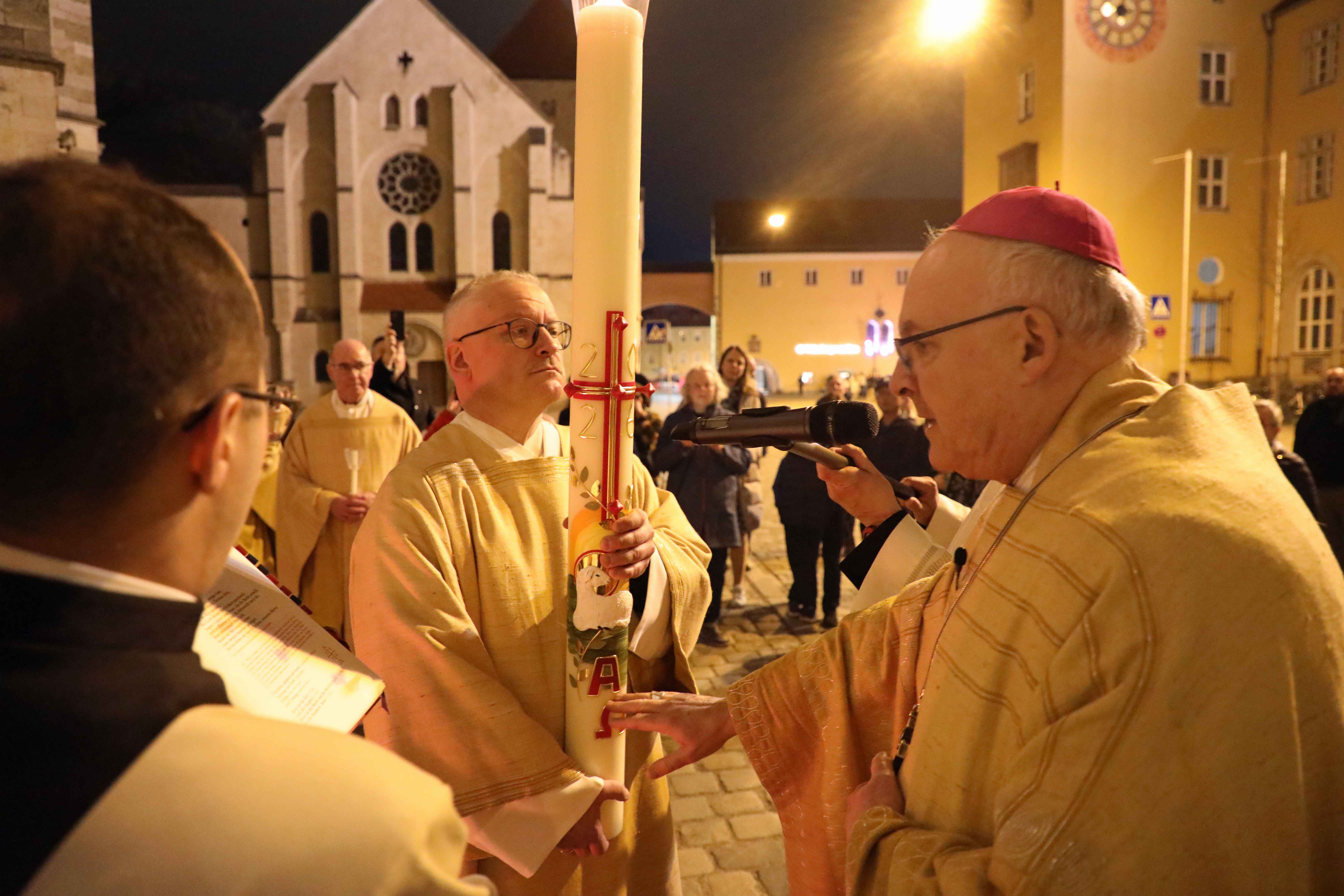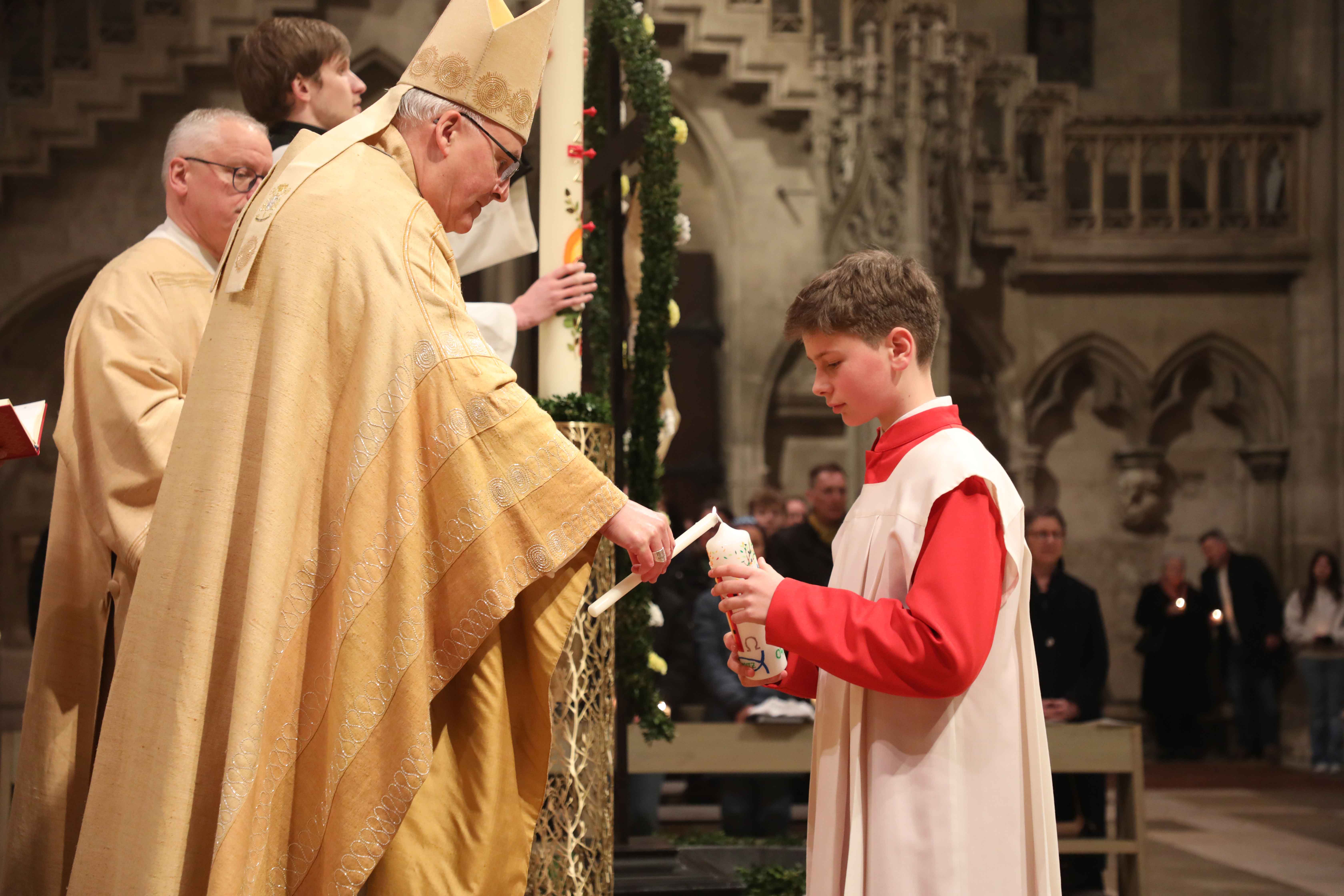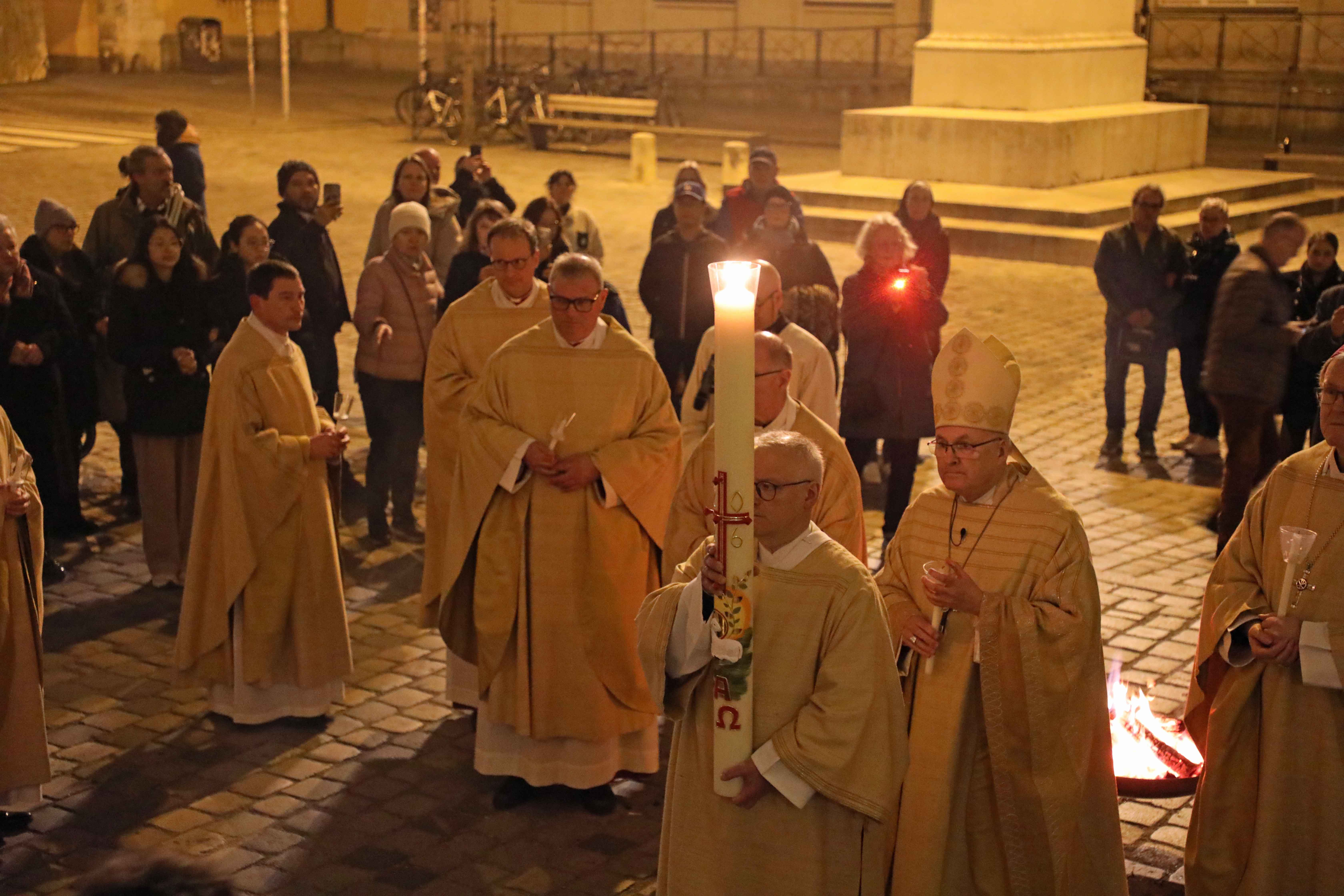 Die Osternacht begann nach Sonnenuntergang mit dem Entzünden des Osterfeuers auf der Südseite des Doms. An dessen Glut wurde die große Osterkerze entzündet und in einer stillen Prozession in den dunklen Dom getragen. Mit dem dreifachen Ruf „Lumen Christi“ verkündete der Diakon das Licht Christi, das anschließend unter den Gläubigen weitergegeben wurde – ein symbolträchtiges Ritual, das den Kirchenraum allein durch den Schein der Kerzen in warmes Licht tauchte.