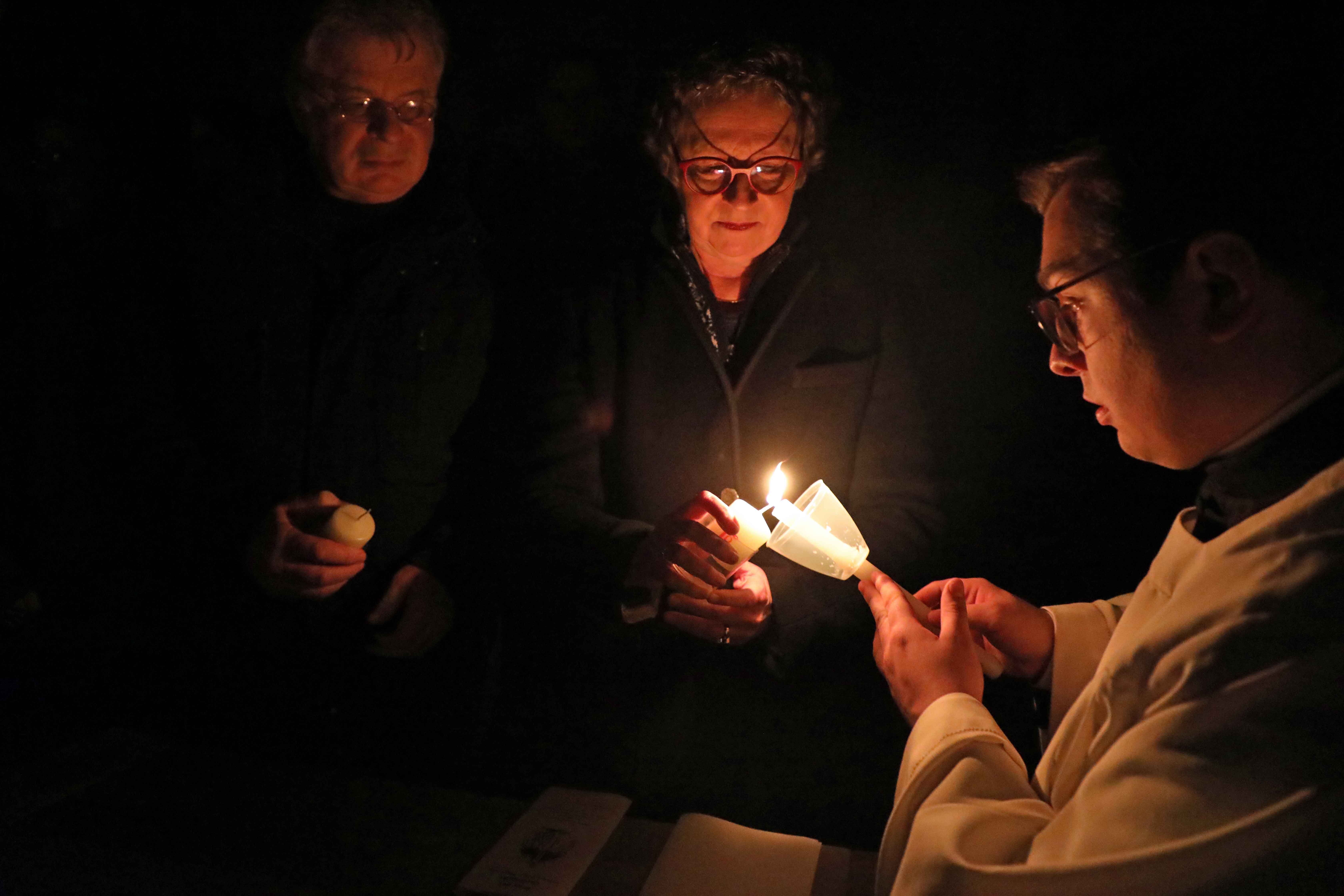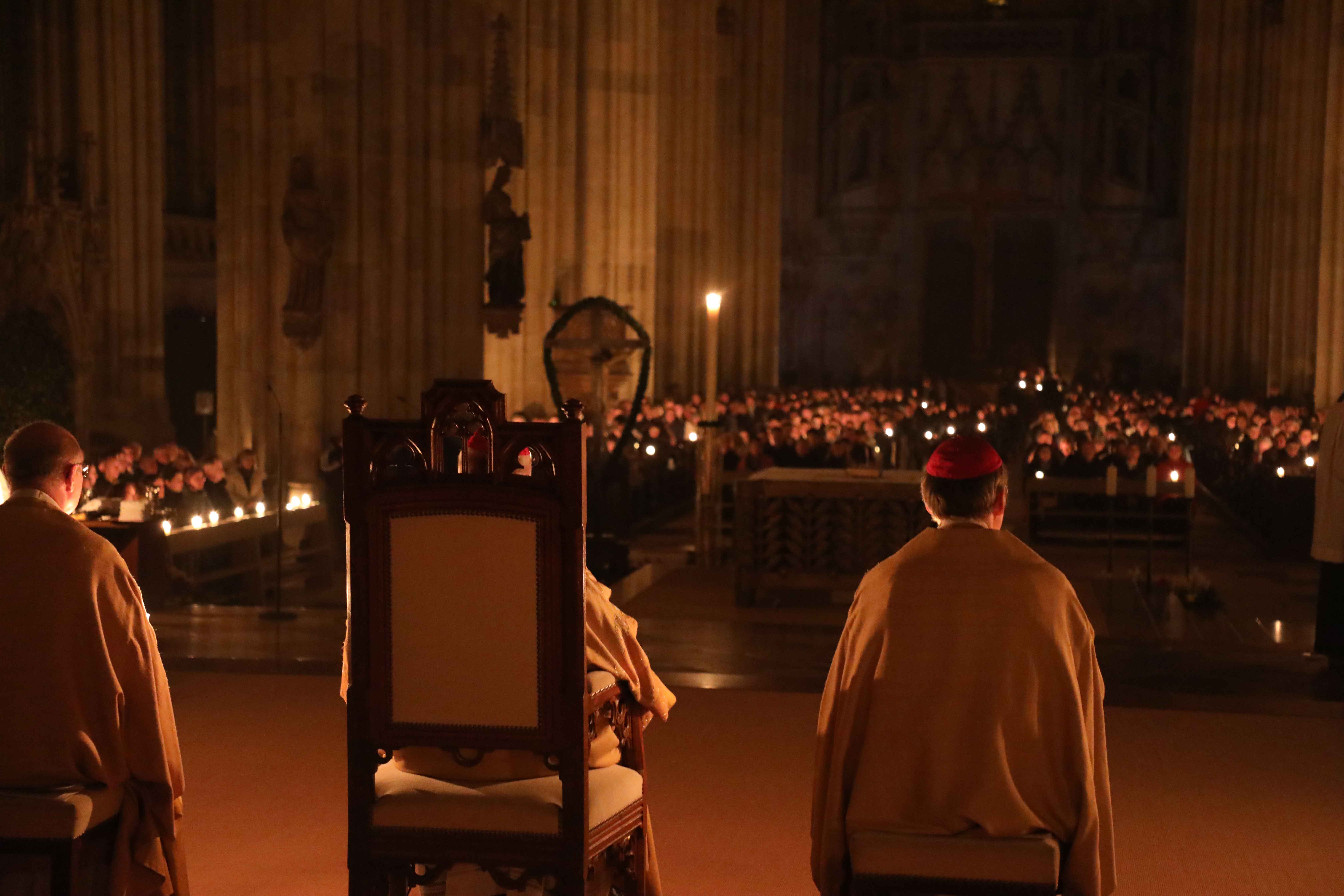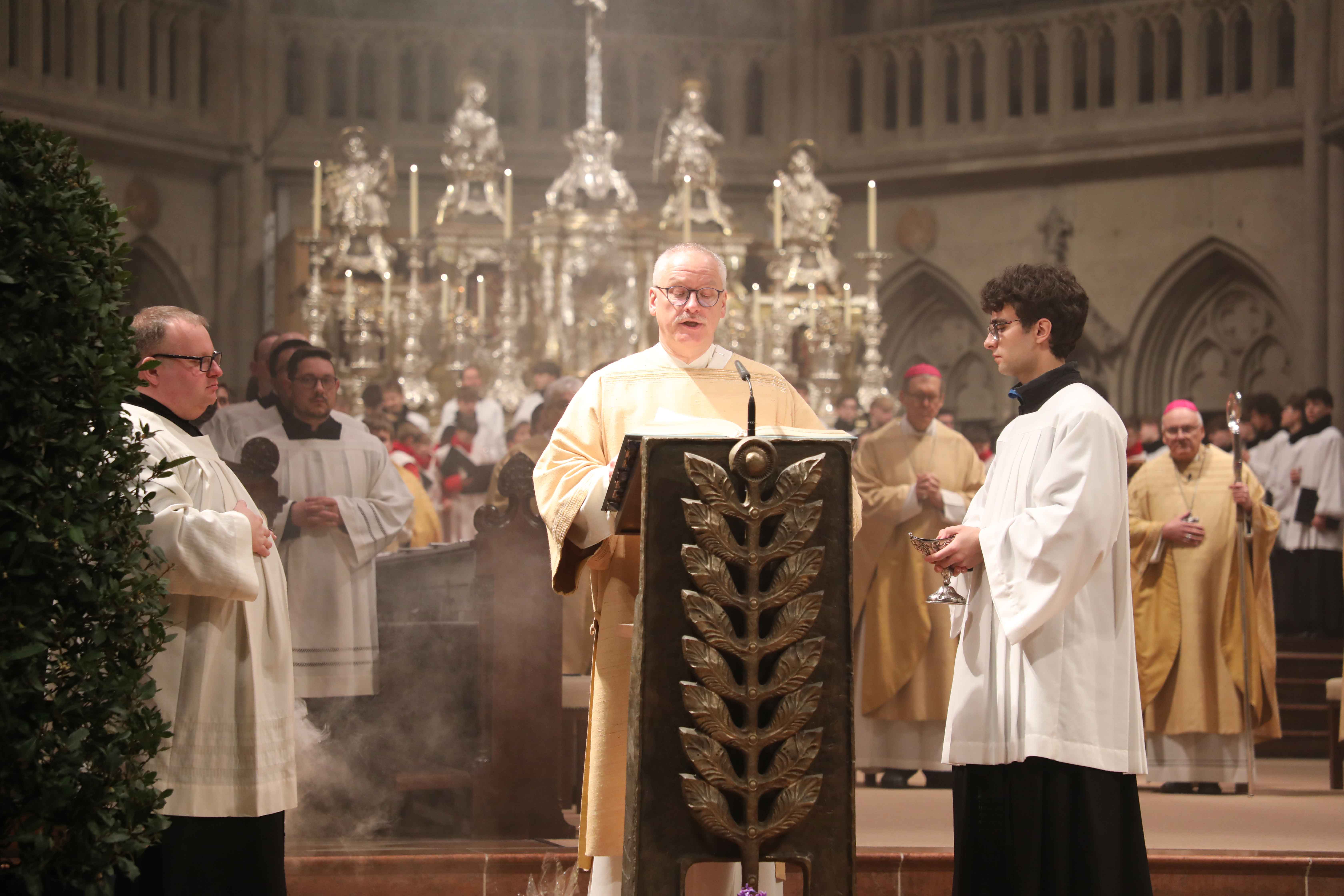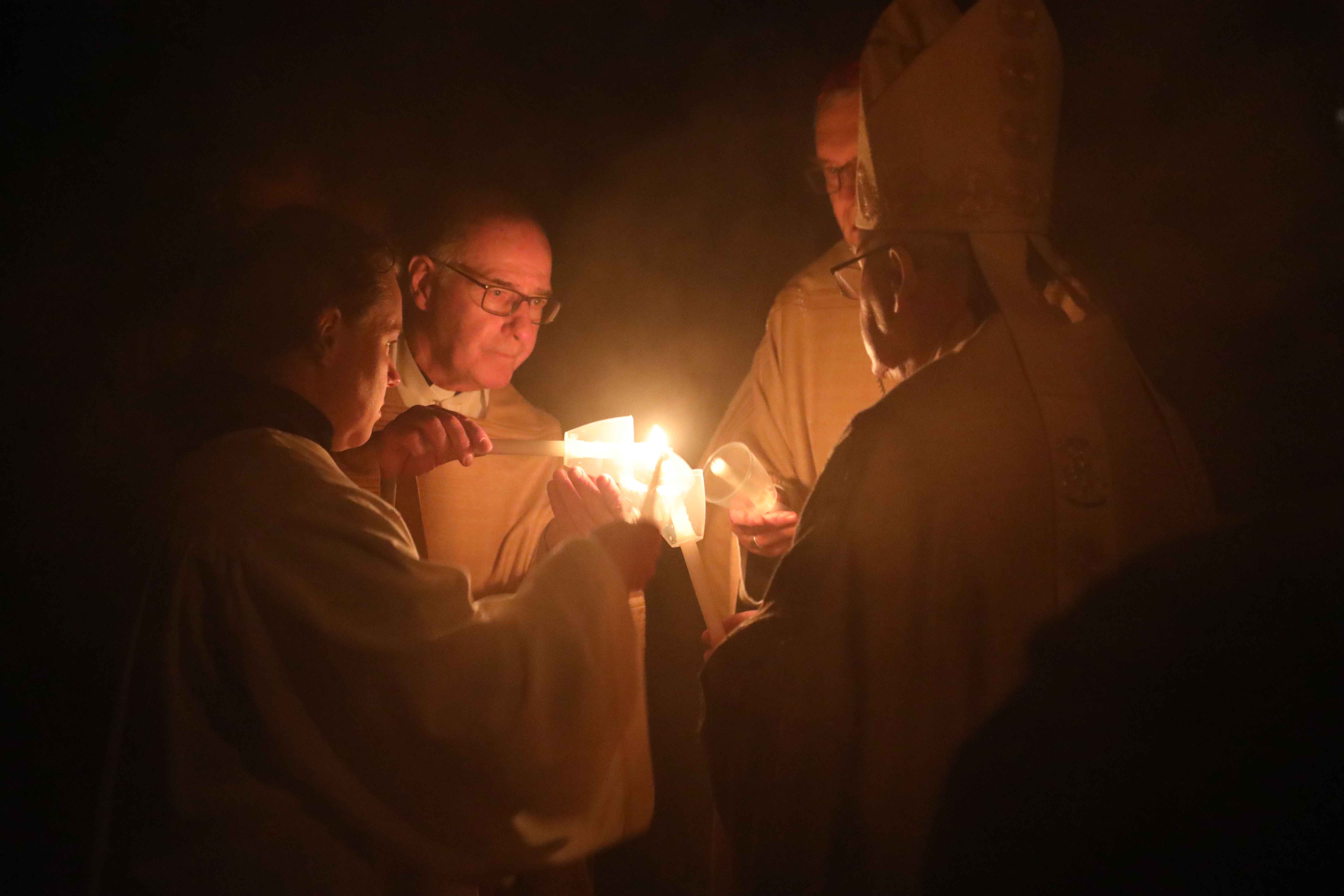 Die Osternacht begann nach Sonnenuntergang mit dem Entzünden des Osterfeuers auf der Südseite des Doms. An dessen Glut wurde die große Osterkerze entzündet und in einer stillen Prozession in den dunklen Dom getragen. Mit dem dreifachen Ruf „Lumen Christi“ verkündete der Diakon das Licht Christi, das anschließend unter den Gläubigen weitergegeben wurde – ein symbolträchtiges Ritual, das den Kirchenraum allein durch den Schein der Kerzen in warmes Licht tauchte.