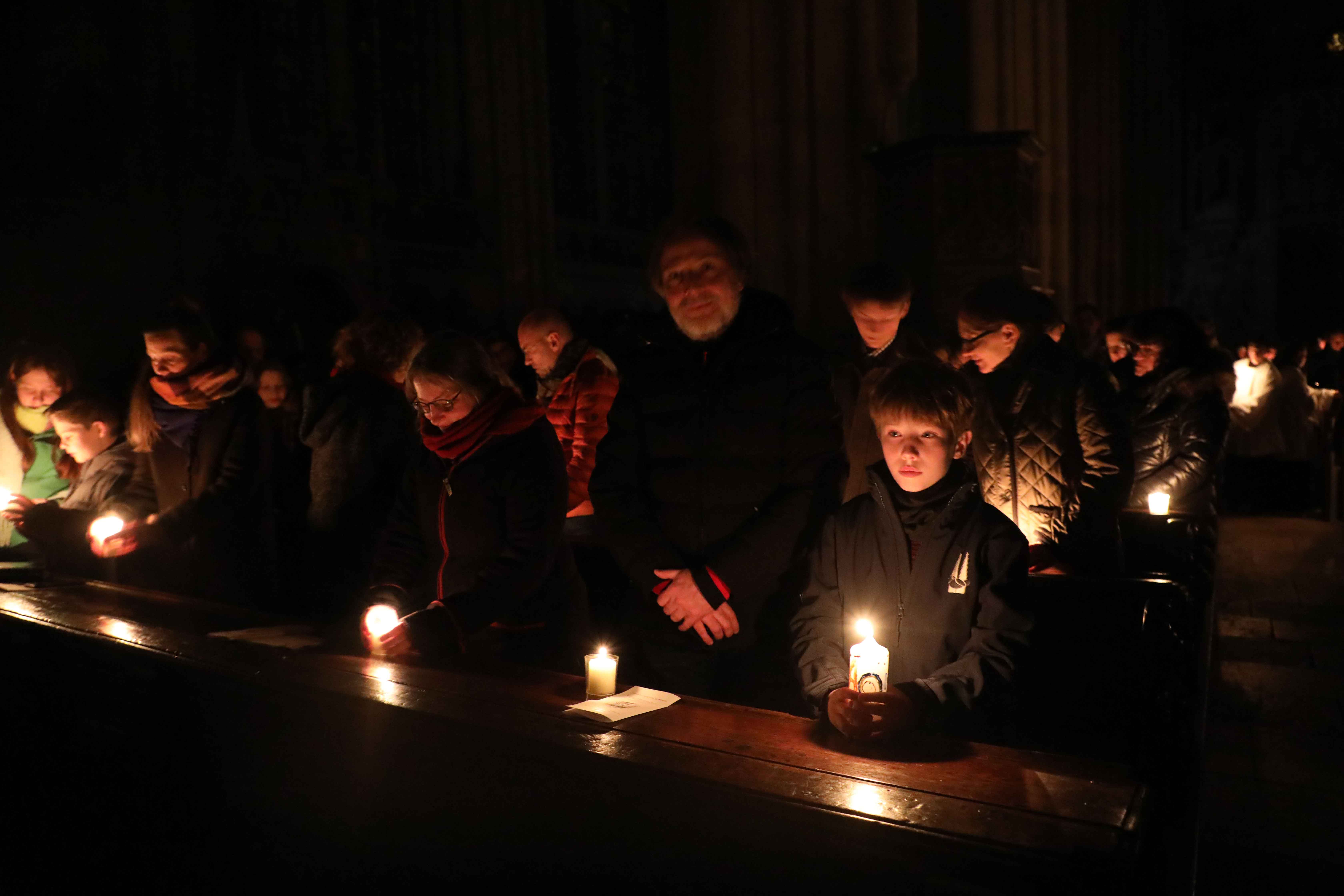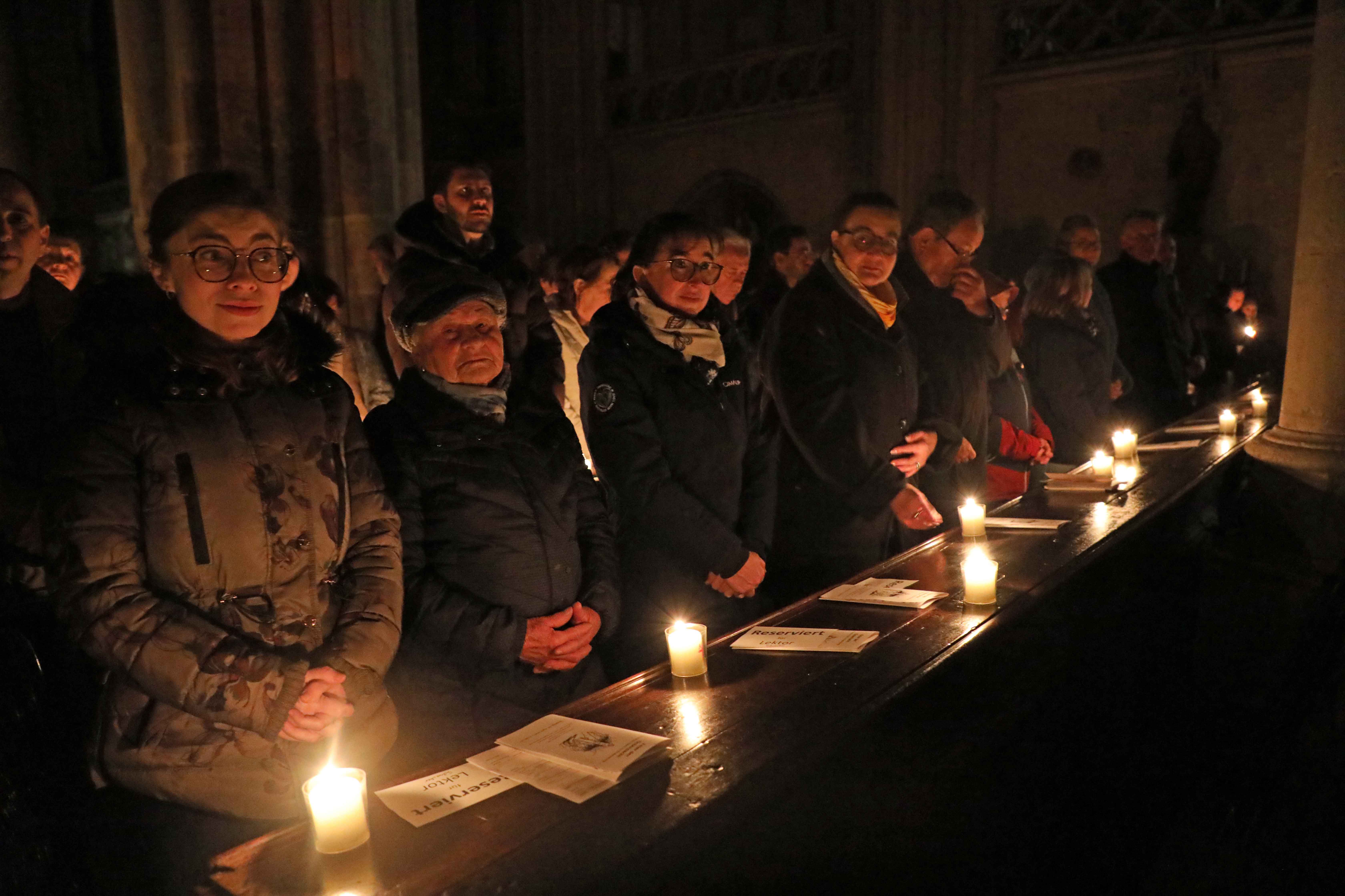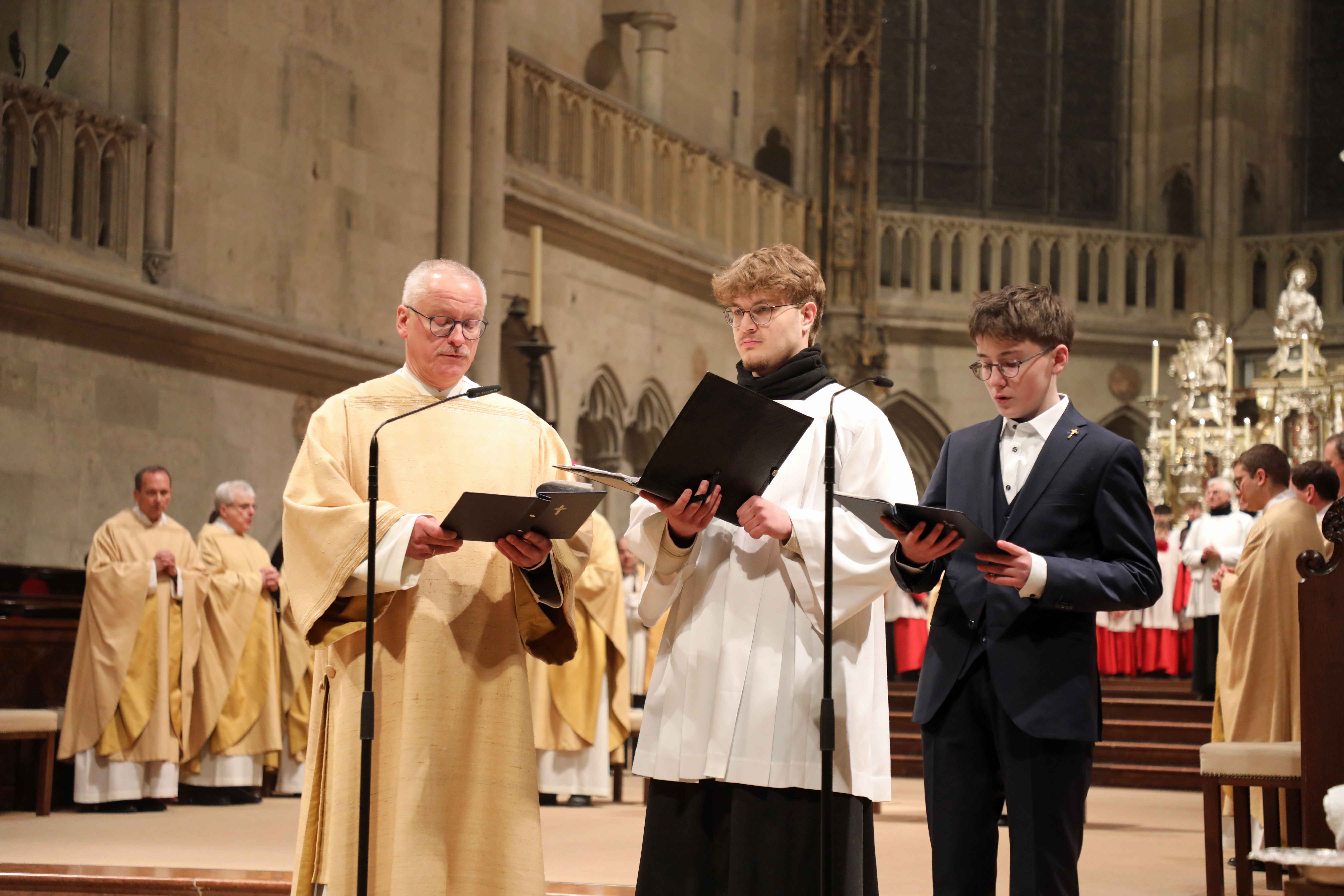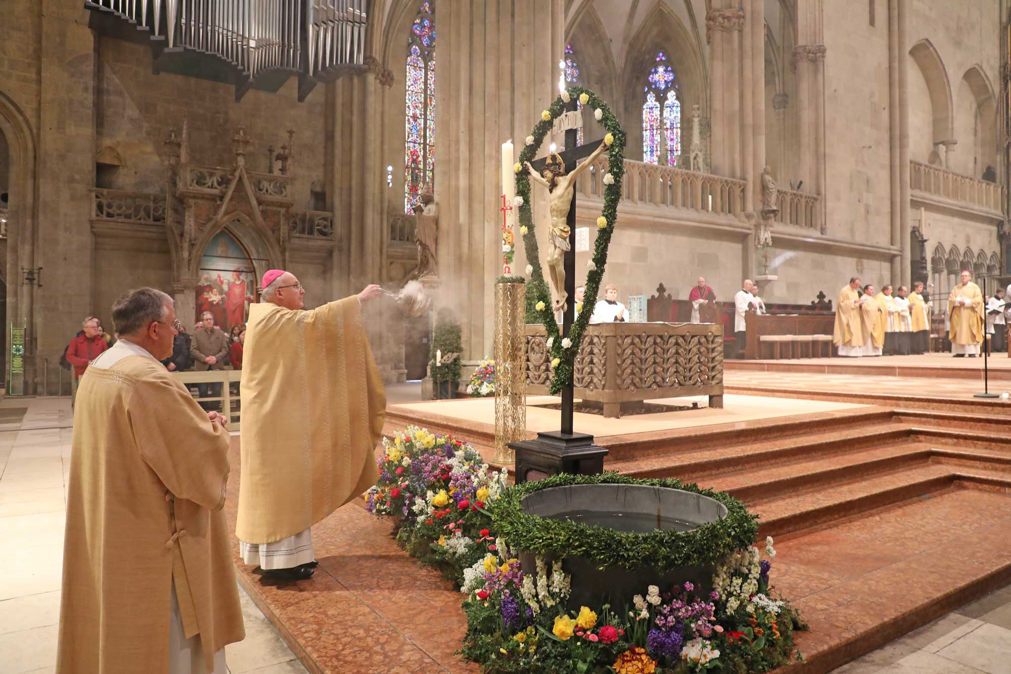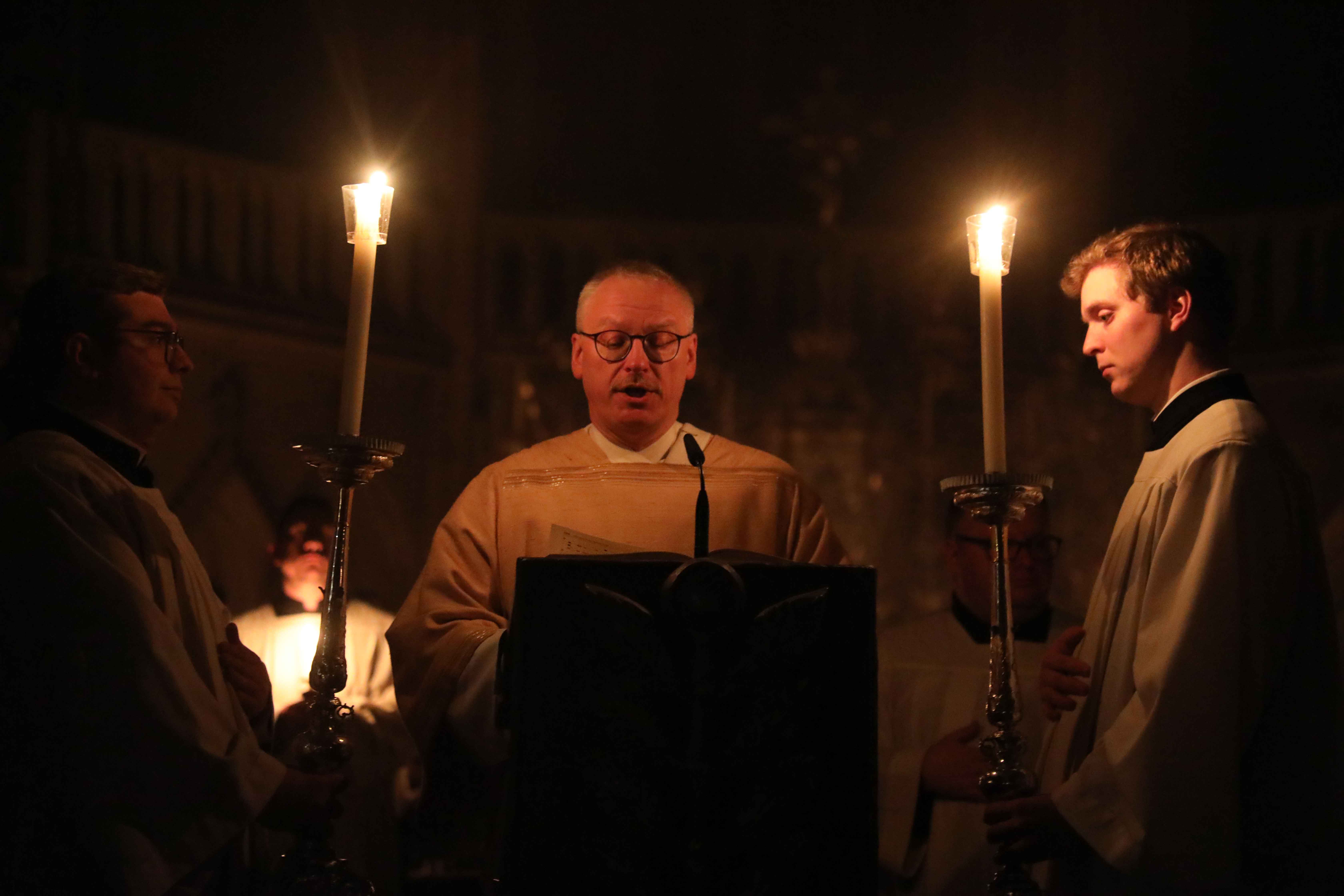 Die Osternacht begann nach Sonnenuntergang mit dem Entzünden des Osterfeuers auf der Südseite des Doms. An dessen Glut wurde die große Osterkerze entzündet und in einer stillen Prozession in den dunklen Dom getragen. Mit dem dreifachen Ruf „Lumen Christi“ verkündete der Diakon das Licht Christi, das anschließend unter den Gläubigen weitergegeben wurde – ein symbolträchtiges Ritual, das den Kirchenraum allein durch den Schein der Kerzen in warmes Licht tauchte.