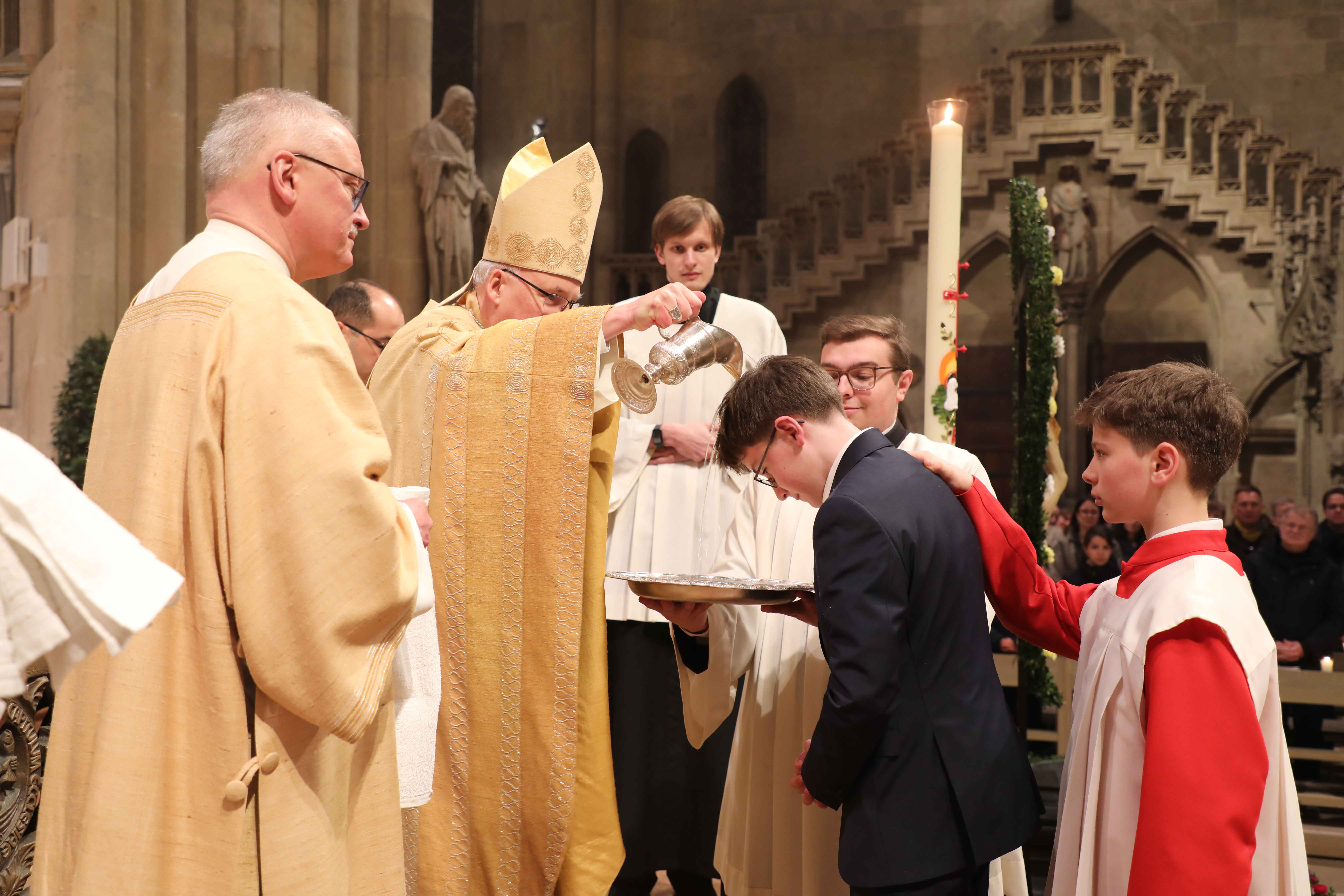 Besonders freute sich Bischof Rudolf Voderholzer über einen Täufling aus den Reihen der Regensburger Domspatzen. Dieser hatte aus freien Stücken um die Taufe gebeten. Wie alle anderen Taufbewerber wurde er intensiv auf diesen Moment vorbereit. Ein Mitschüler des Sängerknaben begleitete den Täufling als Paten, „der ihm als Vorbild auf dem Weg des Glaubens vorangegangen ist“, so Bischof Rudolf.