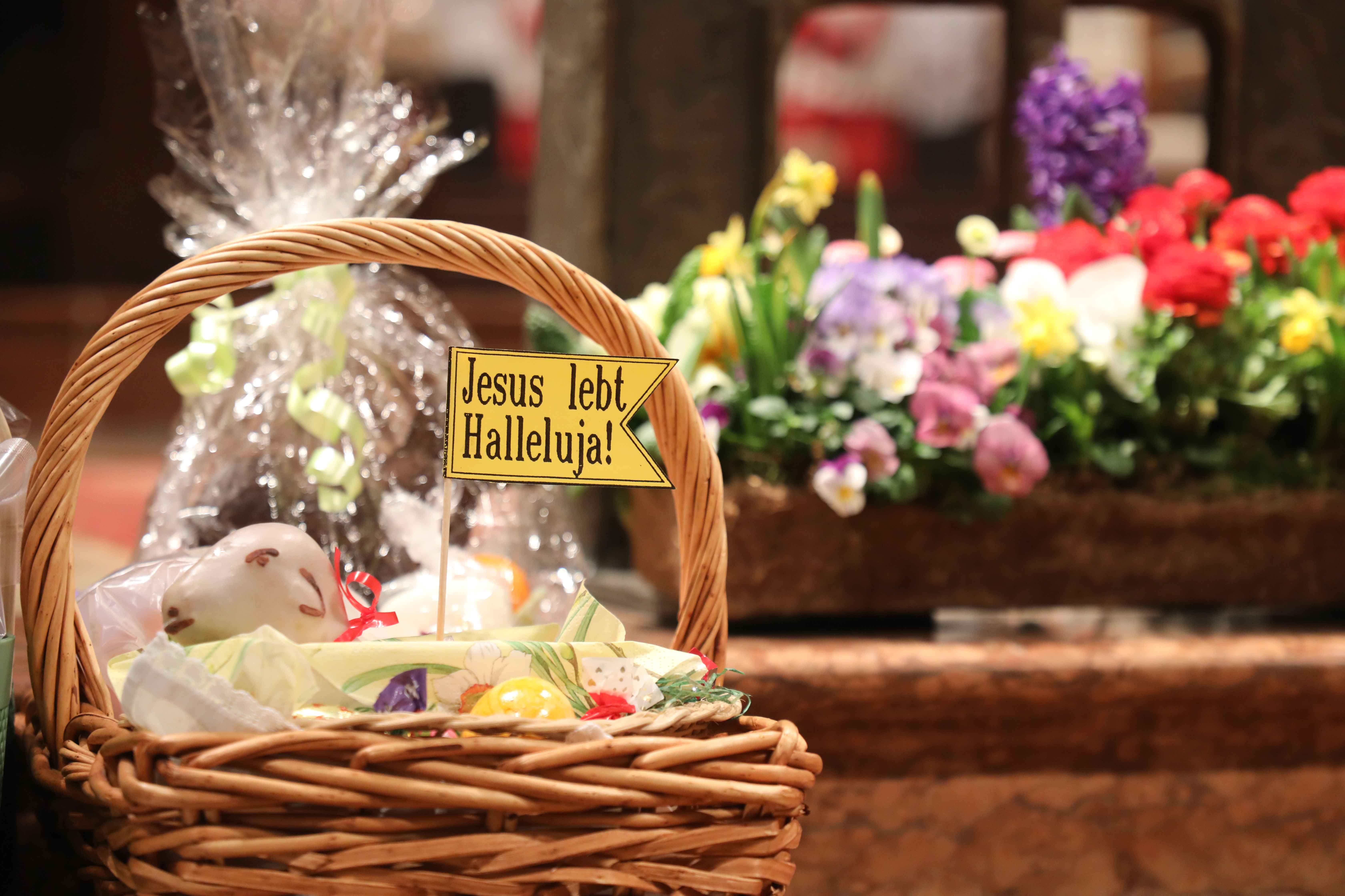 Zum Abschluss der Osternachtsfeier spendete Bischof Rudolf Voderholzer – nach alter Tradition – noch den Speisesegen für die mitgebrachten Osterspeisen, die in verzierten Körben vor den Stufen des Altares und auf den Bänken der Kathedrale aufgestellt worden waren.