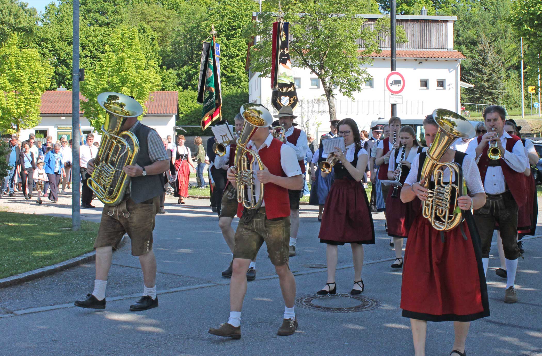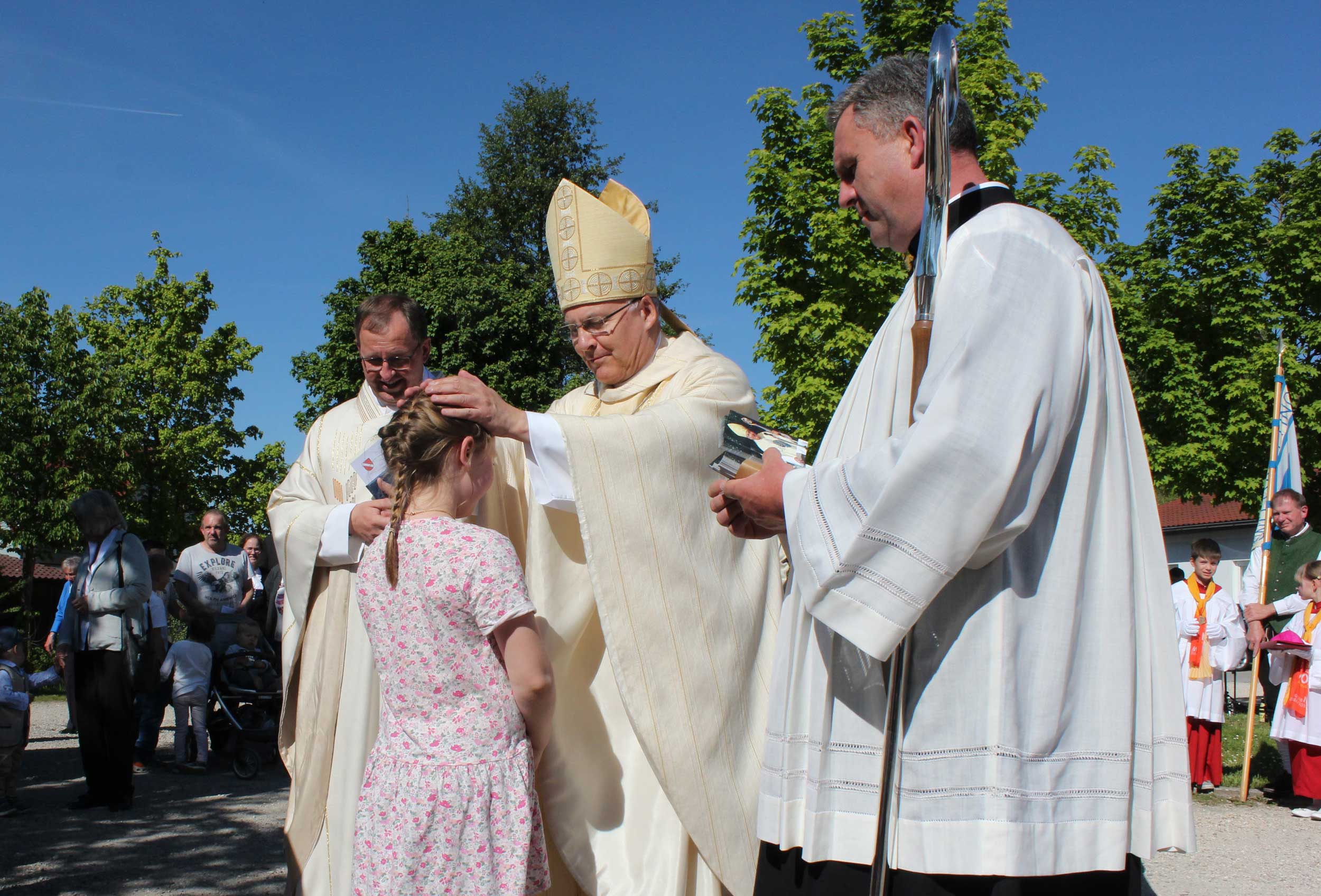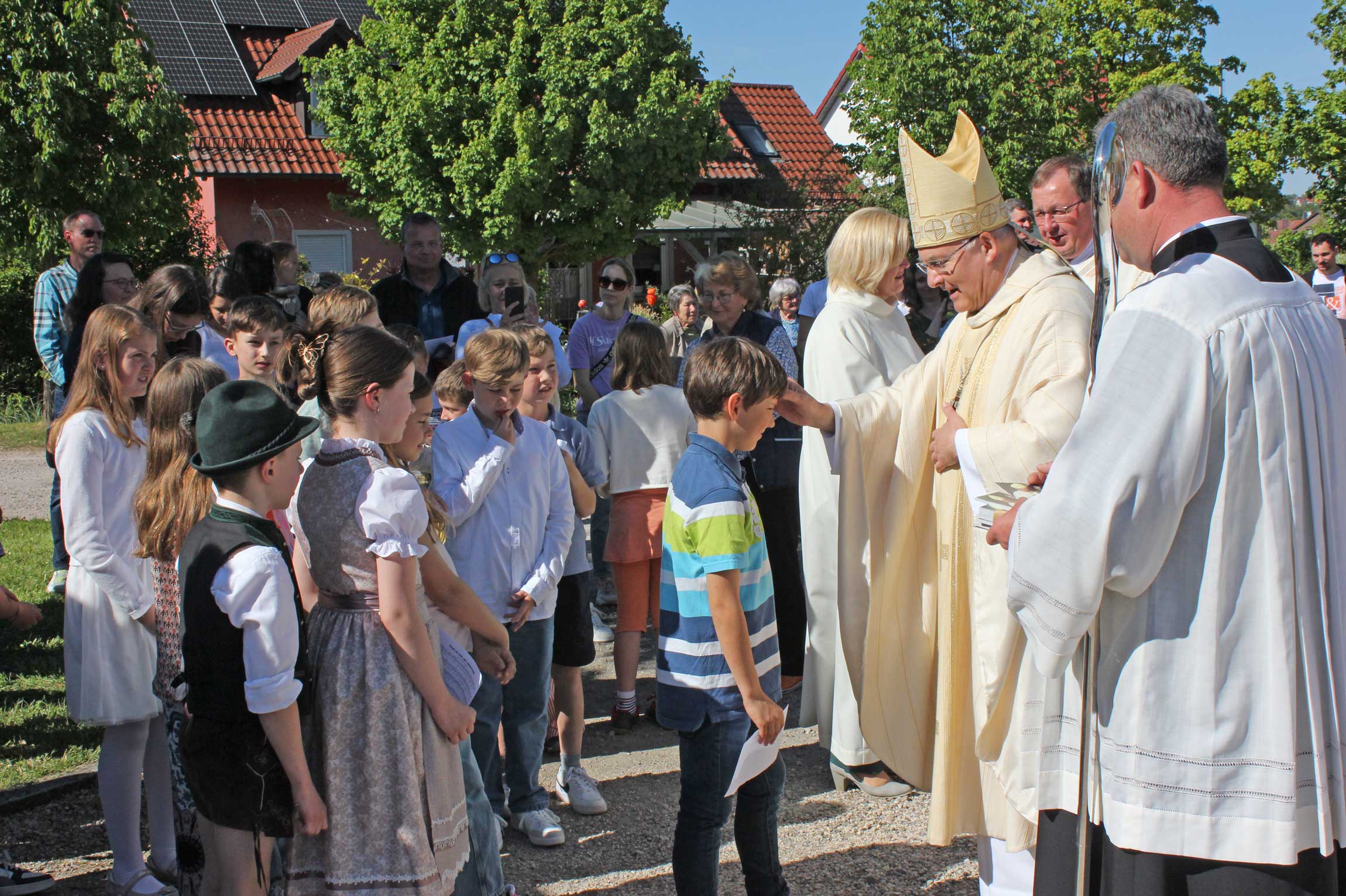 Nach diesem kurzen Ausflug ging es weiter nach Graßlfing, wo sich schon viele Erwachsene und Kinder vor dem Feuerwehrhaus versammelt hatten. Die Erstkommunionkinder empfingen den Oberhirten mit einem fröhlichen Lied und Bischof Rudolf bedankte sich herzlich. Bei der anschließenden Kindersegnung legte der Bischof jedem Kind die Hand auf und segnete es. Zur Erinnerung an den Segen erhielt jedes Kind ein Bischofsbildchen. In einem feierlichen Kirchenzug geleiteten die Gläubigen und die Vereine Bischof Rudolf dann unter den Klängen der Blaskapelle „Hanslberger Musikanten“ zur Filialkirche St. Nikolaus.