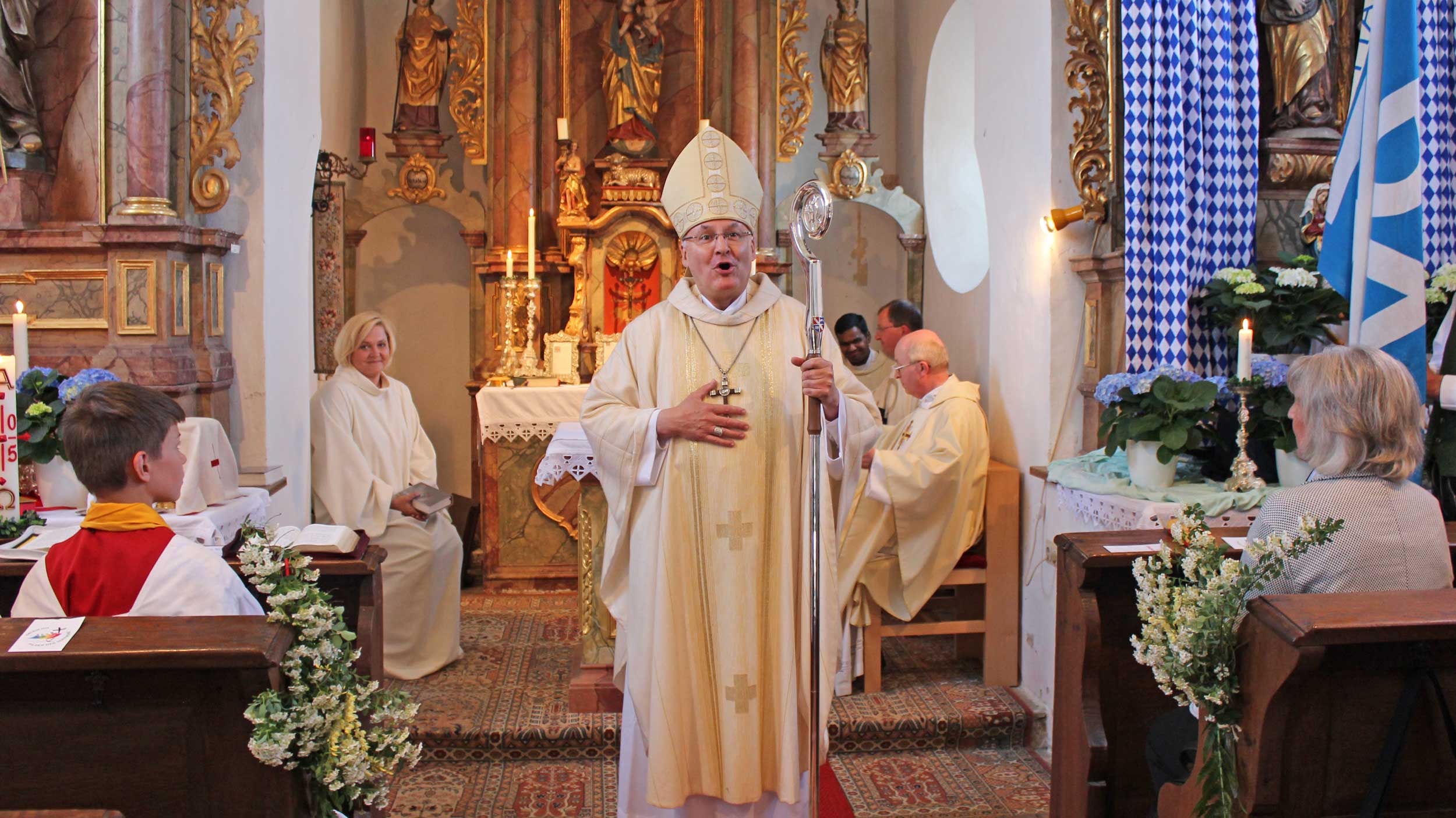 Der Diözesanbischof bedankte sich für den freundlichen Empfang und brachte seine Freude über die vielen Gottesdienstbesucher in der kleinen Gemeinde zum Ausdruck, wobei er anmerkte, dass er immer wieder erlebe: „Je kleiner die Einheit, desto lebendiger“. Mit den Konzelebranten Pfarrer Bernhard Reber, Pfarrvikar Francis Xavier Anthony Samy und Domvikar Msgr. Georg Schwager feierte Bischof Rudolf die Heilige Messe. Bei der Gestaltung des Gottesdienstes mit Liedern, Fürbitten und bei den Lesungen, waren Gläubige aus der Gemeinde miteinbezogen. Domspatz Andreas Heindl sang das Kyrie und den Zwischengesang bei den zwei Lesungen.