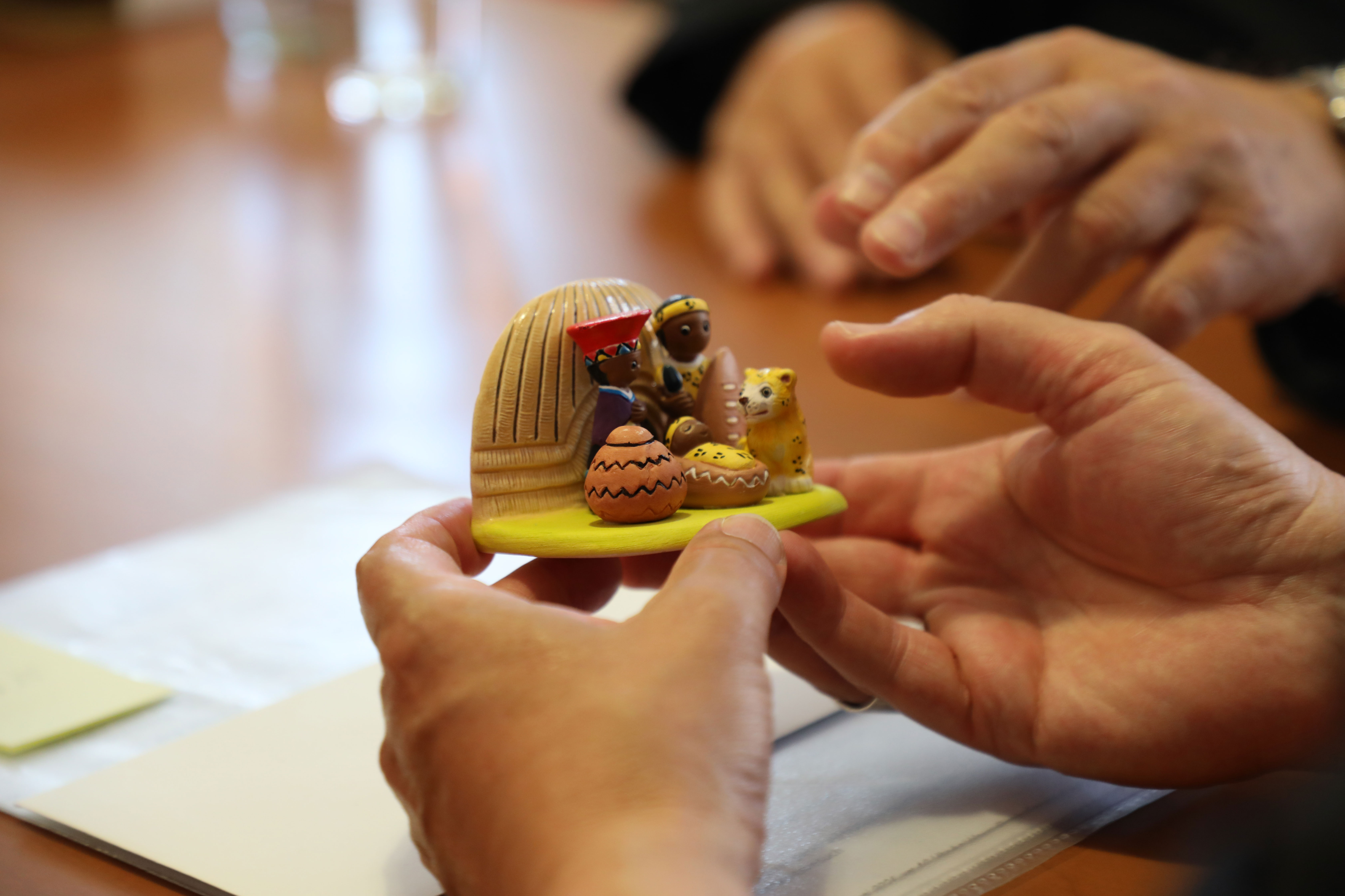 Zum Abschluss des Informationsgespräches bei Bischof Rudolf hatte der Missionsbenediktiner noch einige Mitbringsel für den Regensburger Oberhirten im Gepäck. Er schenkte dem Regensburger Oberhirten einmal eine sogenannte Zulukrippe. Dabei handelt es sich um eine Afrikanische Krippe, in der Josef als Zulukrieger, Maria mit einer Inhloko-Frisur, wie sie verheiratete Frauen in Afrika traditionell tragen, dargestellt ist. Josef, wie auch schon das Jesuskind, sind gekleidet in Leopardenmuster, das den Königen vorbehalten war. Um diese besondere Stellung noch weiter hervorzuheben, sitzt neben der Familie statt Ochs oder Esel ein kleiner Leopard. Daneben schenkte er Bischof Voderholzer noch eine besondere Laternenkrippe, die von seiner Schwester eigens für den Regensburger Oberhirten gefertigt wurde. Die Krippenszene wird nicht in einem Stall gezeigt, sondern am Monopteros, einem offenen Rundbau mit Säulen. Dieser befindet sich im Englischen Garten in München, ein Ort, den Bischof Rudolf als geborener Münchner seit Kindheit an kennt. Er ließ sich auch gleich die Kontaktdaten geben, um sich bei der Schwester von Gerhard Lagleder persönlich für die Krippe zu bedanken. Pater Gerhard hatte sogar noch eine dritte Krippe im Gepäck. Allerdings handelte es sich dabei eine digitale Krippe, bei der er auf einem USB-Stick Fotos und auf Videos gespeichert hatte, um Bischof Rudolf die Krippe zu zeigen, die in der Gesundheitsstation in Südafrika steht.