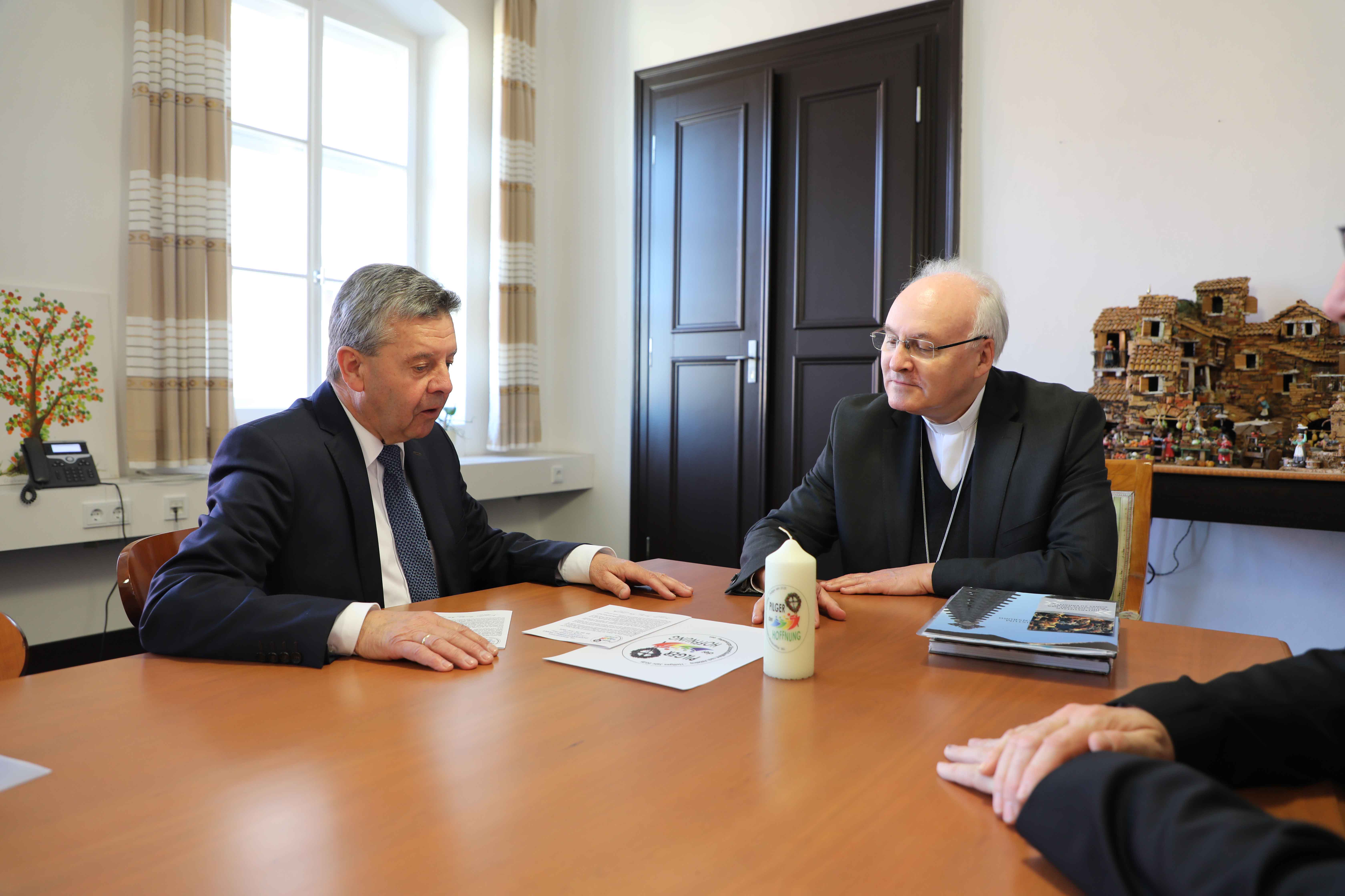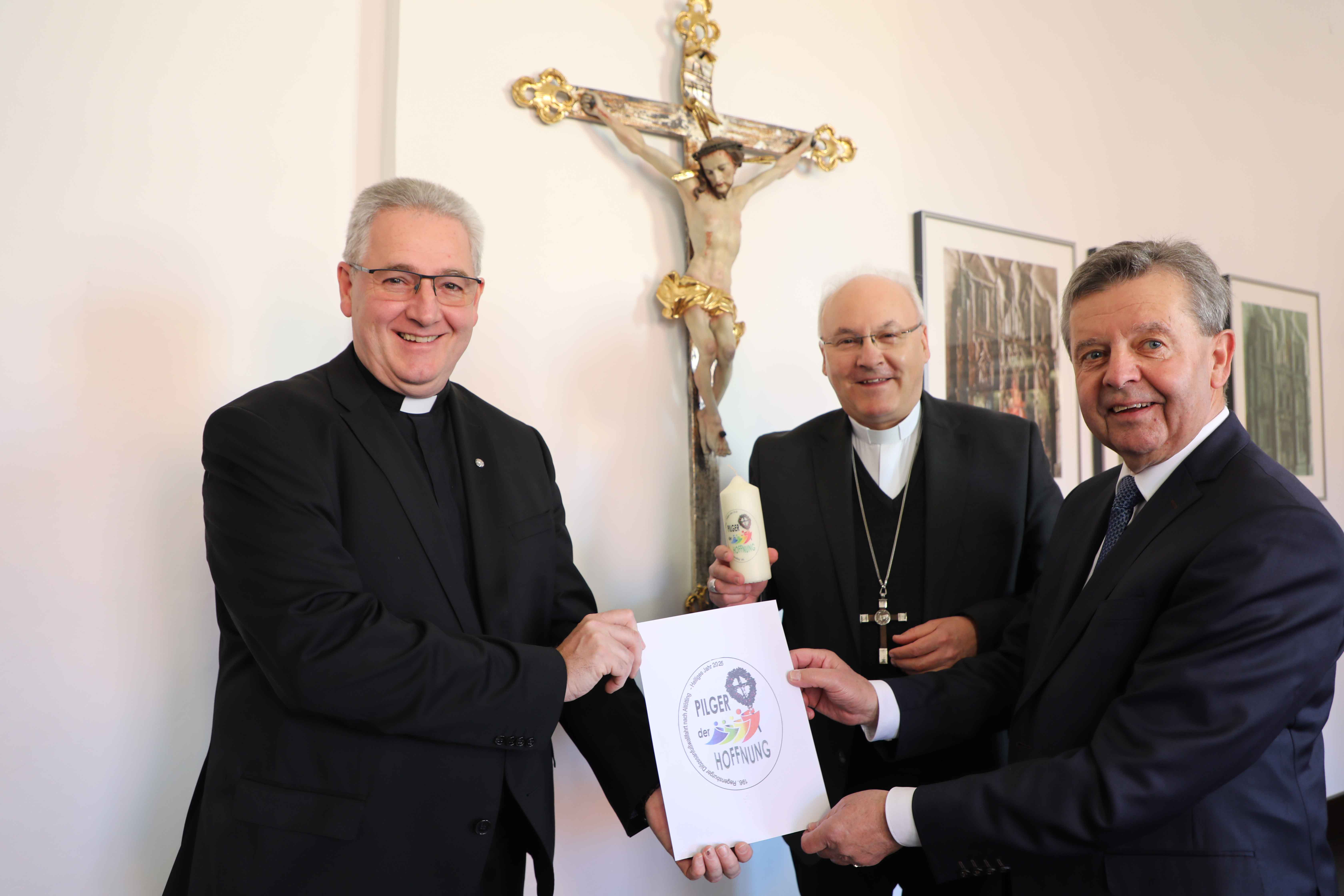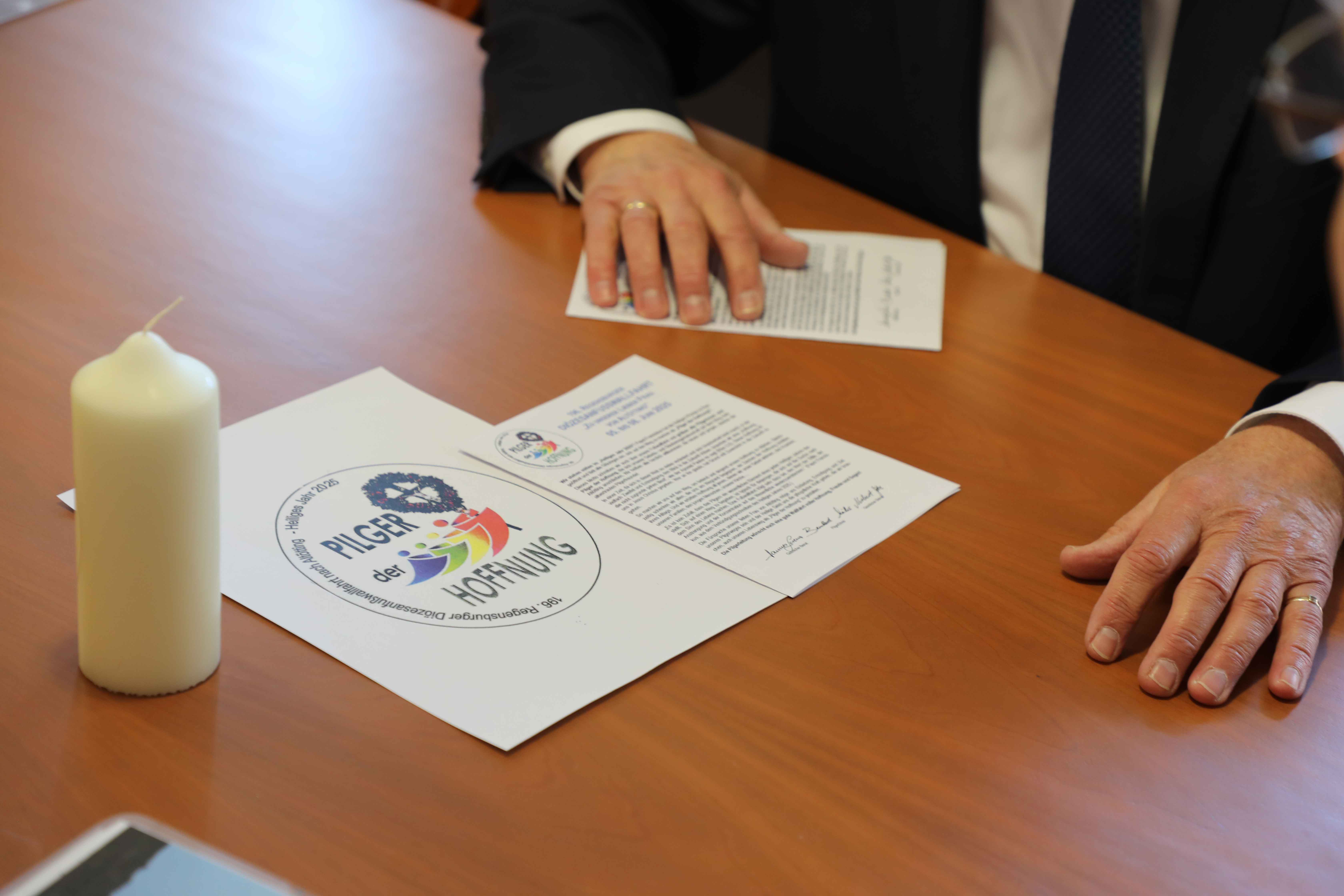 Die Vorbereitungen laufen auf Hochtouren, so Pilgerführer Bernhard Meiler. Die Polizeibesprechungen sind ebenfalls sehr erfolgreich verlaufen und alle Verantwortlichen blicken positiv und mit großer Vorfreude auf die anstehende Fußwallfahrt. In diesem Jahr lautet das Motto der 196. Wallfahrt „Pilger der Hoffnung“, in Anlehnung an das Heilige Jahr, das ebenfalls 2025 stattfindet. Bischof Rudolf freute sich sehr über das gewählte Motto und den Brückenschlag zum Heiligen Jahr in Rom. Die Pilgerleitung überreichte dem Regensburger Oberhirten auch die neue Pilgerkerze zur Wallfahrt. Auf der Kerze ist das Motto der Wallfahrt, das bunte Logo und das Pilgerkreuz abgebildet. Das Pilgerabzeichen aus Metall wird in diesem Jahr bunt sein und sich somit von den Abzeichen der letzten Jahre absetzen. Bischof Dr. Rudolf Voderholzer informierte sich auch über die aktuelle Bettensituation für Pilger und die aktuellen Teilnehmerzahlen.