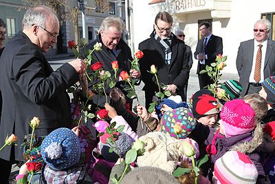 Nach der Feier einer Andacht mit den Kindern des Kindergartens „Sausewind“ sowie der 1. und 2. Klassen der Grundschule in der Pfarrkirche St. Sixtus Münchsmünster ist Bischof Rudolf Voderholzer im Rathaus von Vohburg im Rahmen eines Mittagessens verschiedenen Kommunalpolitikern begegnet. Dies geschah im Rahmen seines Pastoralbesuchs im Dekanat Geisenfeld am vergangenen Freitag, der den Abschluss der Großen Visitation bedeutete. Vor dem Rathaus wurde der Regensburger Bischof erneut – am Valentinstag – von zahlreichen Kindern mit Blumen begrüßt, die er zu einem ansehnlichen Strauß zusammenfasste.