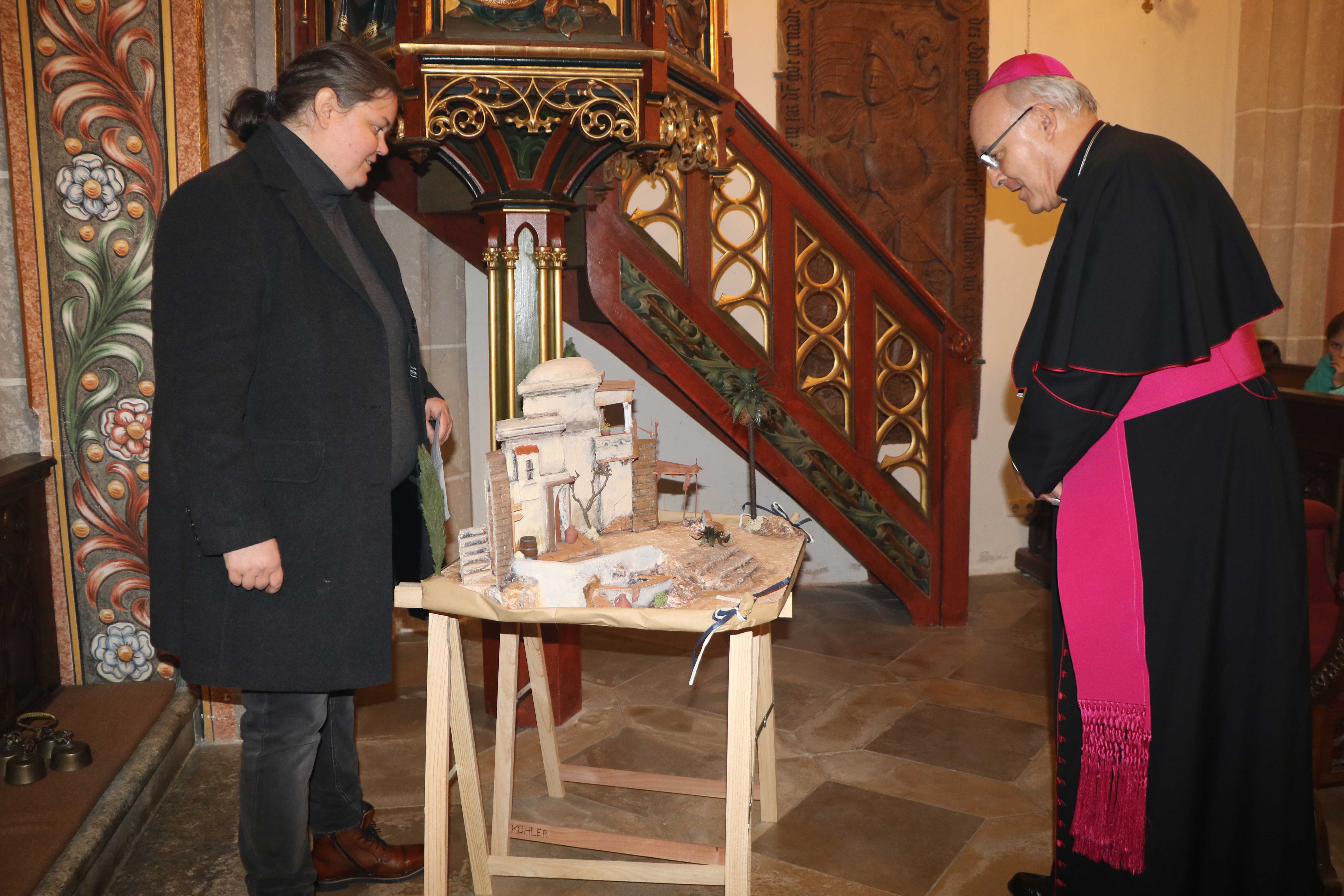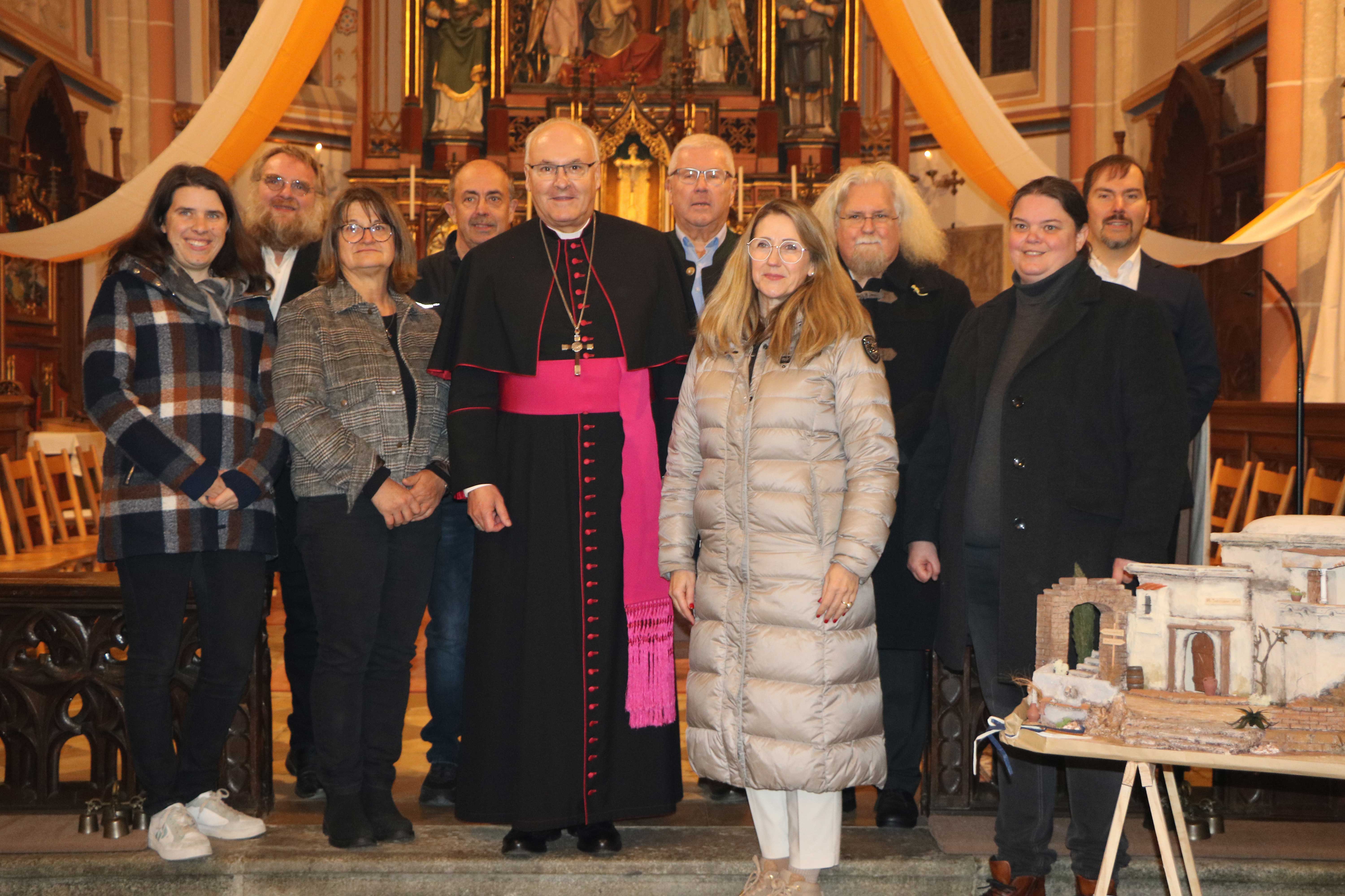 Bischof Rudolf war tief gerührt von einem besonderen Geschenk: Die Krippenbaumeisterin Sabine Kohler hatte für ihn eine Herbergssuche in Miniatur angefertigt, die der Bischof mit großer Freude entgegennahm. Im Anschluss an den Gottesdienst segnete Bischof Rudolf das neue Kreuz an der Friedhofskapelle und nahm sich bei einem Stehempfang viel Zeit, um mit den Pfarrangehörigen ins Gespräch zu kommen.