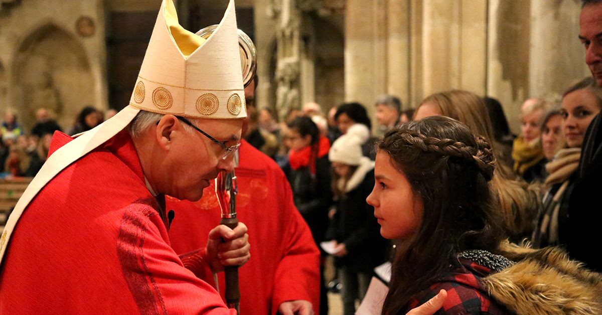 „,Die Englischen‘ nennen sie sich auch und daher müssten die Schülerinnen der Marienschulen gut verstehen, was an diesem Freitag, dem 29.11.2019, weltweit in irgendeiner Weise begangen würde: der Black Friday für Konsumfreudige, der Friday for Future für alle, denen die Klimarettung am Herzen liegt“, sagte Bischof Rudolf in seiner Predigt. Doch die vielen Mädchen, die sich an diesem Freitag im Dom St. Peter versammelt hatten, feierten weder das eine noch das andere. Sie waren hier, um das Sakrament der Firmung zu erhalten. „Das ist dann kein Black Friday und kein Friday for Future, sondern ein Red Friday for Future“, rief Bischof Vorderholzer den Mädchen zu. „Denn bei der Firmung steht die Farbe Rot im Mittelpunkt. Rot für das Feuer, die Liebe und das Blut.“