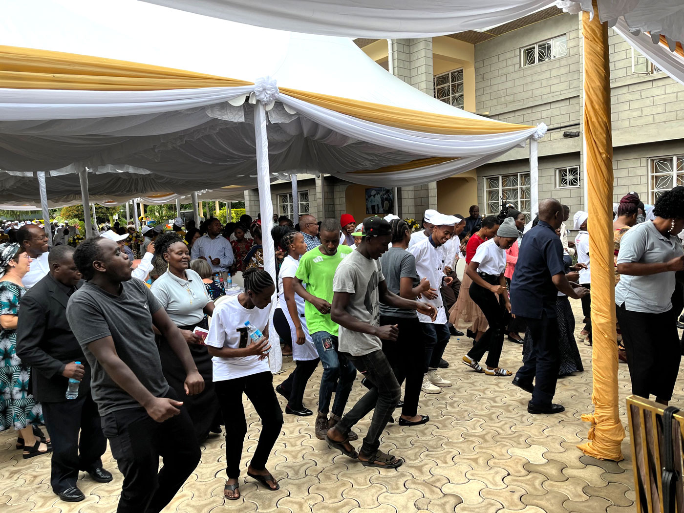 Nach den Grußworten und den obligatorischen Gruppenfotos mit den anwesenden Bischöfen – es waren mittlerweile viereinhalb Stunden vergangen – wartete ein reichhaltiges Mittagsbüffet auf die Festgemeinde. Ob Jung oder Alt, ob Bischof oder Bettler, alle konnten satt werden und sich auch an einer großen Auswahl an Getränken bedienen. „Wenn wir feiern“, erklärte P. Senguo seinen Regensburger Gästen, „darf niemand hungrig nach Hause gehen.“ Und so wurden immer neue Speisen aufgetragen, bis selbst die letzten Gürtel zu eng zu werden drohten. Die Menschen dankten es mit fröhlicher Stimmung. Wie die Ordensleute zogen auch das Küchenpersonal und alle anderen in langen Schlangen mit ihren Wasserflaschen oder Biergläsern zum Anstoßen am Tisch der Bischöfe vorbei, und so manche unter ihnen fingen ausgelassen zu tanzen an. Gegen 17 Uhr endete das Fest mit dem Segen des Erzbischofs von Daressalam, der alle Feiernden glücklich nach Hause gehen ließ.