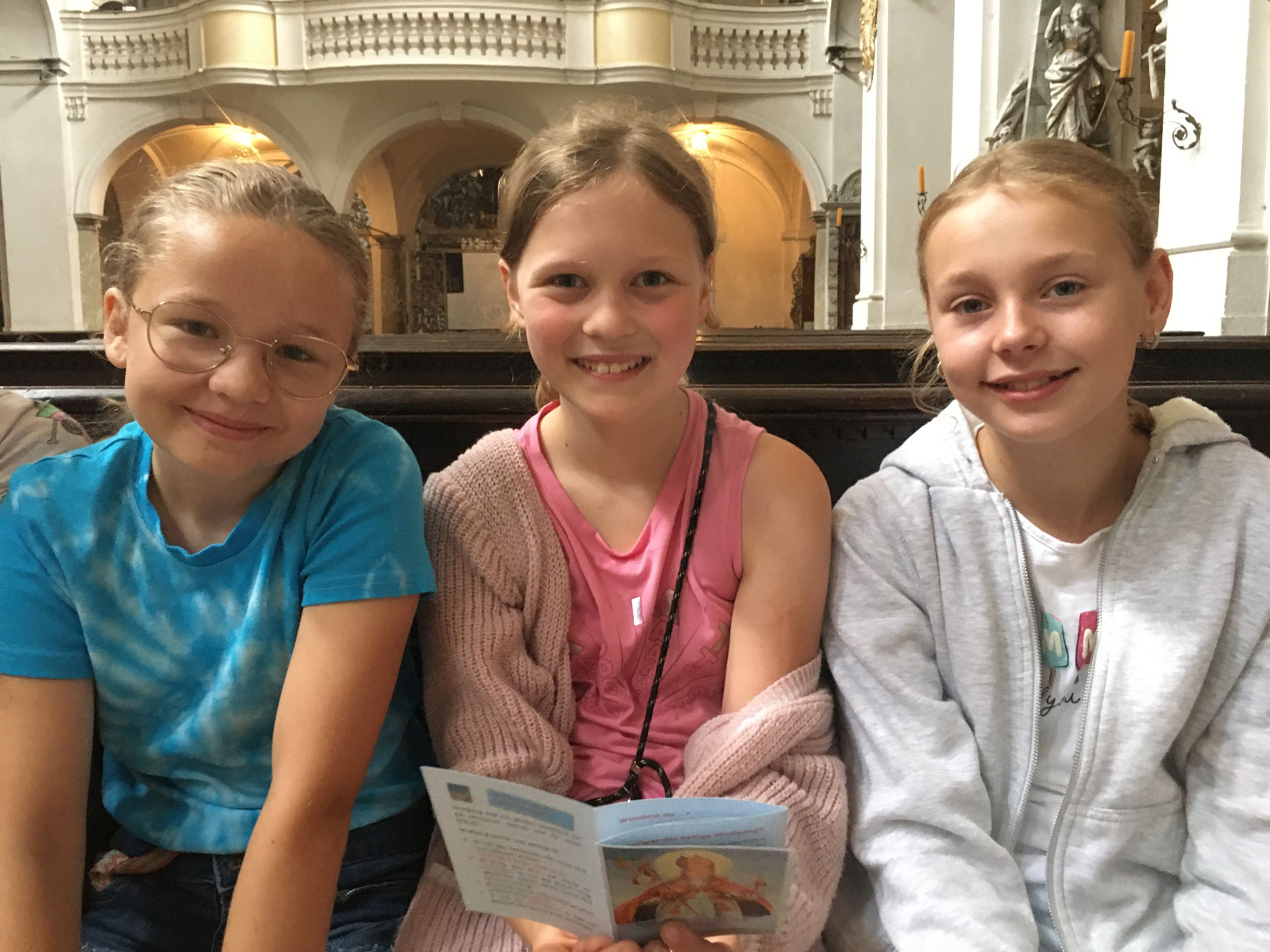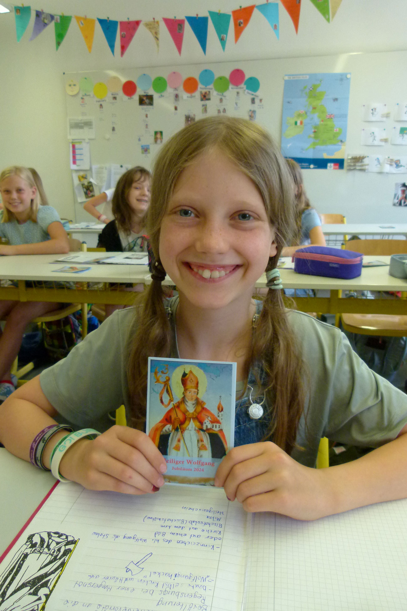 Erst einmal galt es im „Reliunterricht“ in die scheinbar ferne Vergangenheit des hl. Wolfgang einzutauchen. Aber was da zu entdecken war, war alles andere als von gestern... Der junge Wolfgang ist durch Wissensdurst und Begabung aufgefallen, so dass er die berühmte Schule der Benediktiner auf der Reichenau besuchen durfte. Dort lernte er unter dem alten Grundsatz „ora et labora“ (Bete und arbeite!) die Grundlagen damaliger Erkenntnisse, weil dem unbedingt ein „et lege!“ (und lies/studiere!) hinzugefügt werden muss, wie Pfarrer Albert seinen wissbegierigen Schülerinnen erklärt. Dass Wolfgang dann so gescheit war, dass er seinen Lehrern Fragen stellte, auf die diese keine Antworten mehr wussten, gefällt den Mädchen genauso wie sie es ungerecht finden, dass Wolfgang deshalb von der Schule flog, weil er besser wurde als seine Lehrer. So jemand muss selbst unterrichten - und das tat Wolfgang in Trier.