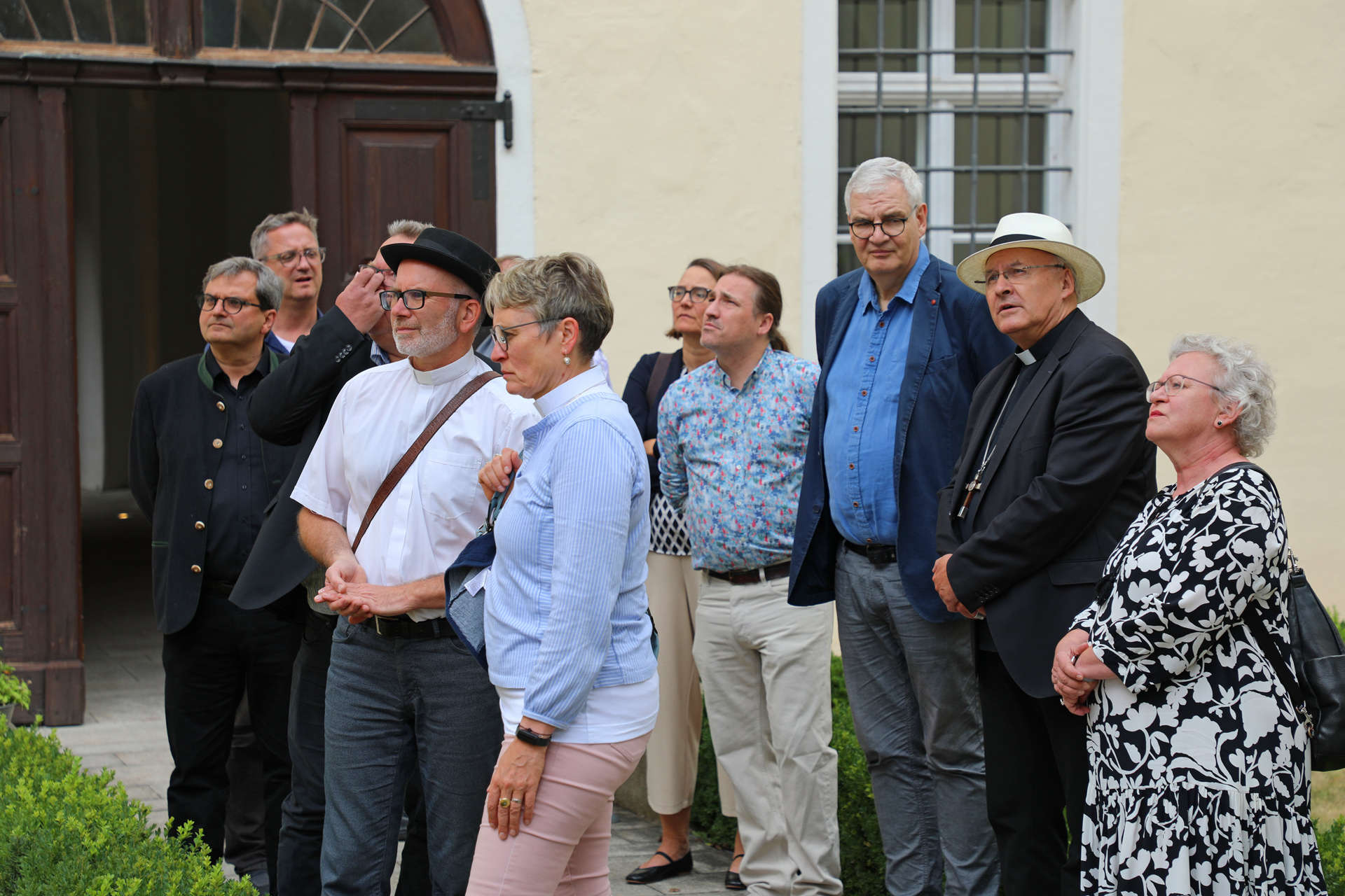 Nachdem die Pastorinnen und Pastoren eingetroffen waren, begann Bischof Rudolf die Führung im Kreuzgang der Niedermünsterkirche. Dort erklärte er den interessierten Gästen die baulichen Entwicklungen, die unter den Vorgängern des Bischofs das heutige Ordinariat geformt hatten. Von dort aus ging es weiter in die ehemalige Bischofswohnung, die als Ausstellungs- und Lagerort eines großen Teils der Krippen des Bistums fungiert. Bischof Rudolf nutze lediglich einzelne Räume, wie das Refektorium zum Empfangen von Gästen und zum Essen, oder die unzähligen Bücherregale zur Unterbringung von Literatur. Er selbst wohne in Räumen der Niedermünsterschwestern, die früher die Aufgabe hatten, für den Bischof zu sorgen. Jedoch brauche das ein Bischof in der heutigen Zeit nicht, weswegen dort auch keine Schwestern mehr lebten, so Bischof Voderholzer.