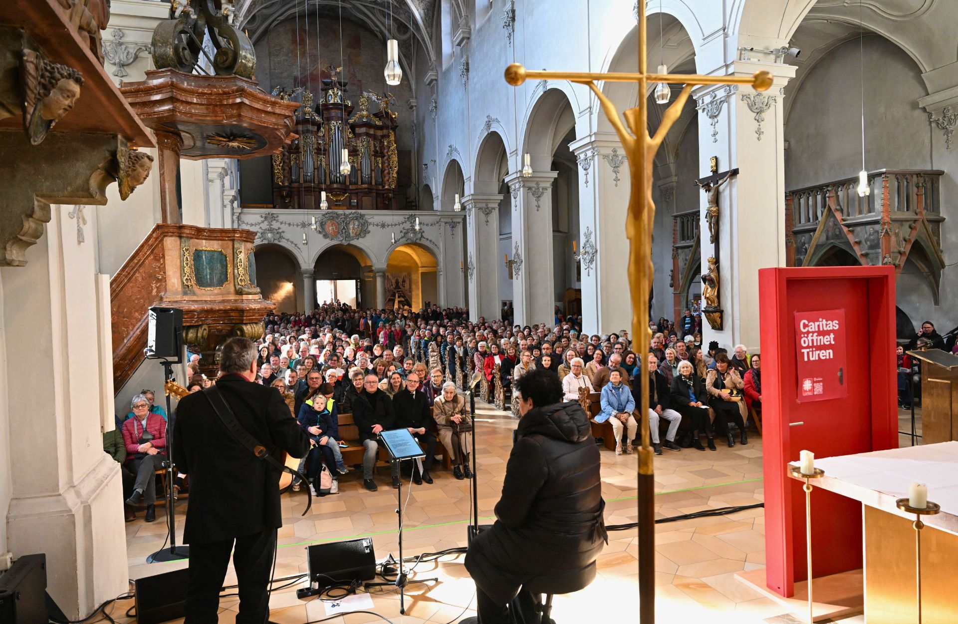„Das Caritas Marienheim bietet Frauen, die keinen eigenen Weg mehr sehen, eine offene Türe und ein schützendes Dach“, beschrieb Caritasdirektor Michael Weißmann den Anlass und das Spendenziel des Benefizkonzertes in der der Niedermünsterkirche in seiner Einführung mit wenigen Worten. Und dann passierte in dem mit über Zuhörerinnen und Zuhörern bis auf den letzten Platz gefüllten Kirche etwas Außergewöhnliches: Aus einem Begrüßungsapplaus heraus traten Stimmkünstlerin Steffi Denk und Gitarrenvirtuose Hans „Yankee“ Meier und holten das Publikum mit dem Beatles-Klassiker „Here Comes The Sun“ von der ersten Sekunde an ab – und ließen es bis zur Zugabe nicht mehr aus ihrem Bann. Dass das Benefizkonzert 15.000 Euro an Spenden einspielte, setzte den rundum gelungenen Nachmittag einen besonderen Glanz auf.