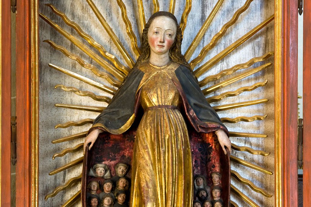 Der Typus der Schutzmantelmadonna ist unter den Marienbildern eine sehr spezielle Variante. Die Wurzeln für das Motiv des schützenden Mantels liegen im juristisch-symbolischen Bereich. Die Adoption oder öffentliche Legitimierung eines Kindes durch den Vater erfolgte, indem er es unter seinen Mantel nahm. Auch Verfolgte konnten unter dem Mantel vorzugsweise hochgestellter Frauen Zuflucht finden. Im 13. und 14. Jahrhundert übertrug die fromme Legendenbildung dieses Mantelschutzrecht auf die Gottesmutter Maria, welche die ganze Welt unter ihrem Mantel birgt.