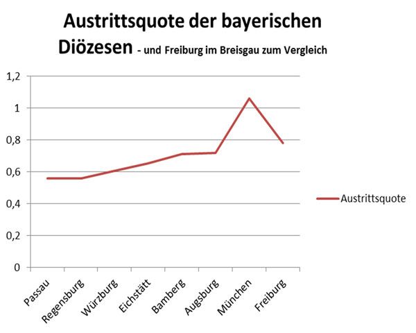 Die Austrittszahlen werden an diesem Freitag, 20. Juli, für alle Diözesen in Deutschland bekanntgegeben. Auch hier gilt: Alle Diözesen bedauern jeden einzelnen Austritt. Was Bayern betrifft, liegen die Bistümer Passau und Regensburg am unteren Ende der gesammelten Austrittsquoten (0,55). Es folgen Würzburg (0,6), Eichstätt (0,65), Bamberg (0,71), Augsburg (0,72) und München (1,06). Die durchschnittliche Austrittsquote in Bayern liegt bei exakt 0,75. Das bedeutet, dass im vergangenen Jahr in Bayern im Schnitt zwischen 7 und 8 von 1000 Personen aus der Kirche ausgetreten sind. In der Erzdiözese Freiburg, einem der größten Bistümer in Deutschland, liegt die Quote bei 0,78 Prozent.