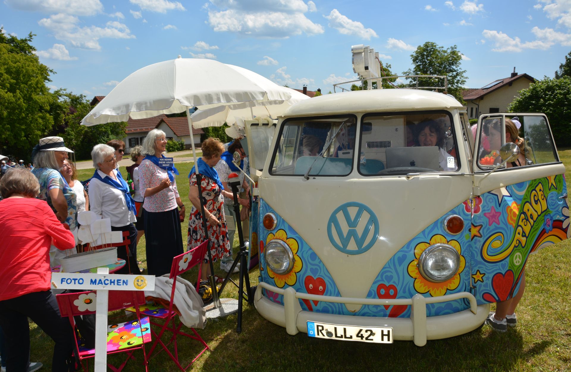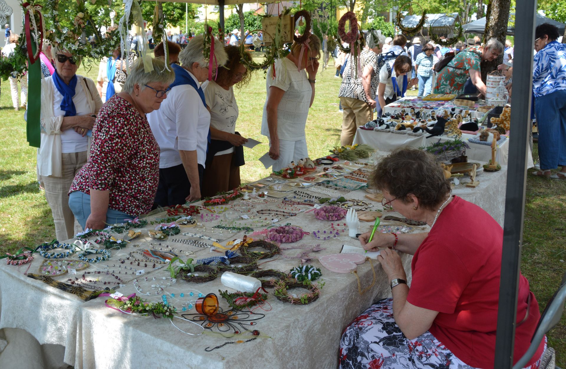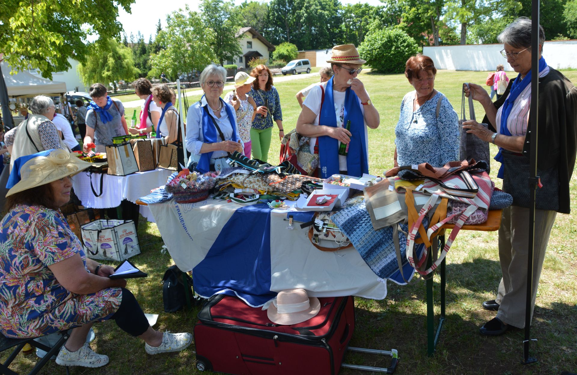 Nach dem Dank an das Organisationsteam und der Übergabe kleiner Geschenke ging es unter den Klängen der Stadtkapelle Hemau zum Mittagessen in den Pfarrgarten. Wegen der heißen Temperaturen hatten sich viele Frauen aber auch an anderen Stellen ihre Tische und Bänke aufgestellt. Beim Markt der Möglichkeiten gab es an mehreren Ständen von Frauen hergestellten Schmuck, Taschen aus recycleten Materialien oder ein Kochbuch. Am Getränkestand war zudem das KDFB-Bier und KDFB-Radler zu erwerben. Bei zwei Ständen konnten sich die Frauen zudem fotografisch ins rechte Licht rücken. Die Kollekte galt dem Projekt „Hummelchen“ der Katholischen Jugendfürsorge Regensburg, den Festgottesdienst umrahmte der Frauenchor „Canores“ aus Parsberg unter der Leitung von Marga Meinl.