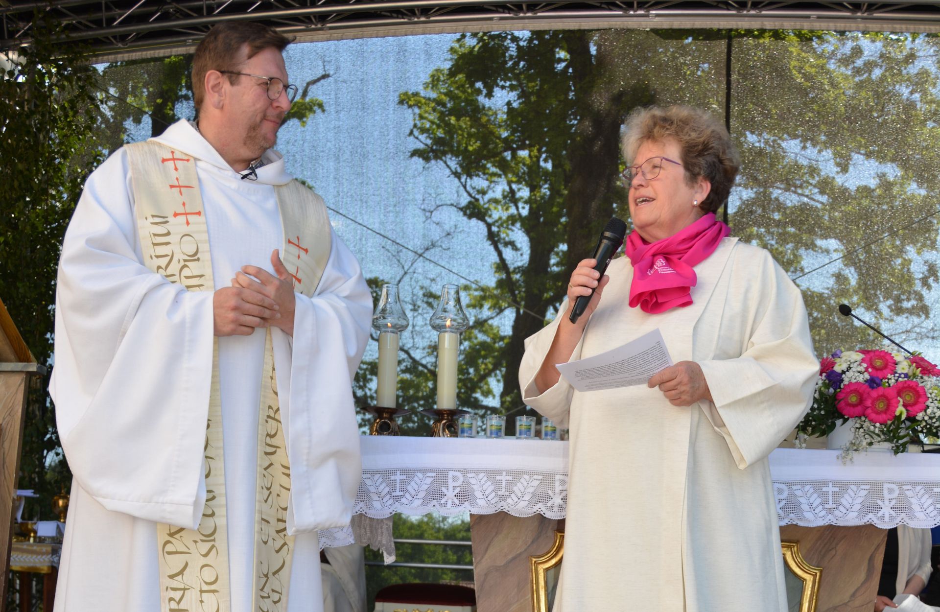 In einer Dialogpredigt erläuterten die Geistliche Beirätin Pfaller und Pfarrer Meier aus verschiedenen Blickwinkeln das Evangelium von den Emmausjüngern. Während Pfaller die zwei Emmausjünger als ein Ehepaar interpretierte – auch aufgrund biblischer Namen und möglicher Zusammenhänge, schilderte Pfarrer Meier manche Charakteristika seiner Großeltern. Bei beiden Paaren habe das Gespräch bzw. der „Ratsch“ mit anderen etwas bewirkt – Hoffnung. Während in der biblischen Szene das Brechen und Verteilen des Brotes das Typische war, nannte Pfarrer Meier bei seinen Opa das feine Schneiden des Geräucherten. „Der Opa hat das mit Liebe getan. Ich habe gespürt, es ist etwas Besonderes“, blickte der Geistliche auf seine Kindheit zurück. Am Ende der Predigt stellte er Jesus in den Mittelpunkt, zumal den Emmausjüngern klar geworden sei, „dass Jesus die große Liebe Gottes auf der Welt ist, Jesus Liebe und Hoffnung schenkt“, so Pfarrer Meier. Daraus resultiere der Auftrag, Hoffnung und Liebe in die Welt zu bringen – trotz autoritärer Politiker und aktueller Kriege und Krisen. „Wir dürfen die Begeisterung in der Arbeit des Frauenbundes spüren. Wir müssen die Auferstehung Jesu durch unser Tun sichtbar machen. Christus ist auferstanden, er ist wahrhaft auferstanden“, schloss Pfarrer Meier die Dialogpredigt.
