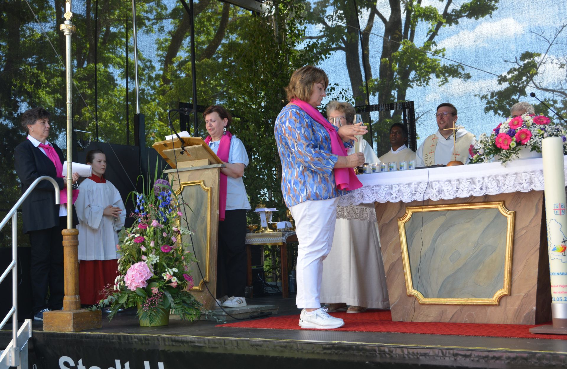 Beim Gottesdienst wirkten KDFB-Frauen als Lektorinnen bei der Lesung und den Fürbitten sowie als Kommunionhelferinnen. Am Ende der Eucharistiefeier bat die Geistliche Beirätin die Gottesdienstbesucherinnen, „die Freude und Hoffnung in den Alltag zu den Menschen, die uns begegnen, zu bringen.“ Symbolisch geschah dies mit einer Prozession rund um die Kirche, musikalisch begleitet von der Stadtkapelle Hemau unter der Leitung von Johannes Mittermaier. Nach dem Umzug schwenkten die Bannerträgerinnen ihre Fahnen zur Ehrerbietung vor dem Altar in der Wallfahrtskirche und verharrten zu einem stillen Gebet.