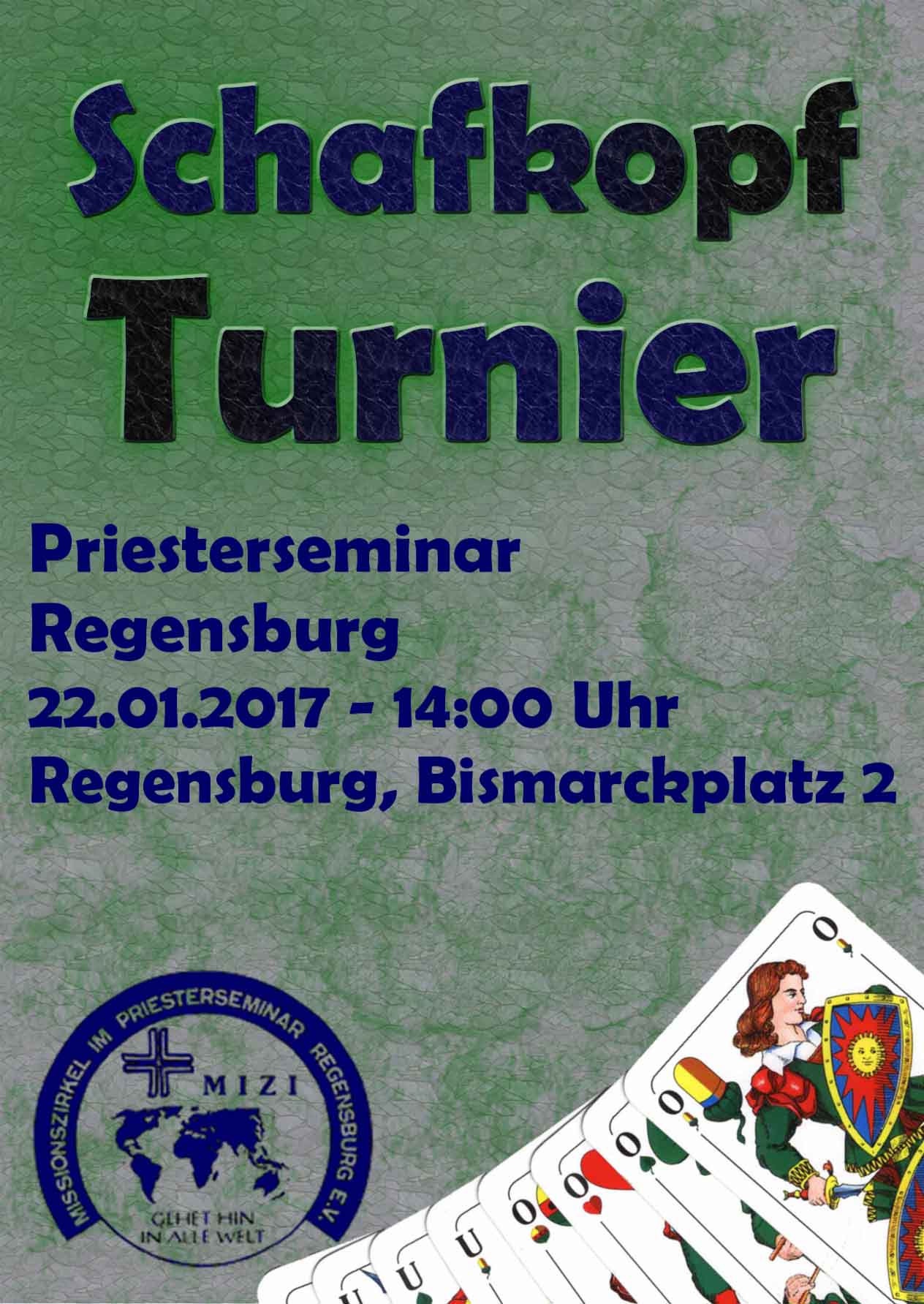 Am Sonntag, dem 22. Januar 2017, lädt der “MiZi” (Missionszirkel im Priesterseminar e.V.) zum traditionellen Preis-Schafkopf. Es gibt wieder interessante Preise zu gewinnen. Ab 14.00 Uhr wird im Bierstüberl des Priesterseminars das Turnier steigen. Für Freibier und Brezen ist gesorgt. Der Erlös kommt der Arbeit unseres Missionszirkels zugute. Der Missionszirkel im Priesterseminar e.V. ("MiZi") besteht seit bald fünfzig Jahren. Die Vereinsarbeit wurde und wird in all den Jahren immer ehrenamtlich von Seminaristen des Regensburger Priesterseminars St. Wolfgang geleistet. Mit verschiedenen Aktionen und der Hilfe von zahlreichen Spendern wird jährlich ein Spendenaufkommen von 15.000-20.000 € erreicht und ohne Abzüge für die Missions- und Entwicklungsarbeit eingesetzt. Kontakt: Priesterseminar Regensburg, Bismarckplatz 2. Telefon 0947/29830.