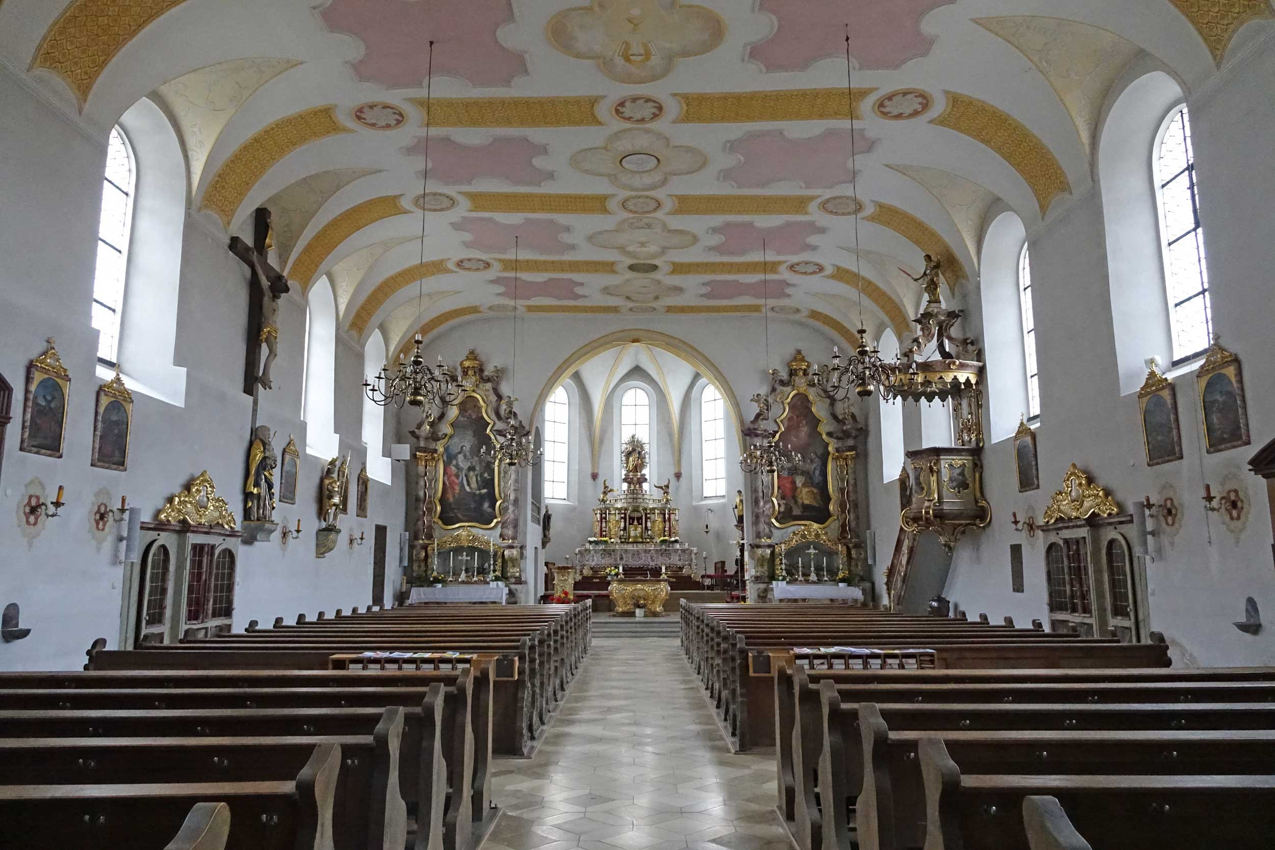 Die Ausstattung wurde zum großen Teil aus anderen Kirchen übernommen: So stand der Hochaltar bis 1888 in der Wallfahrtskirche auf dem Bogenberg; und die beiden Seitenaltäre mit ihren bewegten Rokokoaufbauten wiederum stammen wahrscheinlich aus der Schwarzhofener Klosterkirche. Mit dem Dominikanerorden steht denn auch der linke Seitenaltar in Verbindung, der dem heiligen Dominikus geweiht ist.