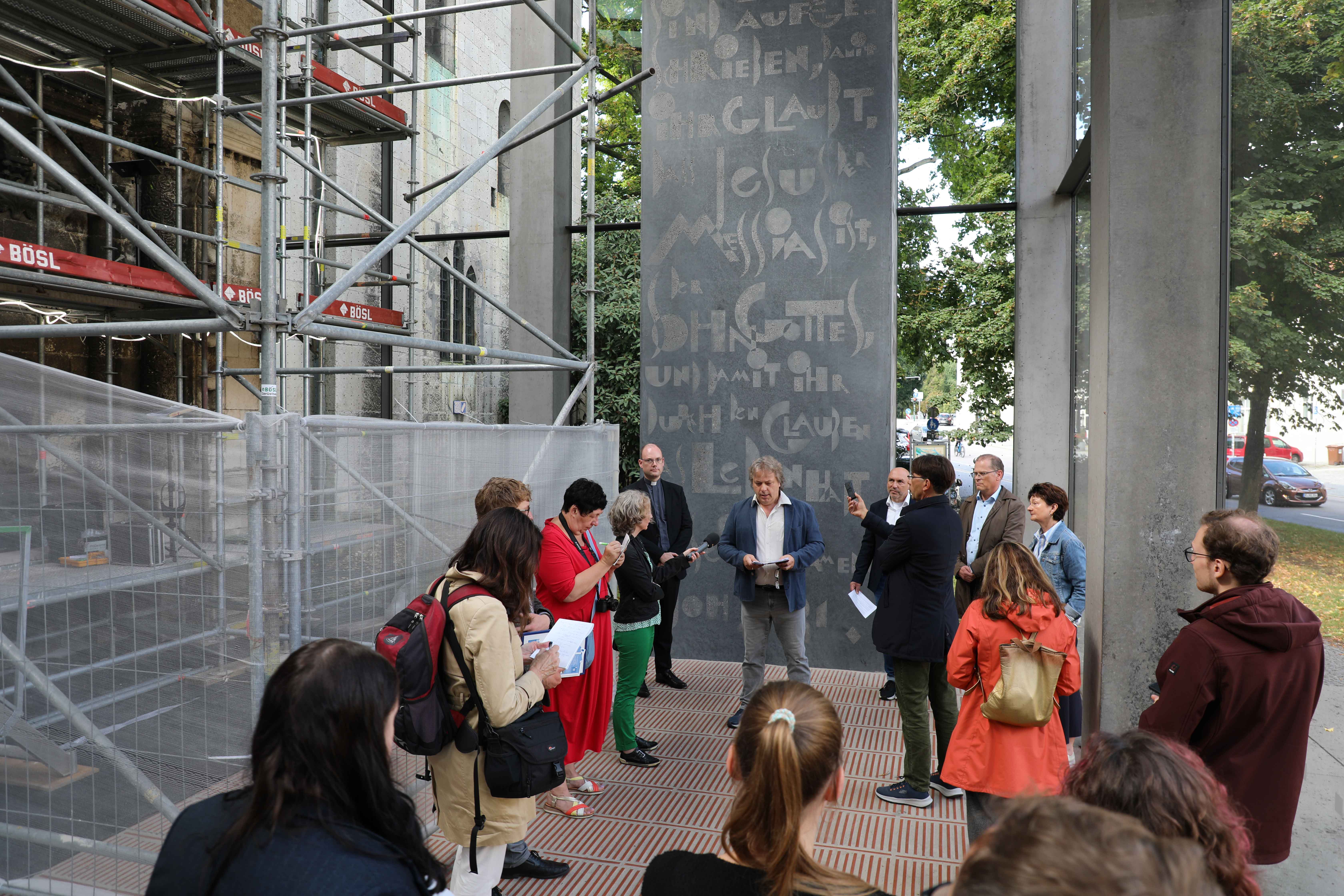 Am Freitag, den 29. August, hatte die Pressestelle des Bistums Regensburg gemeinsam mit dem bischöflichen Baudirektor Paul Höschl zu einer Besichtigung des weltberühmten Schottenportals in der Regensburger Altstadt eingeladen. Im Mittelpunkt der Gespräche mit den Fachleuten aus den verschiedenen Institutionen lag der Fokus auf den derzeitig stattfindenden Restaurierungsarbeiten. Auch ein Schutzkonzept gegen Vogelschlag am Glasportal wurde vorgestellt. Der Eigentümer des Portals, die „Besondere Klerikal-Seminarstiftung St. Jakob“, erhielt für dies Konzept vom Landesbund für Vogelschutz (LBV) die Auszeichnung „vogelfreundliche Glasfläche“.