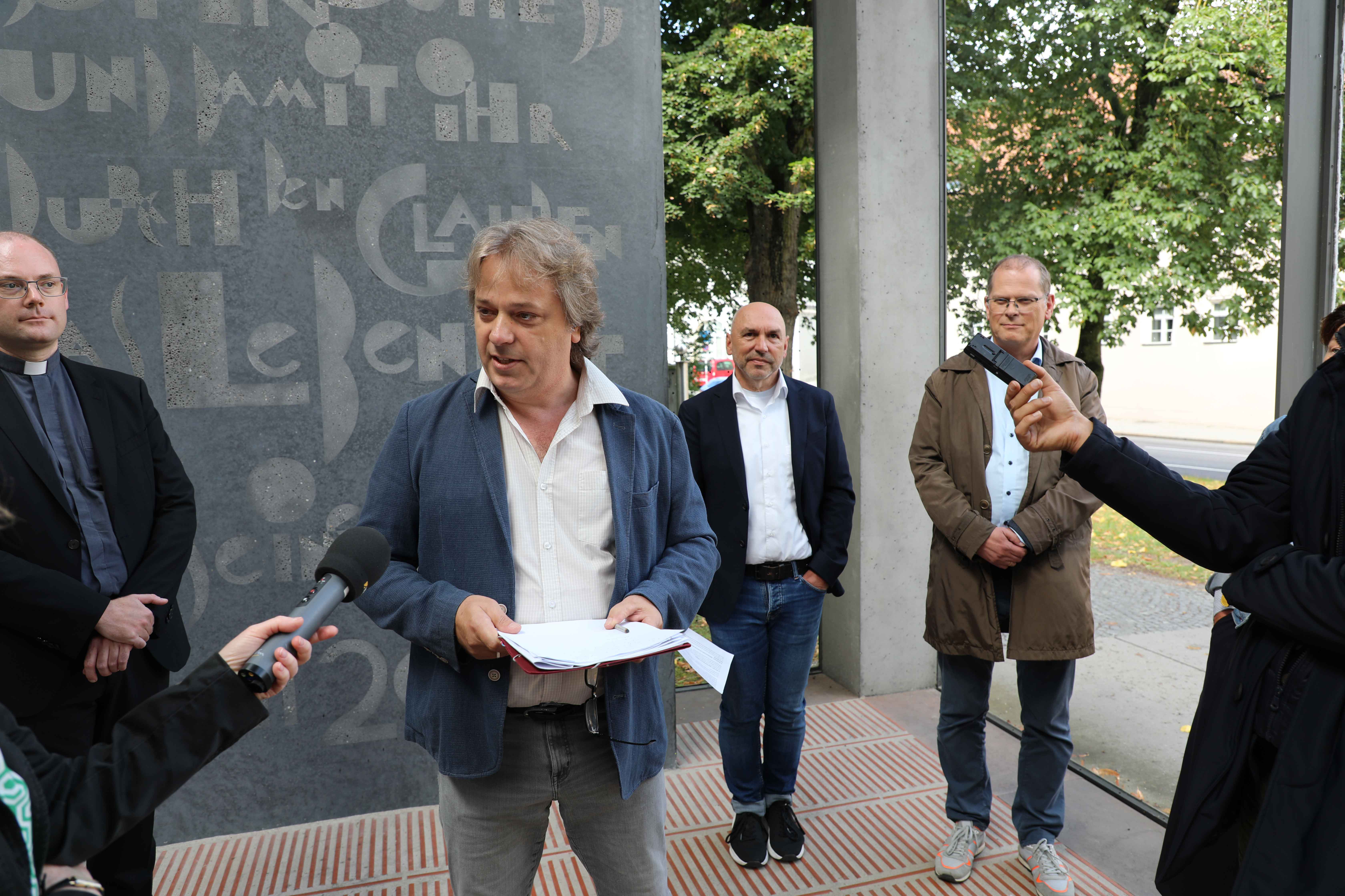 Regens Dr. Daniel Stark, Leiter des Priesterseminars St. Wolfgang, erinnerte in seinem Grußwort daran, dass die Schottenkirche kein Museumsbau, sondern ein lebendiges Gotteshaus sei. Seit über 150 Jahren diene sie als Seminarkirche, in der die angehenden Priester regelmäßig Gottesdienst feiern. Jeden Sonntag um 9 Uhr versammle sich zudem eine feste Gemeinde von außerhalb. Die Tradition reiche weit zurück: Bereits im 17. Jahrhundert wurden hier Seminaristen für Schottland ausgebildet. „Wir stehen in der Tradition der Schottenmönche. Es ist schön, dass wir dieses Erbe weiterführen dürfen – und dass das Schottenportal nun eine umfassende Restaurierung erfährt“, so Dr. Stark. „Die Kirche ist nicht nur ein Bauwerk, sie ist gelebte Geschichte und geistliches Zuhause. Unser Auftrag ist es, diesen Ort in seiner Schönheit und Botschaft zu bewahren“, so der Regens weiter.