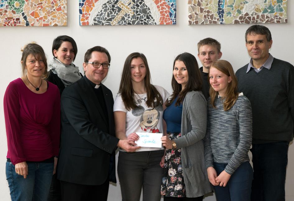 „Ihr habt großes Herz bewiesen und helft nun der Caritas, damit wir Gutes für andere tun können“, bedankte sich Diözesan-Caritasdirektor Dr. Roland Batz bei den anwesenden Schülervertretern und ihrer Lehrerin Carolin Rasp. Schulleiter Konrad Wacker betonte dabei die guten Kontakte zwischen der Caritas und seiner Schule: „Seit Jahren sind wir mit der Caritas eng verbunden und die Schüler der beiden Abschlussklassen wollten dies mit der Spende unterstreichen.“ Angesprochen auf die scheinbar so fremdenfeindliche Stimmung derzeit im Land, sagte Nina Müller, eine der spendenden Schülerinnen: „Das macht uns sehr traurig. Man sollte die Menschen erst einmal kennenlernen. Wir haben Kontakt zu jugendlichen Flüchtlingen. Die sind alle superfreundlich und nett. Toleranz hat auch was mit Aushalten von Unterschieden zu tun.“ Die Spende, so Batz, kommt der Kinderbetreuung in der Erstaufnahmeeinrichtung Regensburg zugute. Dort werden täglich mehr als 30 Kinder aus Irak, Syrien, Eritrea und der Ukraine betreut. „Wir machen dort den Kindern, die am allerwenigsten für irgendetwas können, eine kleine Freude“, so der Caritasdirektor.