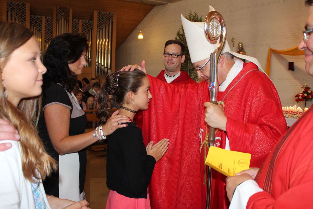 Pfarrer Klaus Haußmann begrüßte den hohen Gast, der der Einladung des Pfarrgemeinderats sehr gerne gefolgt war, zu Beginn des Festgottesdienstes. Bischof Rudolf trat zur Predigt mit dem Mikrofon nach vorne und sprach frei und direkt zu den aufmerksam lauschenden Menschen in der Kirche. Mit der Taufe hätten die Eltern der Firmlinge vor einem guten Jahrzehnt eine wichtige Entscheidung für ihre Kinder getroffen, eine von vielen weiteren. Neben dem Namen, der Muttersprache und dem Wohnort hätten sie grundsätzlich einmal eine Entscheidung für das Leben ihres Kindes gefällt. Die Kinder konnten sich das alles nicht selbst aussuchen, obwohl es „viel-leischt schö-närrr gewessen wärre, französ-sisch zu spräschen“, so der gut gelaunte Bischof am Altar. Er dankte den Eltern dafür, dass sie den Kindern mit der Taufe auch ein Glaubensfundament mitgegeben hätten und dass sie alles dafür tun, dass ihre Kinder eine gute Perspektive für ihr Leben haben. Zu Taufen bedeute, dem Kind die Hoffnung auf ein unzerstörbares Leben mit und bei Gott mitzugeben. Der Mensch könne das biologische Leben geben, das ewige Leben werde einem später geschenkt.