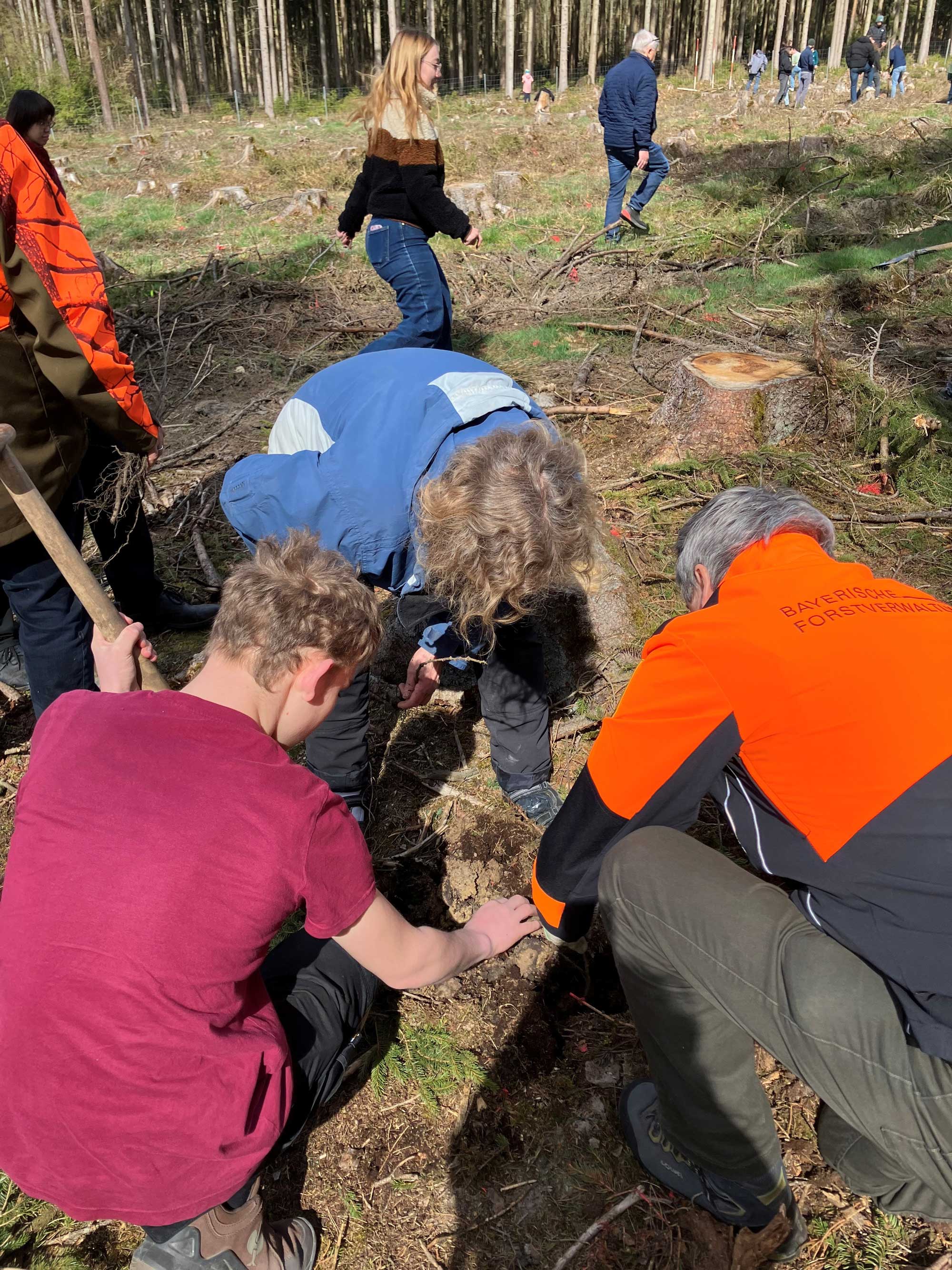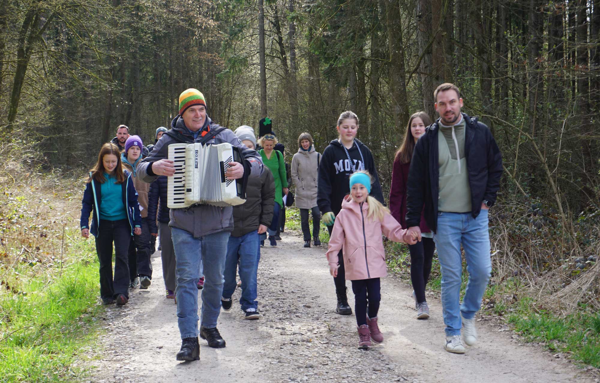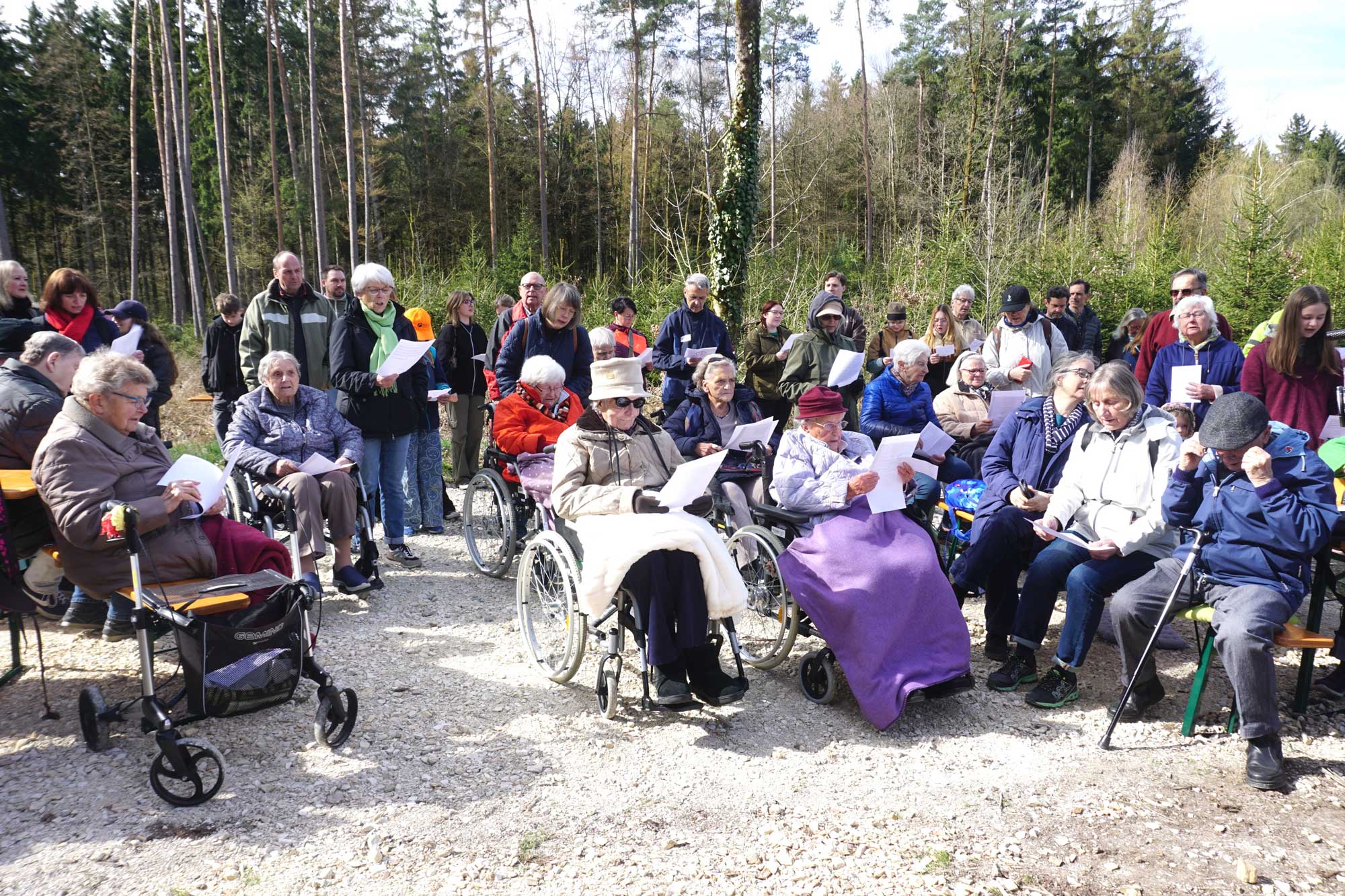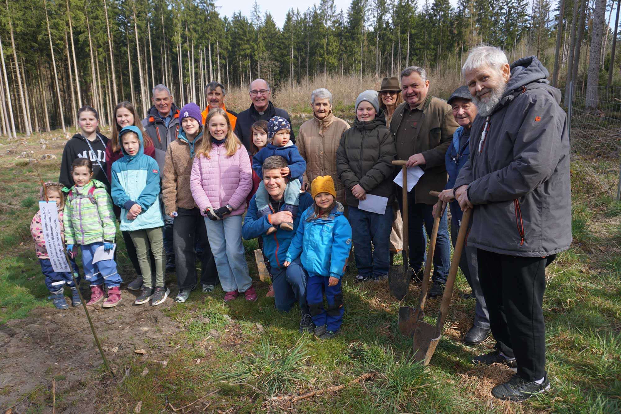 Bei der Spitalstiftung steht immer die Nächstenliebe und Fürsorge im Zentrum. Am Donnerstagvormittag beteiligten sich 16 noch teilweise mobile Pflegeheim-Bewohner am Festauftakt mit Wald. Sie wurden mit dem Bus direkt an die Lichtung am Anfang des Forstes gebracht, unterstützt von ehrenamtlichen Helfern, Mitarbeitern und Angehörigen. Alle anderen Festgäste wanderten das kleine Stück vom Parkplatz, musikalisch begleitet von Spitalrat Erich Tahedl am Akkordeon. Kinder der Grundschule Steinweg und Pfadfinder-Kinder pflanzten stellvertretend für die Senioren die kleinen Bäumchen. Die Kinder sangen für die Gäste und die Theatergruppe der Pflegeheim-Bewohner präsentierte ein kleines Theaterstück direkt vor der Pflanzfläche. Auf winzigen Baumscheiben malten Gäste ihre Namen und kennzeichneten so ihren frisch gepflanzten Baum. „Den können wir später besuchen“, freuten sich die Kinder.