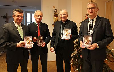 „Freude am Wort Gottes“, so heißt die überarbeitete Handreichung zum Lektorendienst, die Diözesanobmann Michael Meier mit Udo Süß von der Stefanus-Gemeinschaft in der Diözese Regensburg am Donnerstag Bischof Rudolf Voderholzer überreichen konnten. Ebenfalls anwesend war Diakon Nickl vom Referat Liturgie im Bistum Regensburg – er stand dem Autorenteam beratend zur Seite. Das mehr als 50 Seiten umfassende Heft gibt den im Lektorendienst Tätigen praktische Tipps vom Umgang mit Lampenfieber, über Atmungstechniken, Verhaltensformen bis hin zur Leseordnung in der Messfeier und Grundwissen über die Heilige Schrift. „Wer in der Feier der Liturgie den Lektorendienst übernimmt, stellt sich zur Verfügung als Sprachrohr Gottes“, betonte Bischof Voderholzer, der für die Handreichung auch ein Geleitwort beisteuerte. Sein Dank galt daher auch den Mitarbeitern der Stefanus-Gemeinschaft:“ Ich danke Ihnen für Ihren wertvollen Dienst am Wort Gottes und wünsche Ihnen, dass Sie in der Kraft des Heiligen Geistes immer tiefer eindringen in das Geheimnis des fleischgewordenen Wortes Gottes, von dem die ganze Bibel spricht.“