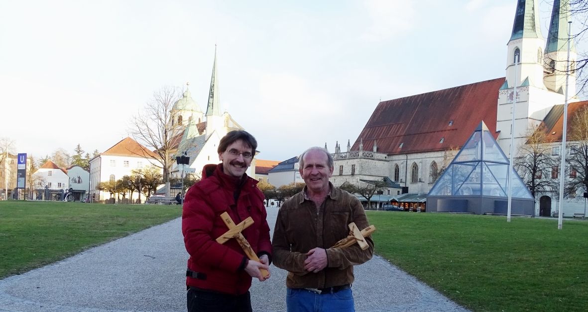 Genauer gesagt, wurde die meisten, nämlich rund 45, mit einem Korpus des gekreuzigten Christus versehen. Weitere 20 Kreuze wurden ähnlich der Vorlage neu aus Holz angefertigt. Für diese handwerklichen Arbeiten fand Schulleiter Günter Jehl in Altötting mit Leopold Duffek nicht nur einen äußerst kompetenten Partner, sondern auch einen großen Förderer der DJDS. Leopold Duffek, der in Altötting am Kapellplatz mehrere Devotionalienläden betreibt, montierte nicht nur mit viel Hingabe je einen Korpus auf die alten Holzkreuze, sondern stellte für diese stundenlange Arbeit auch keinen Arbeitslohn in Rechnung. „Eine kirchliche Schule, an der Kruzifixe aufgehängt werden, muss ich einfach unterstützen“, so Leopold Duffek.