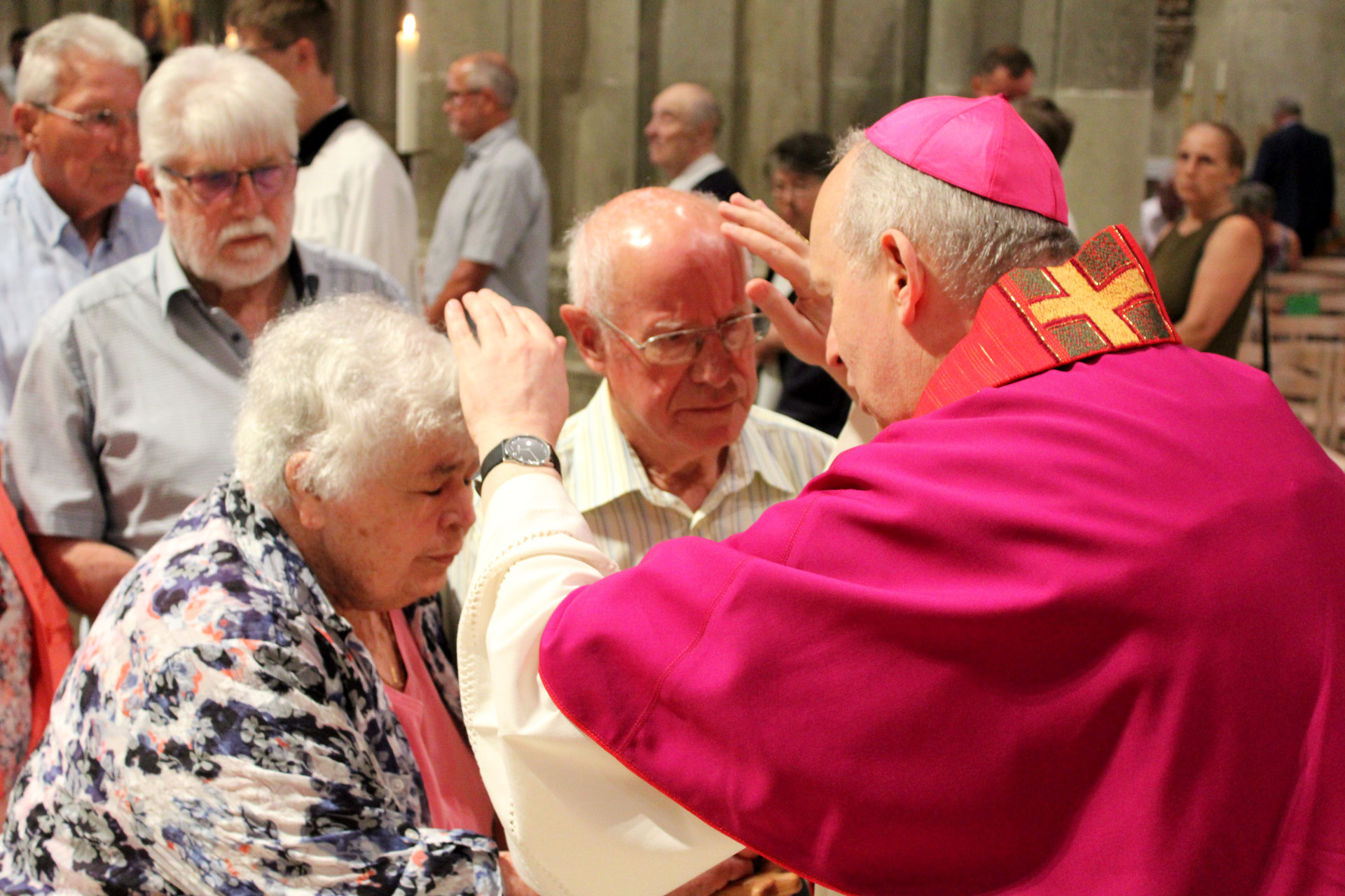 Der Bischof sprach den Ehejubilaren seinen tiefen Dank für ihr beeindruckendes und öffentliches Zeugnis einer treuen und langjährigen Partnerschaft aus. Sie geben „mit Ihrer ganzen Existenz in der Herzmitte unserer Kirche“ ein ermutigendes Zeichen, das nicht nur für junge Menschen eine wichtige Orientierung ist. „Auch für uns Bischöfe und Priester, ich darf das offen bekennen, sind die Tage der Ehejubilare im Dom Tage großer Freude und Ermutigung.“ Zum Abschluss verband Bischof Rudolf seinen Segen mit einem klaren Wunsch: „Auf noch viele Jubiläen!“