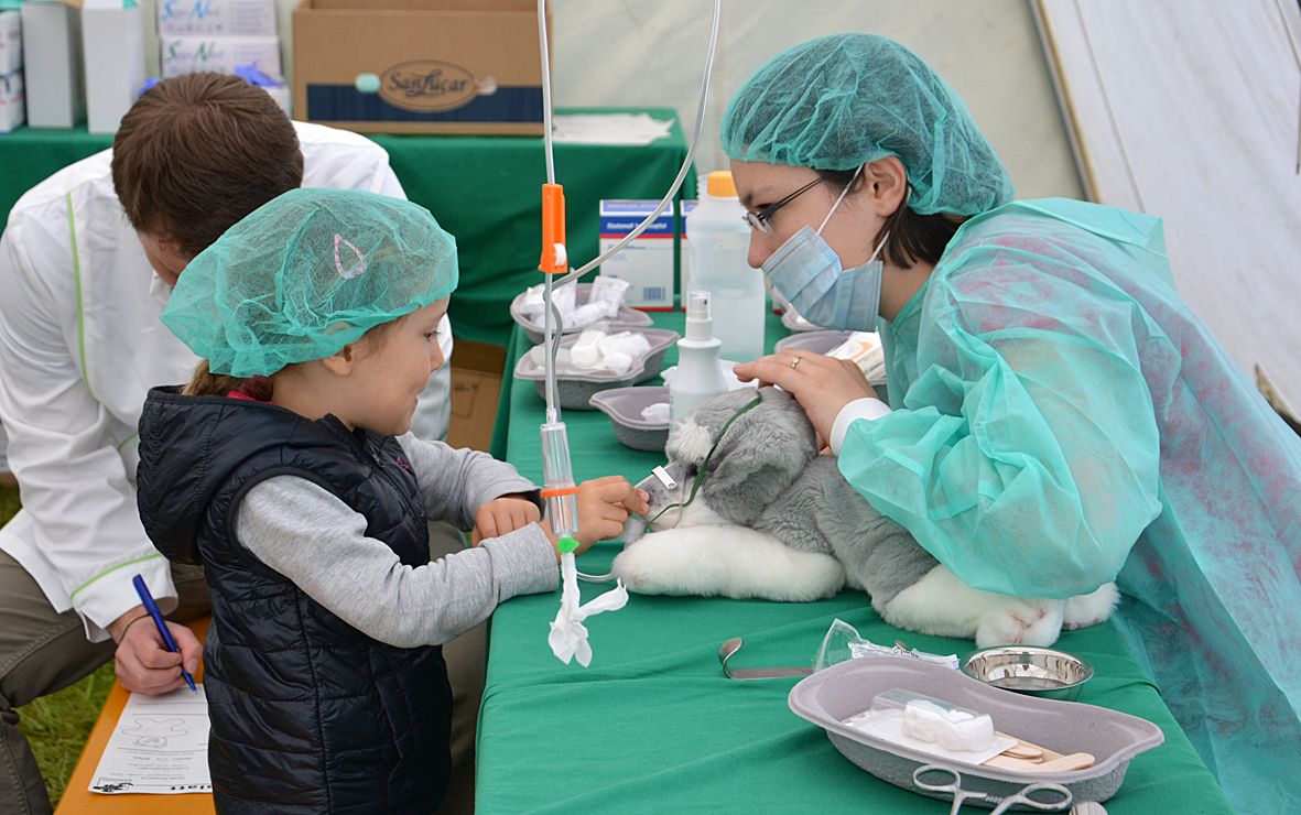 „Der Ablauf ist eigentlich wie in einem richtigen Krankenhaus“, erläutert Medizinstudentin Antonia Pausch. Sie ist eine der Organisatorinnen der Teddyklinik. Zuerst müssen die Teddy-Eltern ihre kuscheligen Lieblinge anmelden und Name, Gewicht und natürlich die Beschwerden nennen. Nach kurzer Zeit im Wartebereich, in dem gespielt und gemalt werden kann, kommen die Patienten schließlich in Begleitung ihrer Teddy-Eltern in die Untersuchungs-Zelte. Hier betreut je ein Medizinstudent ein Kind. Kleinere Blessuren und Brüche werden im Behandlungsraum verarztet. Schwere Kuscheltierkrankheiten behandeln die Teddy-Docs zusammen mit den Kindern im OP-Zelt. Kittel, OP-Kleidung und Mundschutz dürfen natürlich nicht fehlen. Bei Zahnschmerzen hilft der Teddy-Zahnarzt. Wenn das Kuscheltier dann erst einmal versorgt ist und auf dem Weg der Besserung, können die kleinen Eltern in der Teddy-Apotheke noch „Medikamente“ wie Obst, Saft oder Gummibärchen abholen. „Nicht nur die Kinder haben Freude an der Teddyklinik. Auch für uns Studenten ist sie eine interessante Abwechslung zum Studium, die uns spielerisch an unseren späteren Beruf heranführt“, findet Antonia Pausch.