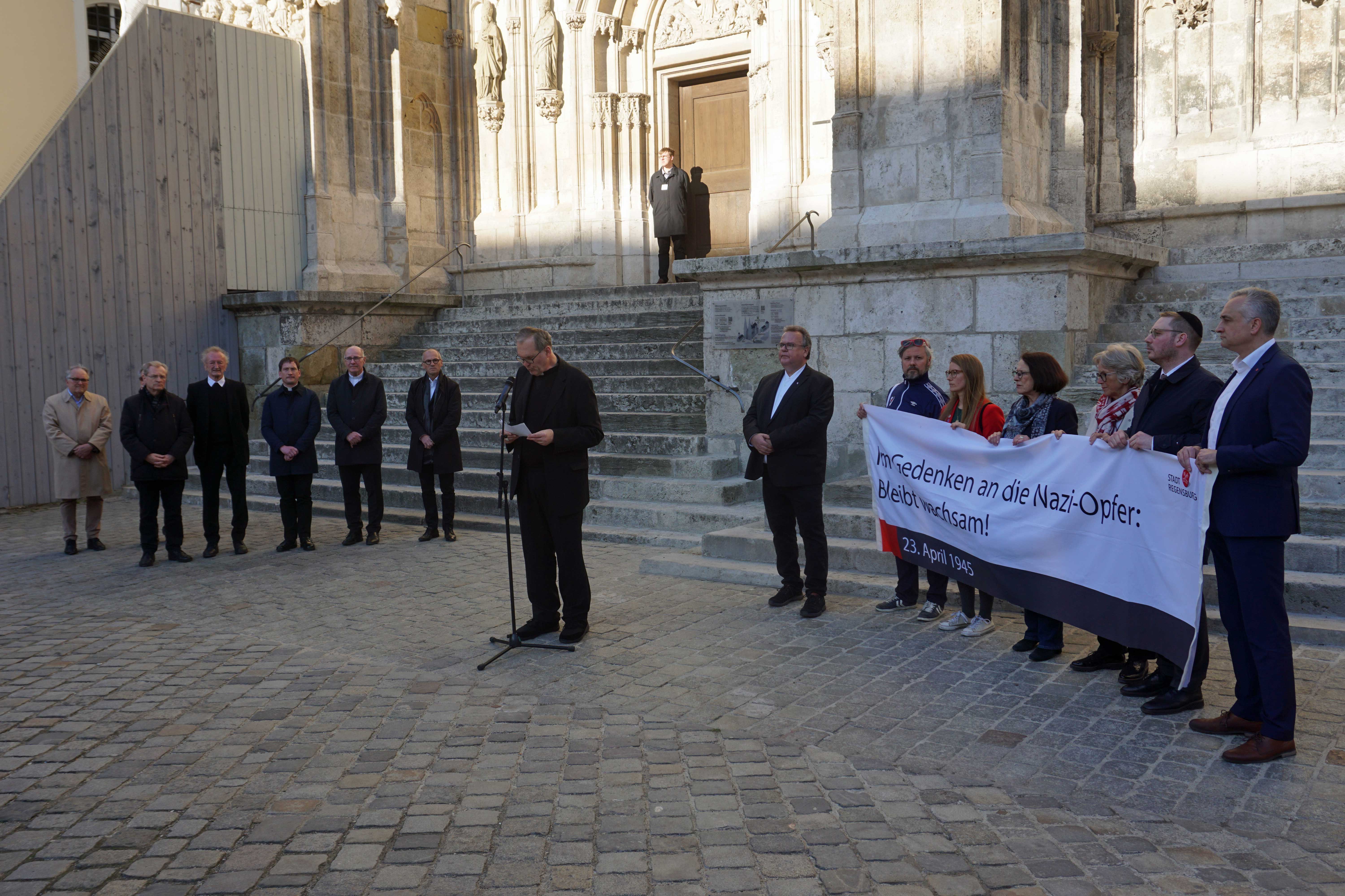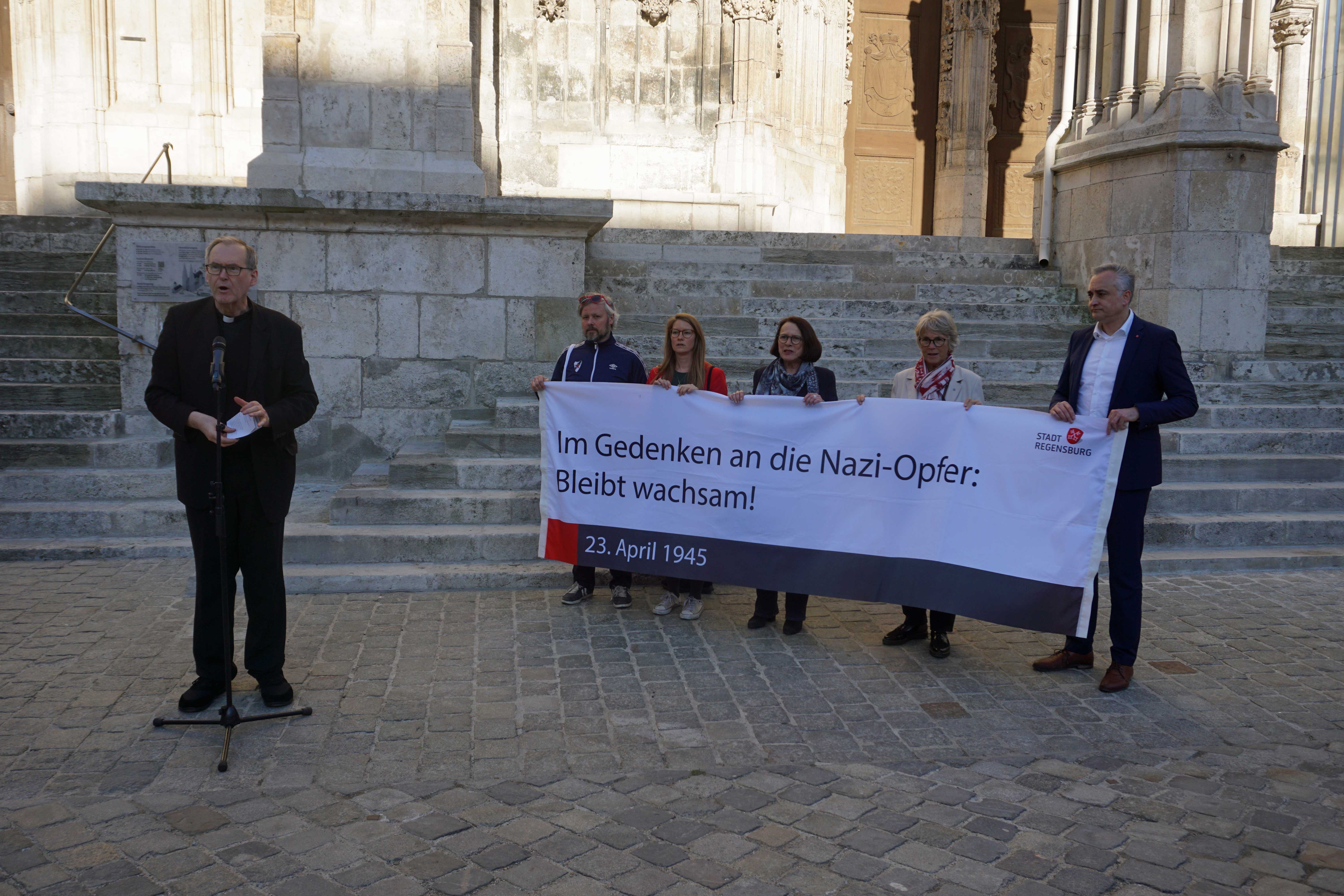 Weihbischof Josef Graf beteiligte sich zusammen mit der Oberbürgermeisterin und weiteren Vertretern aus Politik und Glaubensgemeinschaften am Gedenkweg. Am Westportal des Doms sprach er zu den Teilnehmern. Graf erinnerte an die Demonstration 1945 am Dachauplatz und an Domprediger Johann Maier und die Geschehnisse. "Heute, 81 Jahre nach diesen furchtbaren Ereignissen, erinnern wir uns an den Mut vieler Regensburgerinnen und Regensburger, die sich um das Wohl ihrer Kinder und ihrer Stadt mit den vielen Verwundeten und Kriegsversehrten in den Lazaretten sorgten", sprach Josef Graf zu den Zuhörern. "Eine größere Liebe hat niemand als diese, dass er sein Leben hingibt für seine Freunde", zitierte Graf den Satz aus dem Johannesevangelium, der sich auf dem Gedenkstein für Johann Maier im Dom findet. Graf ermunterte die Teilnehmer, sich von Menschen wie Domprediger Maier inspirieren zu lassen und nicht zu schweigen, wenn Menschenrechte mit Füßen getreten würden
