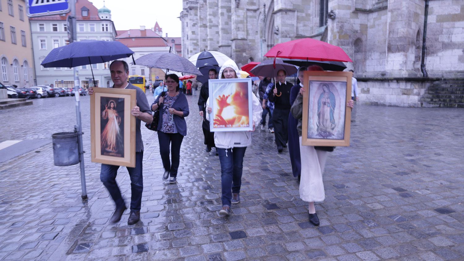 Donnerstagvormittag fand im Stadtzentrum von Regensburg die „Vigil für die ungeborenen Kinder“ statt, die traditionell am letzten Tag des Monats in der Domstadt gefeiert wird. Gemeinsam mit Pfarradministrator H.H. Maximilian Korn, C.R.V. (Paring) nahmen rund 50 Gläubige an einer stimmungsvollen Heiligen Messe in der Kirche St. Johann teil. Im Anschluss gingen die engagierten Christen trotz ströhmenden Regens in einer friedlichen Gebetsprozession durch die Regensburger Innenstadt, um in Rosenkranzgebet und Gesang vertieft auch für Außenstehende sichtbar für den Schutz jeden menschlichen Lebens einzutreten.