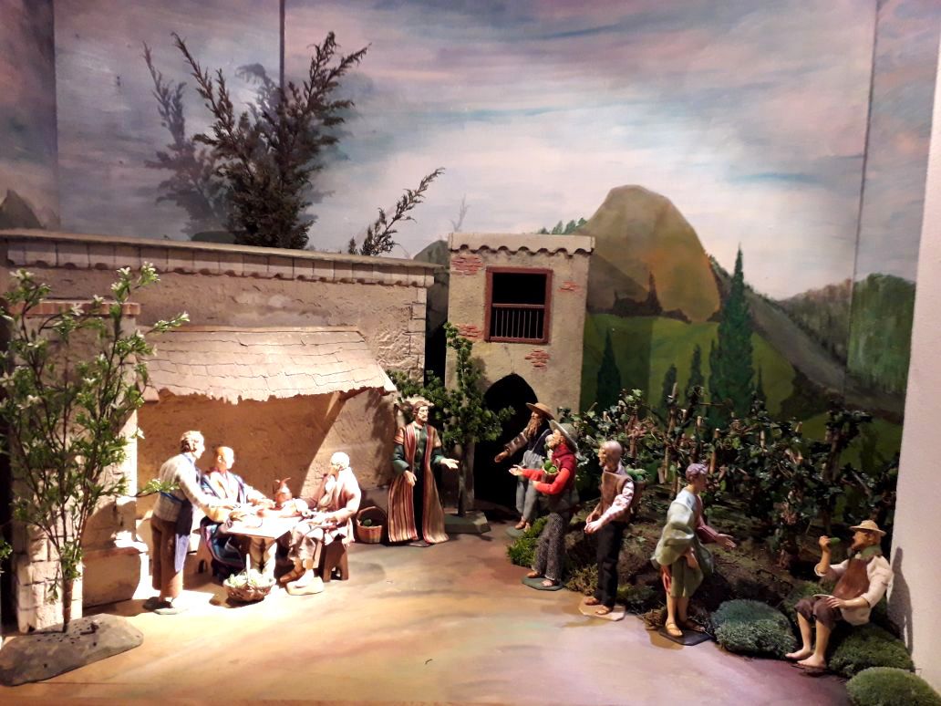 Darstellung aus der Jahreskrippe in St. Stephan Alburg-Straubing. Erst am Sonntag wurde in unseren Kirchen dieses Evangelium aus Matthäus 20,1-16a vorgetragen. Matthäus ist das erste der vier Evangelien in der Bibel zu Beginn des Neuen Testaments. Das Thema – Neid, wenn andere Güte erfahren – lässt an Menschen denken, die froh sind, wenn sie in Deutschland gut aufgenommen werden. Und andere, die ihnen das nicht gönnen möchten.