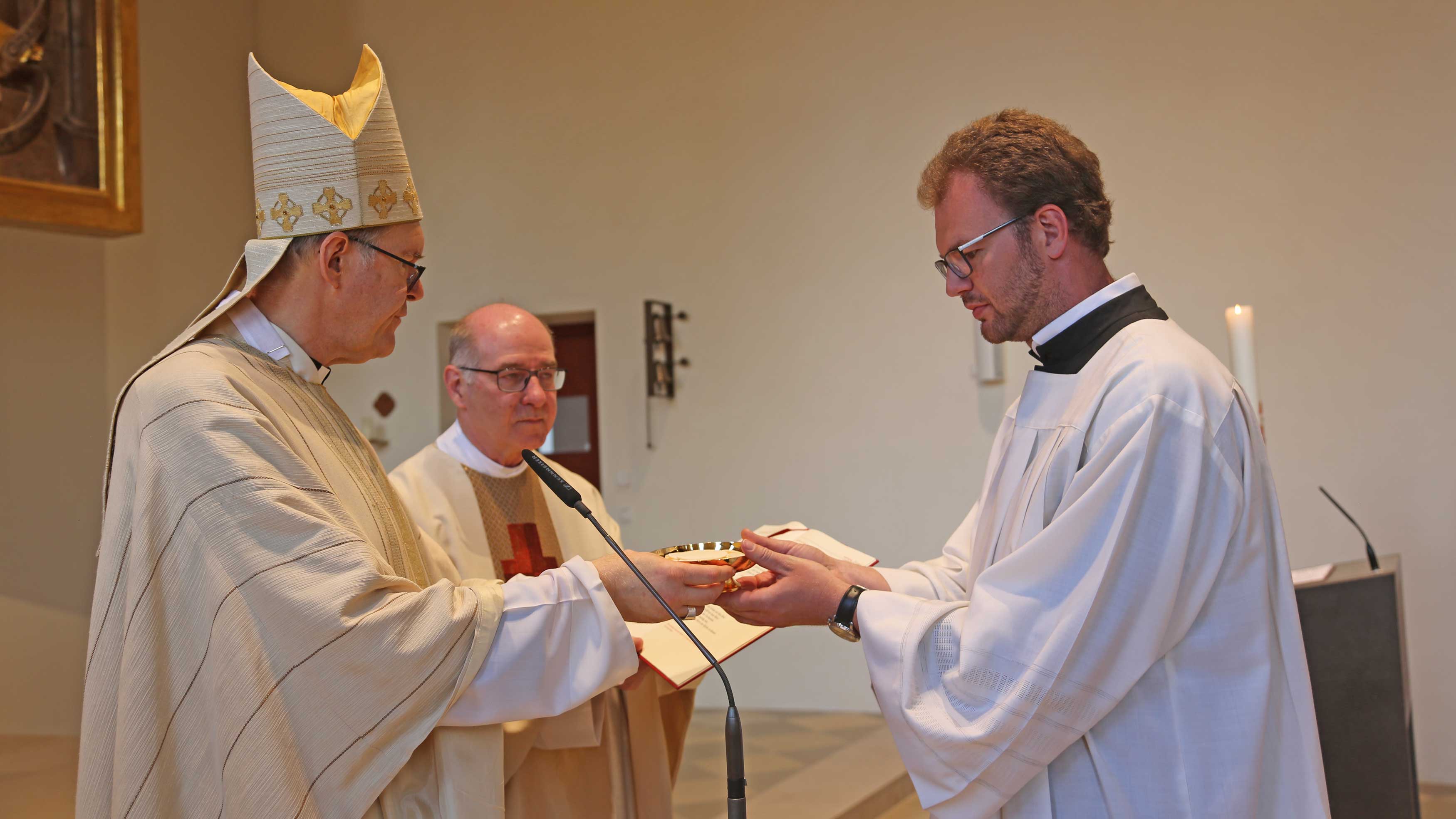 Direkt nach der Predigt rief Dompropst Dr. Frühmorgen dann die beiden Kandidaten zur Beauftragung zum Akolythen auf: Martin Bartlreiher, Pfarrei Schwarzach-St. Martin, und Martin Reiger, Pfarrei Regensburg-St. Konrad. Auch hier folgte dem Segen des Bischofs und seinen Aussendungsworten ein ausdeutender Ritus, die Überreichung der Hostienschale. Diese wurde dann auch direkt mit den anderen Gaben zum Altar gebracht, den Diakon Sebastian Aichner vorbereitete, damit dann der Weihbischof mit den Konzelebranten die Eucharistiefeier zelebrieren konnte. Ein drittes Mal hatte Prälat Dr. Frühmorgen in seiner Funktion als Leiter der Hauptabteilung Pastorales Personal die schöne Aufgabe, die Kandidaten für die Admissio, die Aufnahme in den Kreis der Weihekandidaten für die Diakonenweihe im Oktober dieses Jahres aufzurufen: