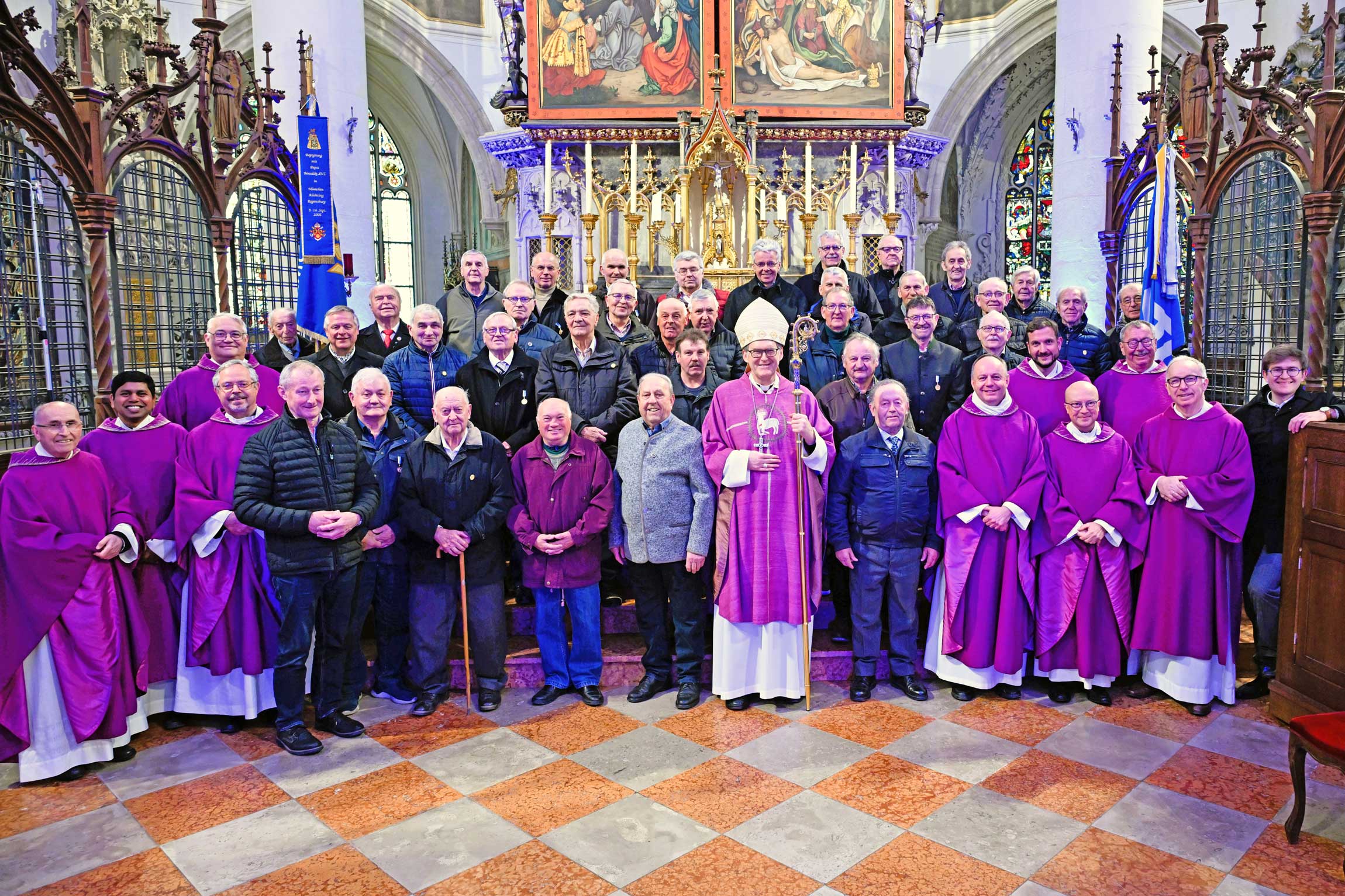 Als Hauptzelebrant stand Weihbischof Dr. Josef Graf dem Gottesdienst vor. Ihm zur Seite stand eine große Zahl an Mitbrüdern im priesterlichen Dienst: Zentralpräses BGR Georg Dunst, Stadtpfarrer P. Martin Müller, Schulseelsorger P. Philipp Schmidbauer, Kaplan Naresh Babu Marpu, Monsignore Thomas Schmid (MMC Regensburg), Militärseelsorger Werner Maria Heß (ehemaliger Zentralpräses der MMC Straubing), Ruhestandspfarrer Franz Alzinger sowie Prof. Dr. Johannes Brantl (ein gebürtiger Rinchnacher, jetzt Professor in Trier), assistiert von Diakon Rupert Loichinger. Ein besonderer Ehrenplatz war den Jubelsodalen vorbehalten, von denen einige bereits vor beeindruckenden 80 Jahren ihren Bund mit der Gottesmutter geschlossen hatten – ein lebendiges Zeugnis lebenslanger Treue.