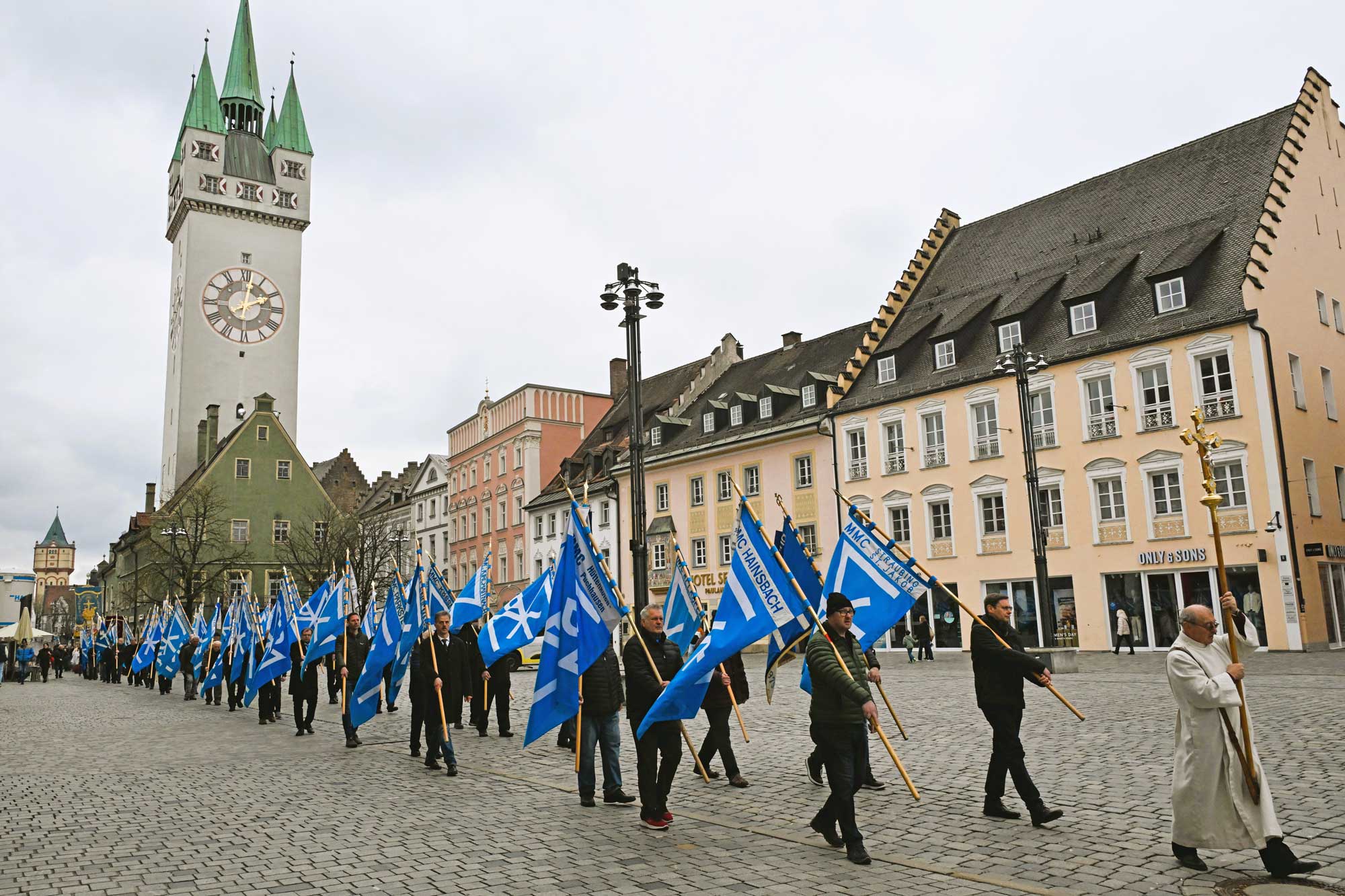 Den krönenden Abschluss bildete das öffentliche Glaubenszeugnis auf dem Straubinger Stadtplatz. Angeführt vom Kreuz und begleitet von über 50 wehenden weiß-blauen Bannern der Pfarrgruppen, bewegte sich ein imposanter Zug durch das Herz der Stadt. Inmitten der mehreren hundert Männer trug Weihbischof Dr. Josef Graf das Allerheiligste unter dem Baldachin. Flankiert von zahlreichen Priestern, Ministranten und Ehrengästen – darunter MdL Josef Zellmeier und Altlandrat Alfred Reisinger – wurde Christus buchstäblich „in die Welt hineingetragen“. Mit dem gemeinschaftlichen Gebet um den Frieden und dem feierlichen eucharistischen Segen endete dieser geschichtsträchtige Tag. Die Männer der MMC nehmen den Auftrag mit nach Hause: Das Licht, das sie in der Basilika entzündet haben, nun in ihre Familien und an ihre Arbeitsstätten zu tragen.