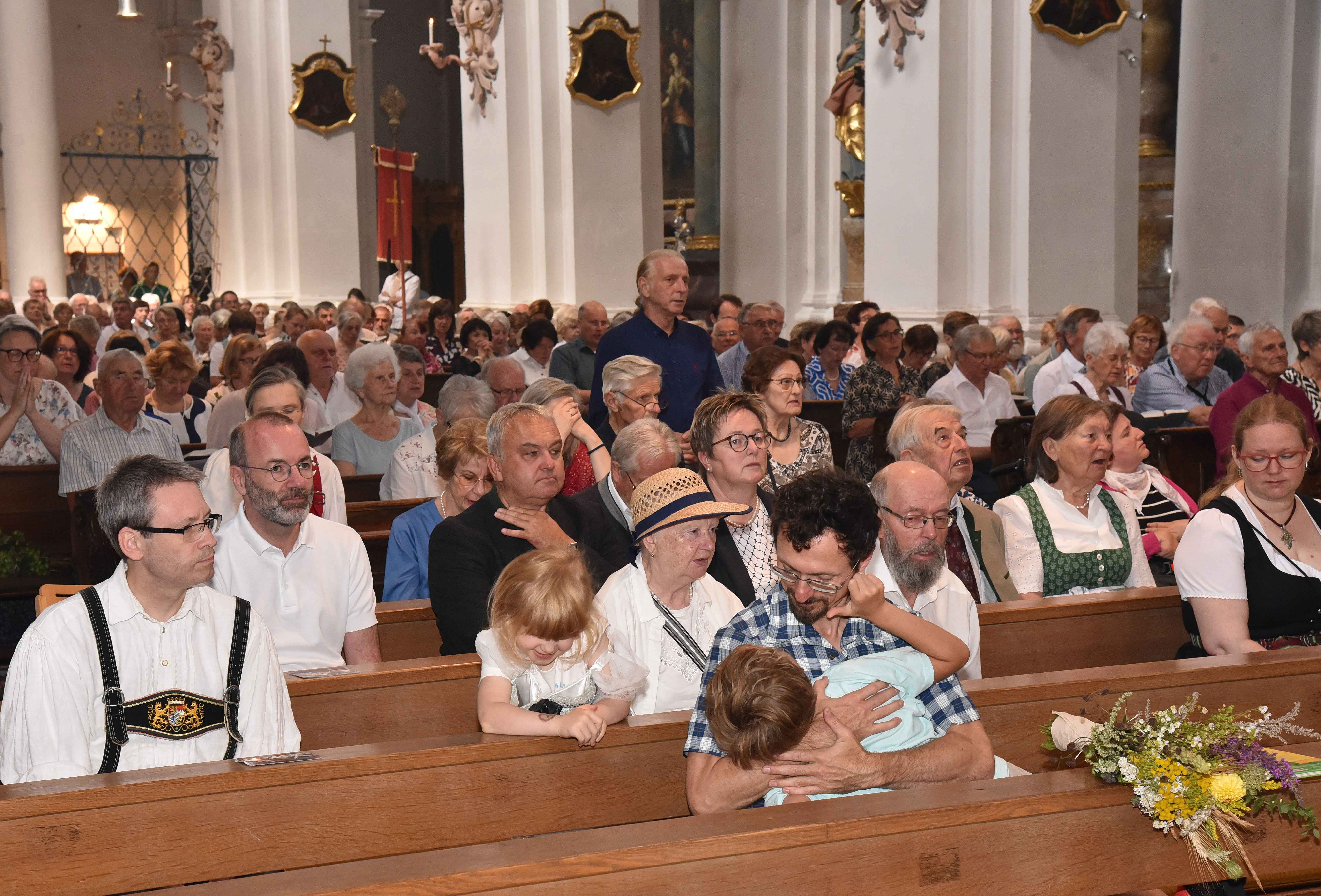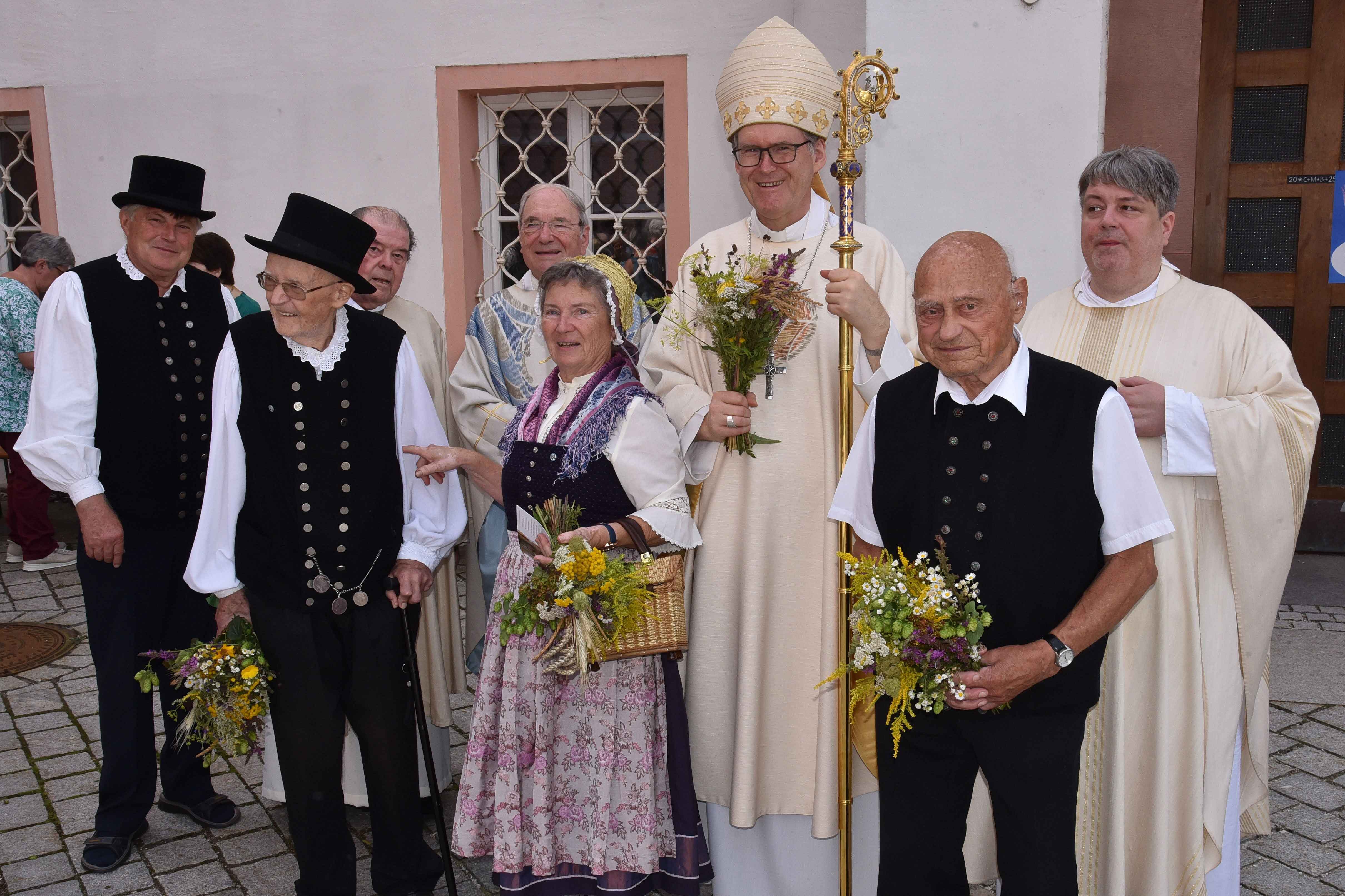 Zum Abschluss der Messfeier, die vom Rohrer Kirchenchor unter der Leitung von Anna Roider aus Laberweinting in Vertretung von Daniel Harlander musikalisch eindrucksvoll gestaltet wurde, segnete Weihbischof Graf die nach altem Brauch mitgebrachten Kräuterbuschen. Beim Verlassen des Gotteshauses wurde der Weihbischof auf dem sonnigen Kirchplatz von den Braunauer Heimatgruppen in ihren prachtvollen Trachten empfangen. Mit besonderer Freude begrüßte der Weihbischof den Vorsitzenden der EVP im Europäischen Parlament, Manfred Weber, der als Vorsitzender des Fördervereins der Benediktinerabtei Rohr zu den Stammgästen bei der Feier des Kirchenpatroziniums in Rohr zählt.