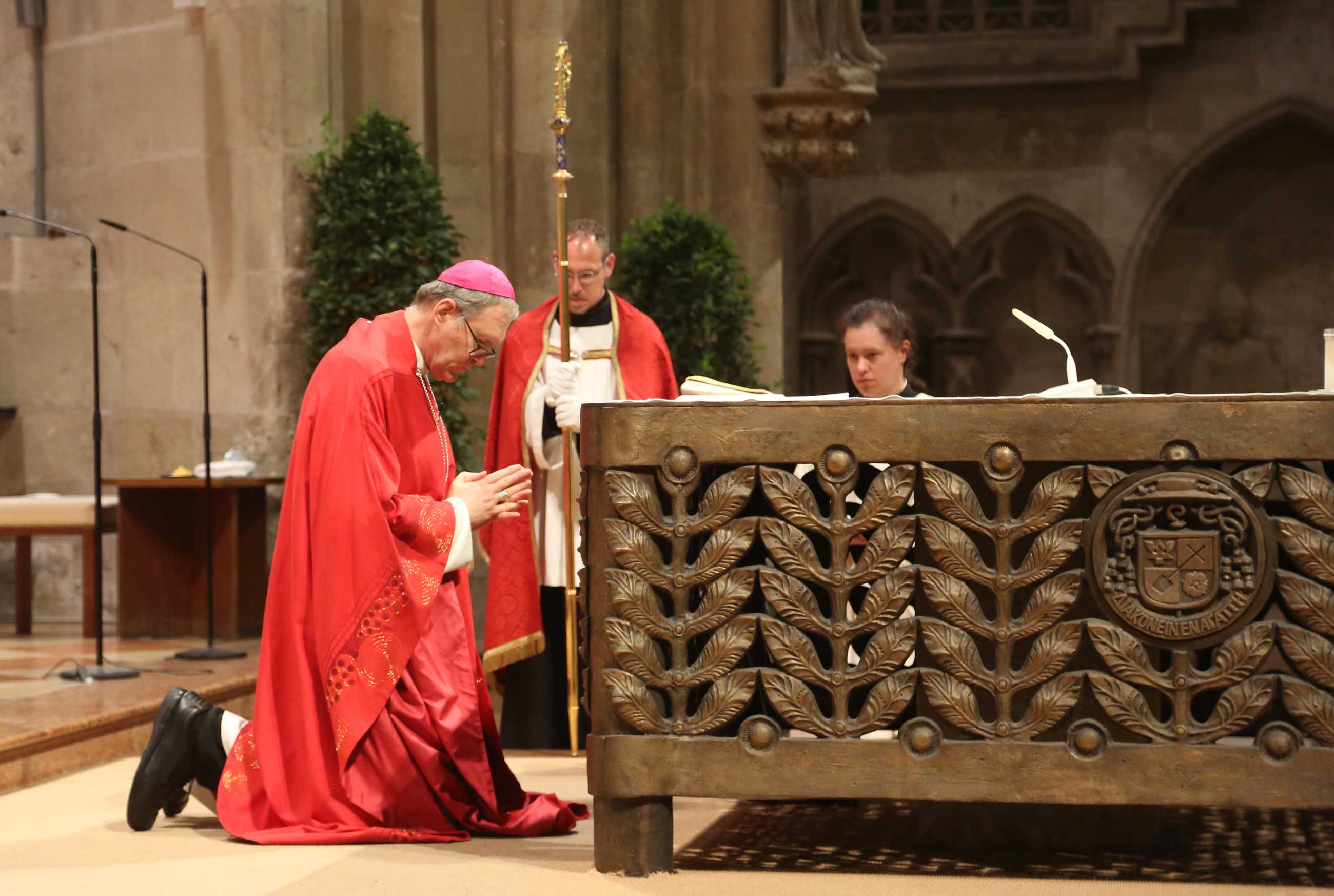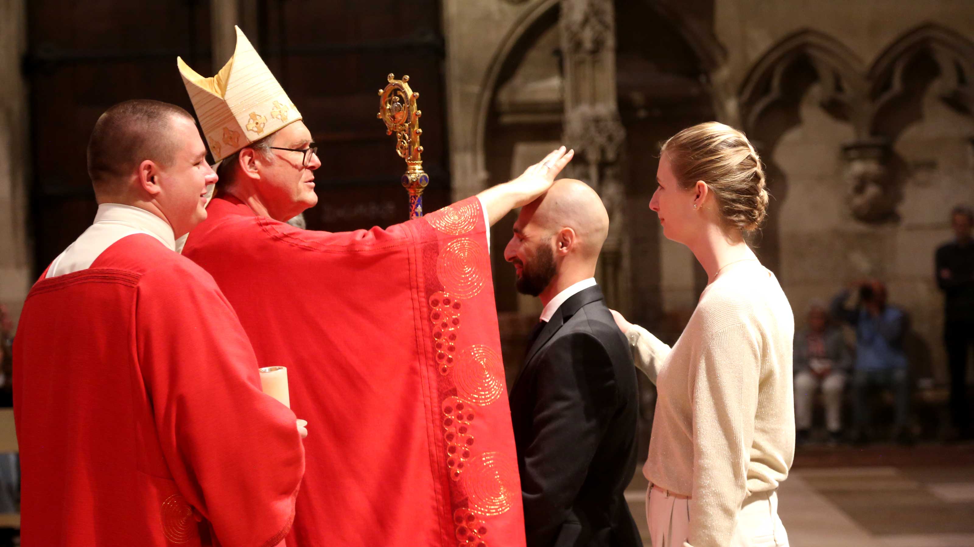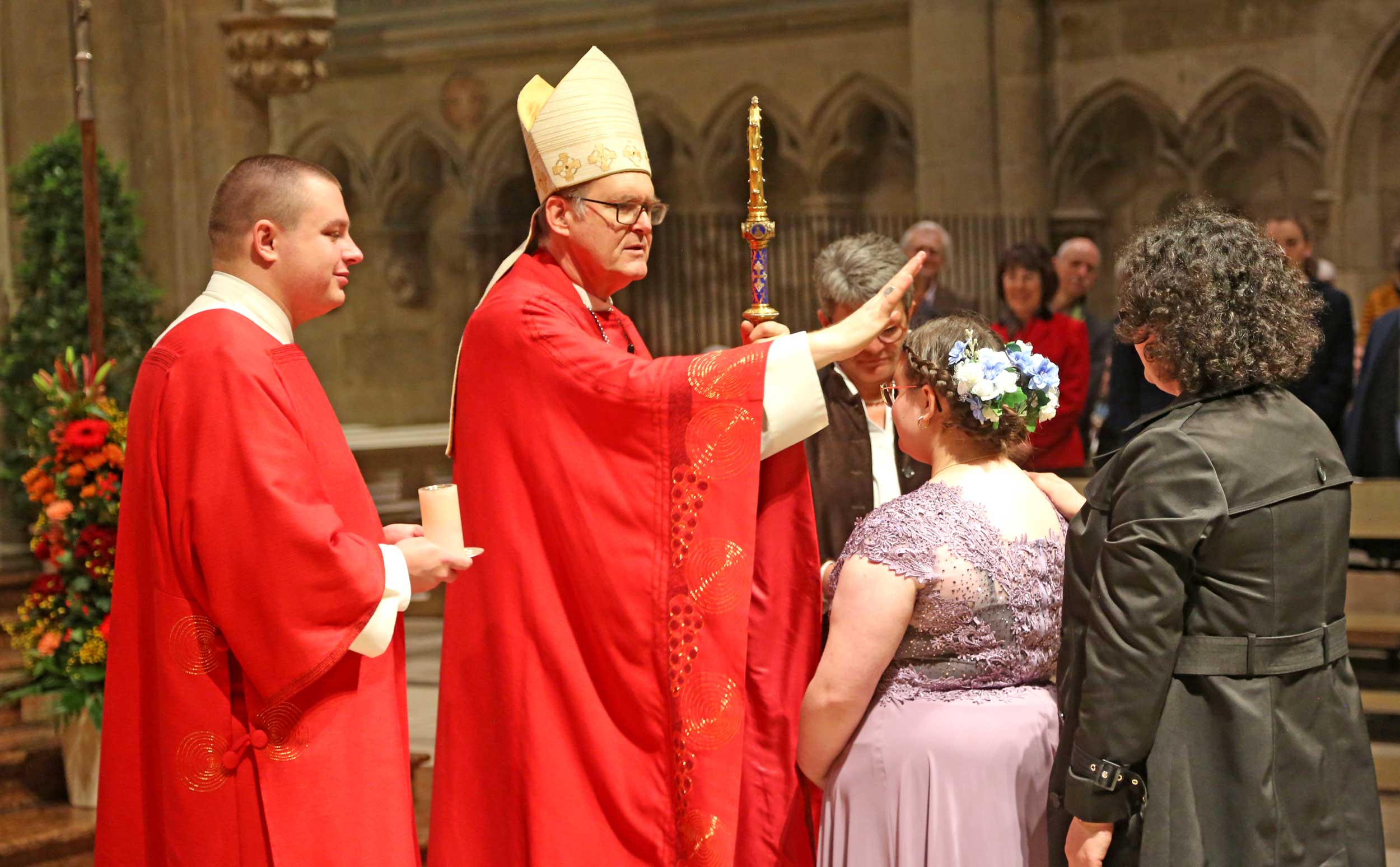 Nach der Predigt legten die Firmbewerberinnen und -bewerber vor dem Weihbischof und der ganzen Gemeinde ihr Taufbekenntnis ab, was durch den Gemeindegesang „Fest soll mein Taufbund immer stehen“ bekräftigt wurde. Unter dem Läuten der größten Domglocke, rief der Weihbischof, am Altar kniend, den Heiligen Geist auf die Kandidatinnen und Kandidaten herab. Danach traten alle mit ihrem Paten oder ihrer Patin vor ihn und mit Salbung der Stirn mit Chrisamöl und dem Auflegen der Hände spendete er ihnen das Sakrament der Firmung. „Sei besiegelt durch die Gabe Gottes, den Heiligen Geist!“, sprach er dabei. Die Paten standen jeweils dahinter und legten die rechte Hand auf die rechte Schulter des Sakramentenempfängers. Oft übernahm die Patenschaft ein Elternteil oder Geschwister, aber auch Ehepartner oder Freunde waren dabei. Alter und Herkunft waren sehr bunt, vom Teenager bis zum Senioren, aus Deutschland, Polen, Ungarn und Italien z.B. daheim, hatten alle eines gemeinsam: Sie leben im Bistum Regensburg und haben als ganz bewussten Schritt in ihrem Glaubensleben sich auf die Firmung vorbereitet. Der Weihbischof ließ es sich nicht nehmen, mit jedem der 28 Gefirmten und deren Paten noch ein paar persönliche Worte zu wechseln.
