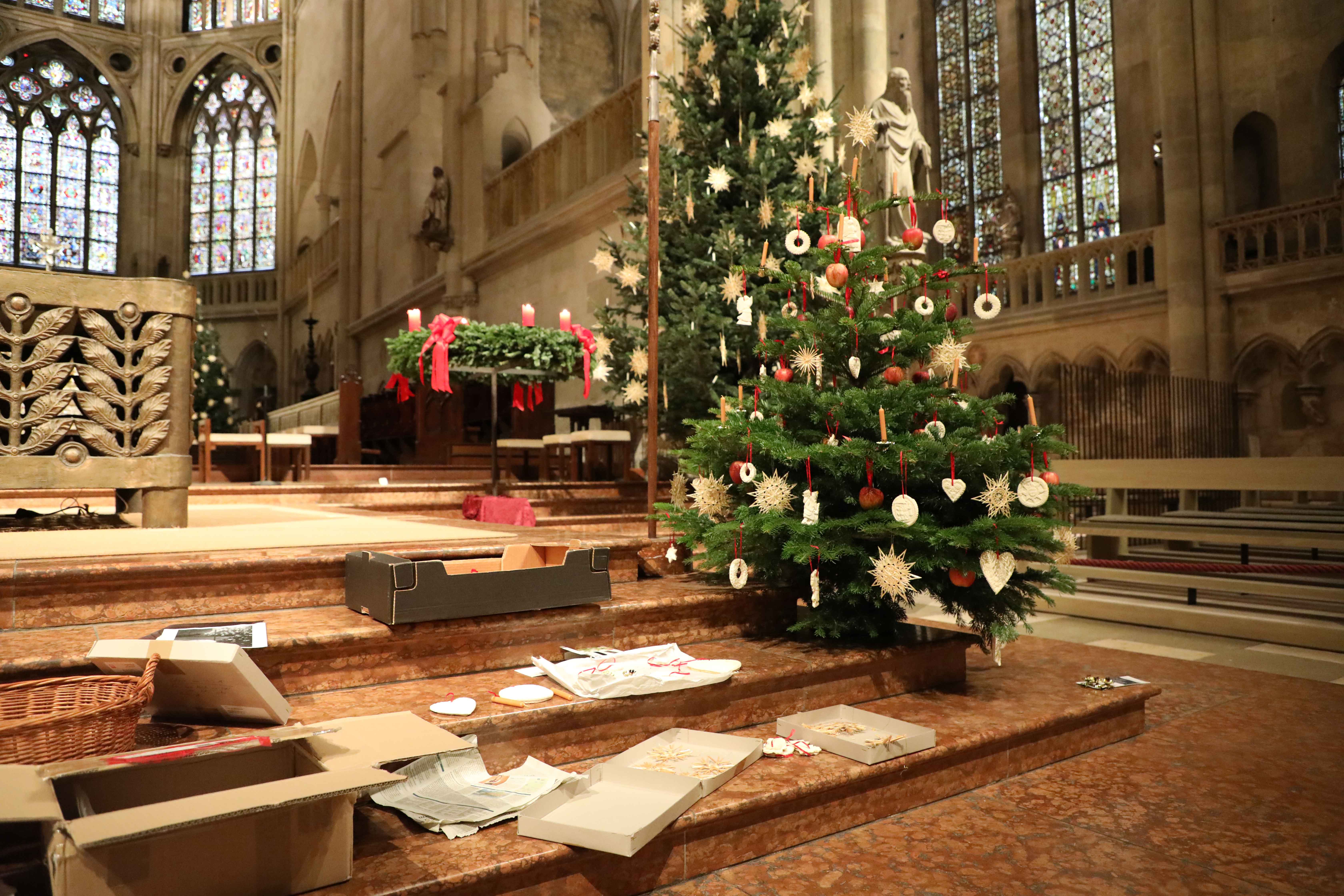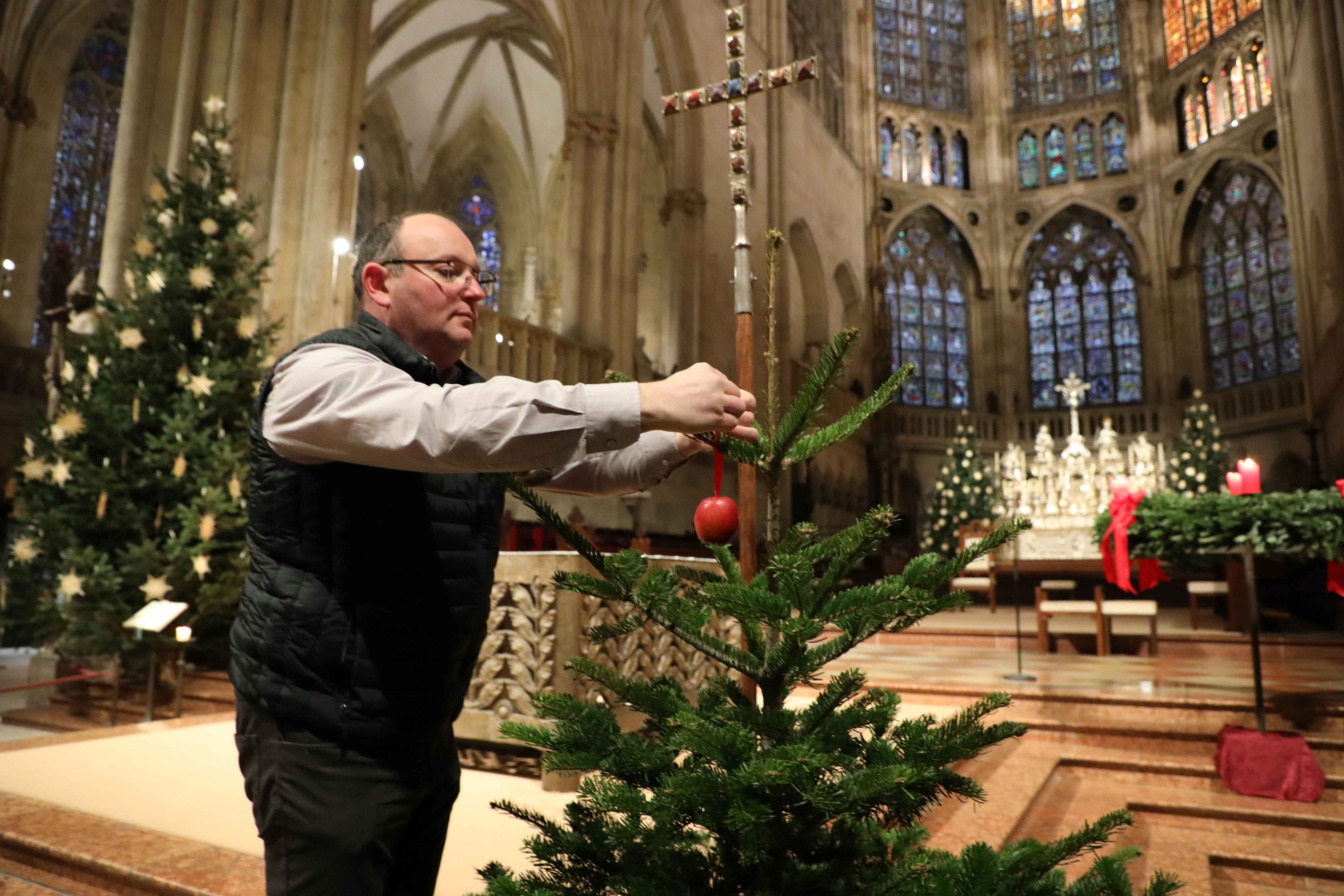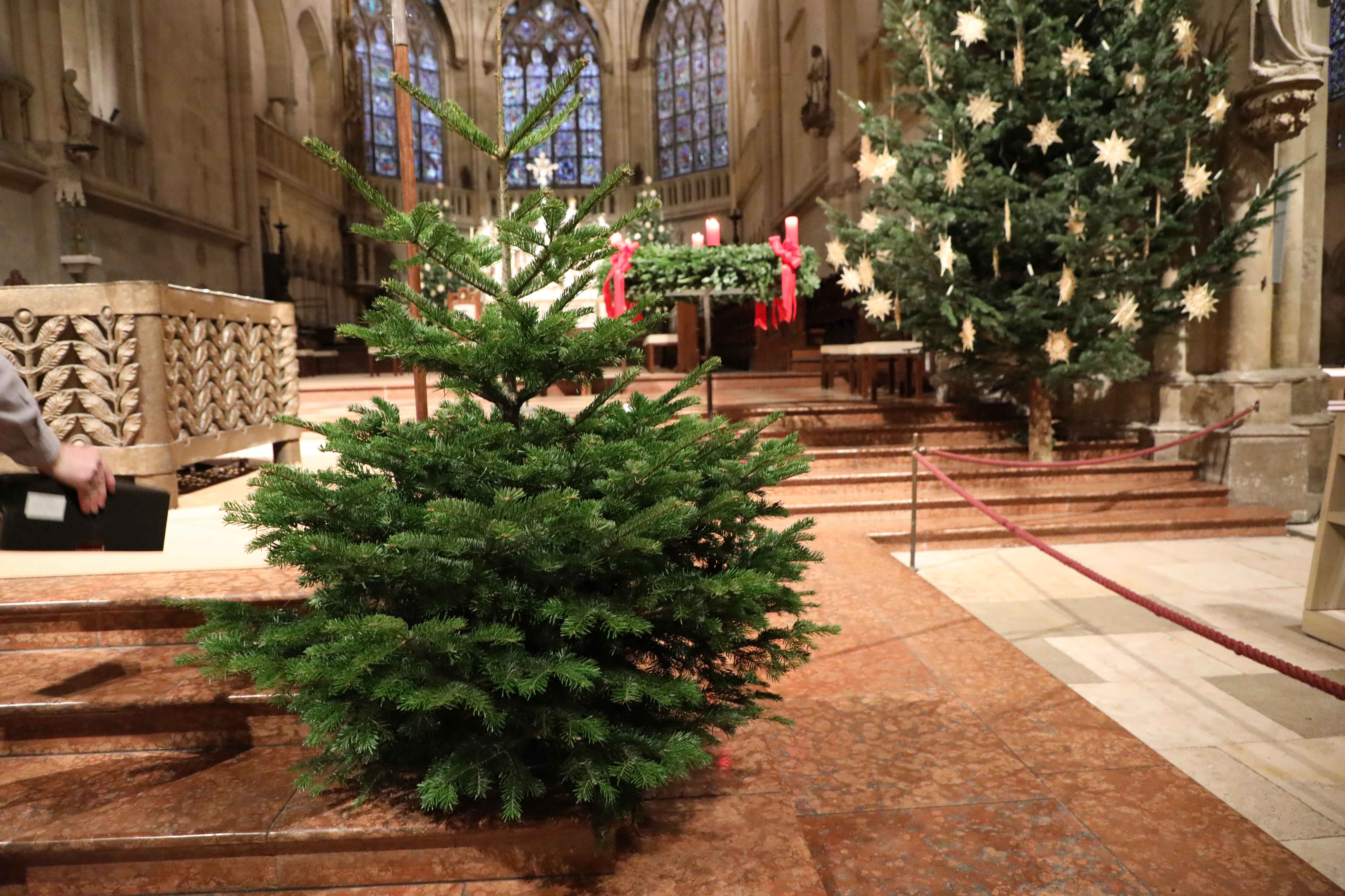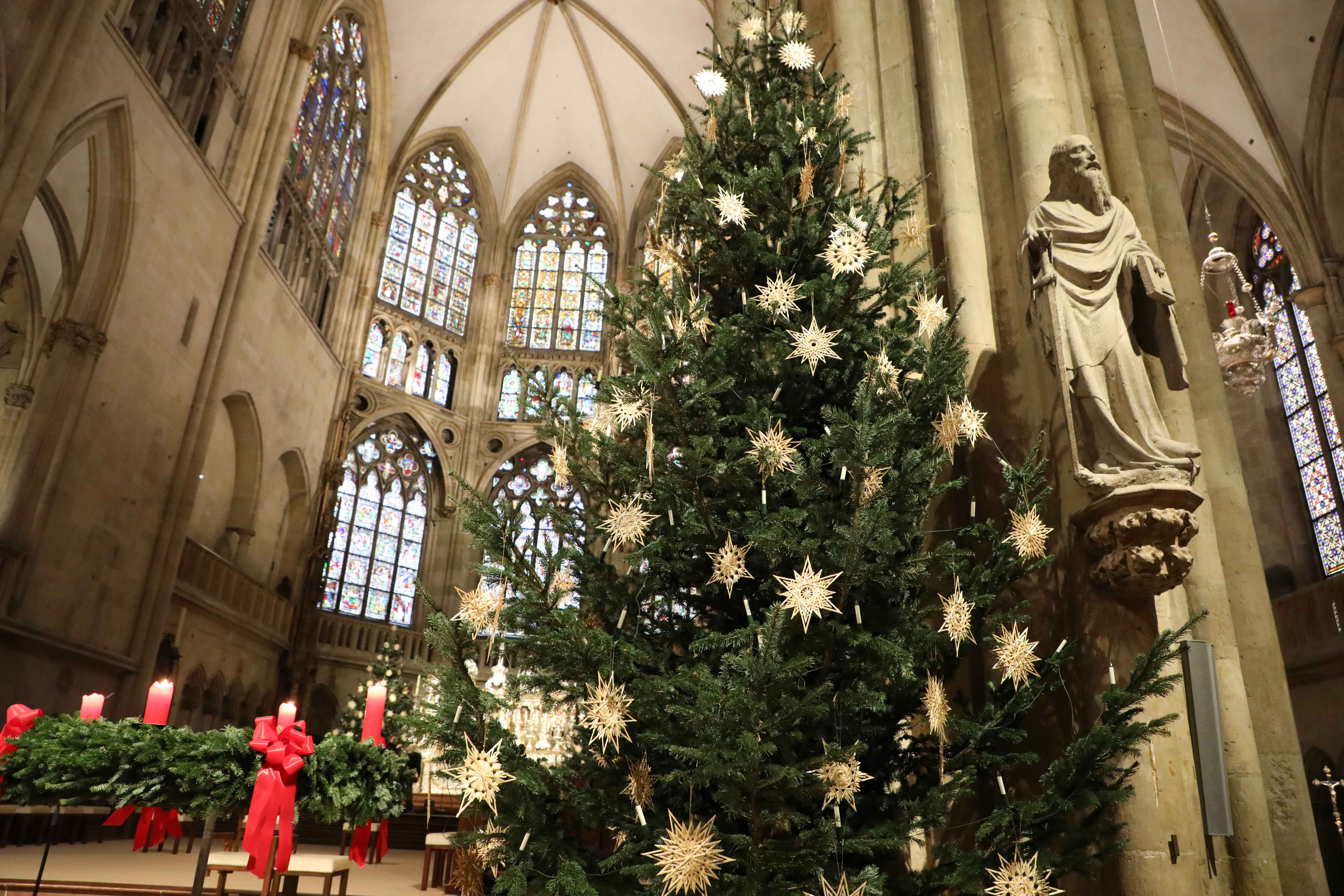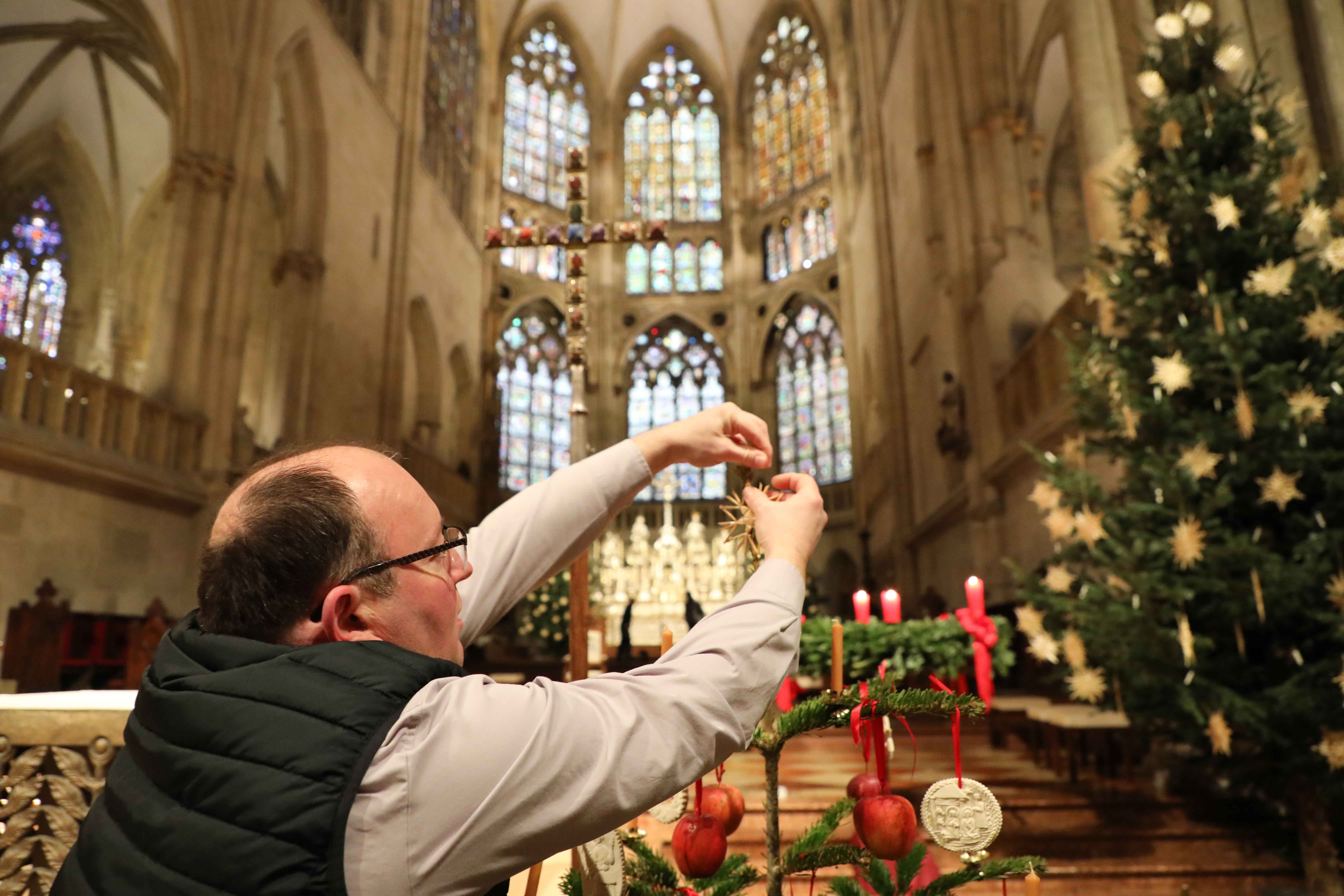 Die letzten Vorbereitungen für Weihnachten im Regensburger Dom St. Peter laufen auch Hochtouren. Die großen Christbäume sind bereits geschmückt – traditionell mit Strohsternen und Lichterketten. An allen Ecken wird noch geputzt und alles wird für die Christmette morgen Abend auf Hochglanz gebracht. Eine der letzten Arbeiten für Dommesner Robert Feigl ist das Aufstellen und Schmücken des Christbaumes für Bischof Rudolf Voderholzer auf den Stufen vor dem Volksaltar im Dom St. Peter.
