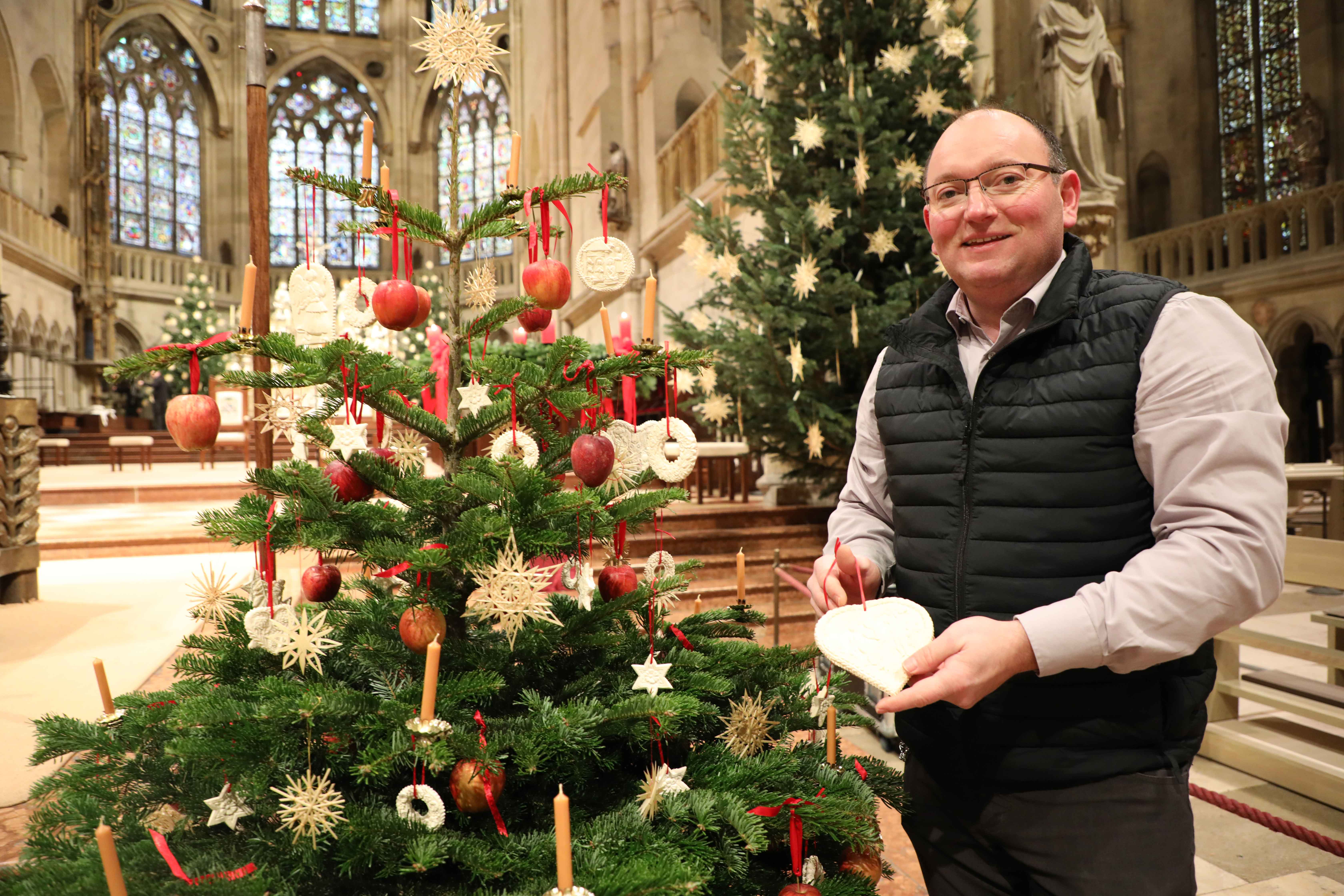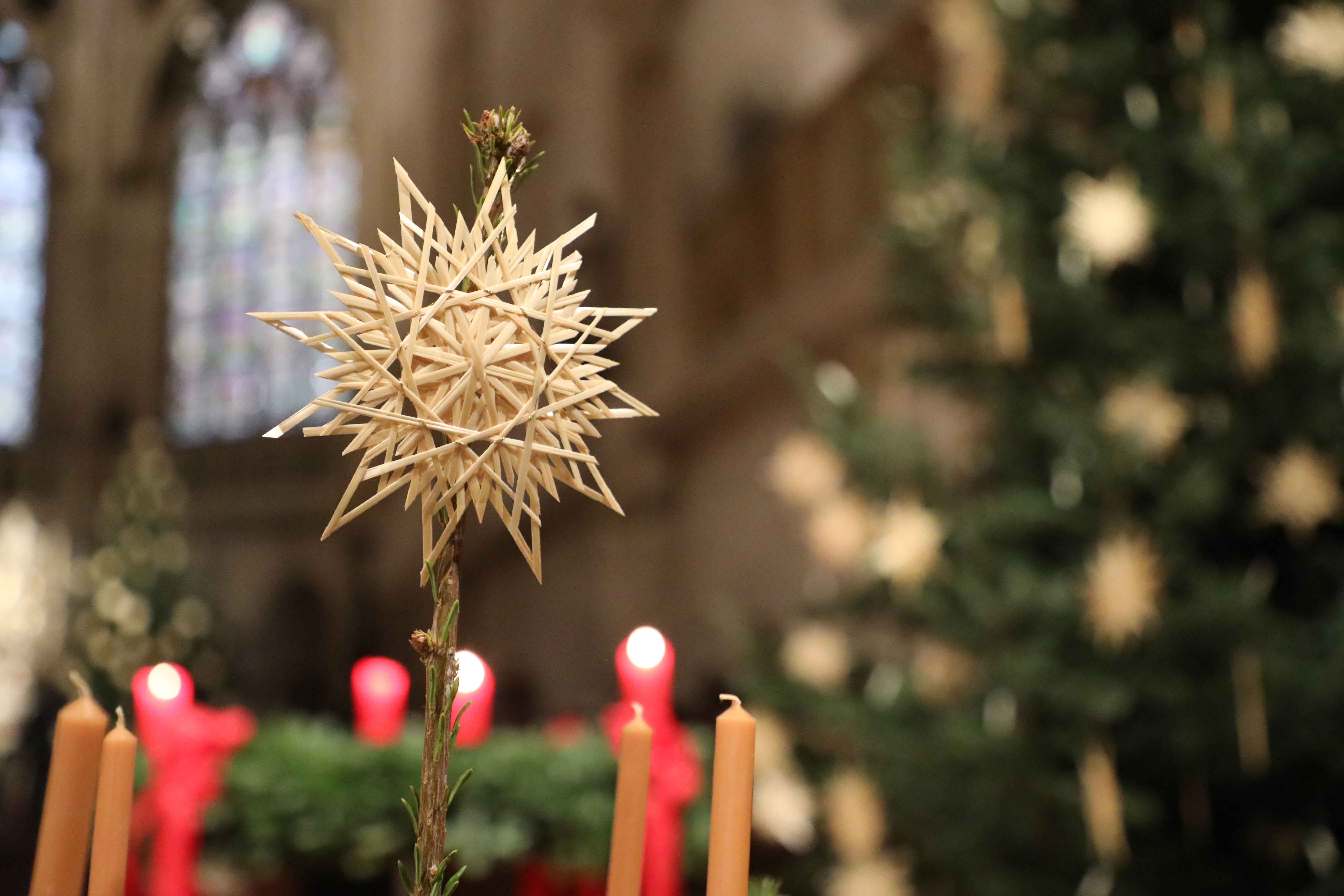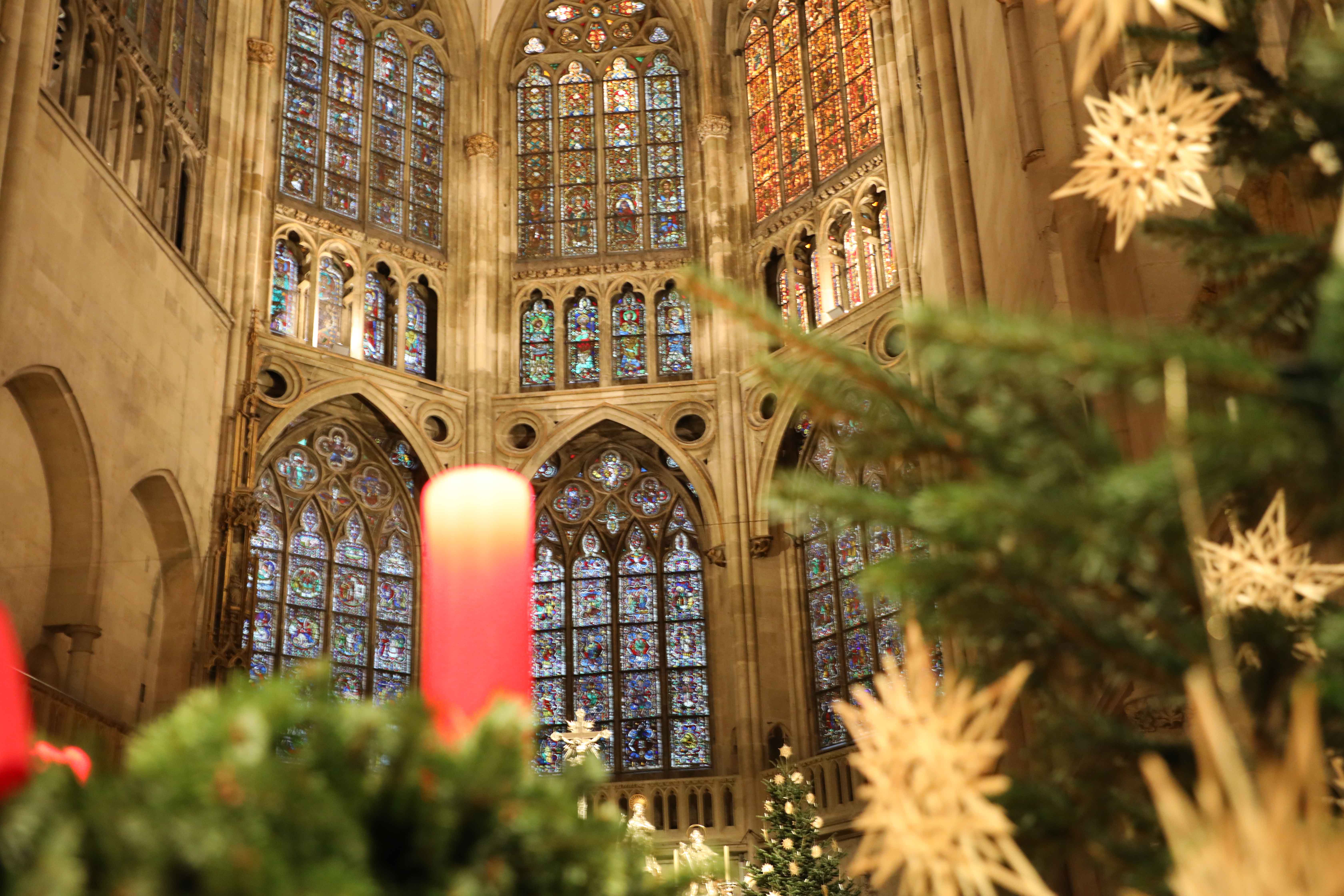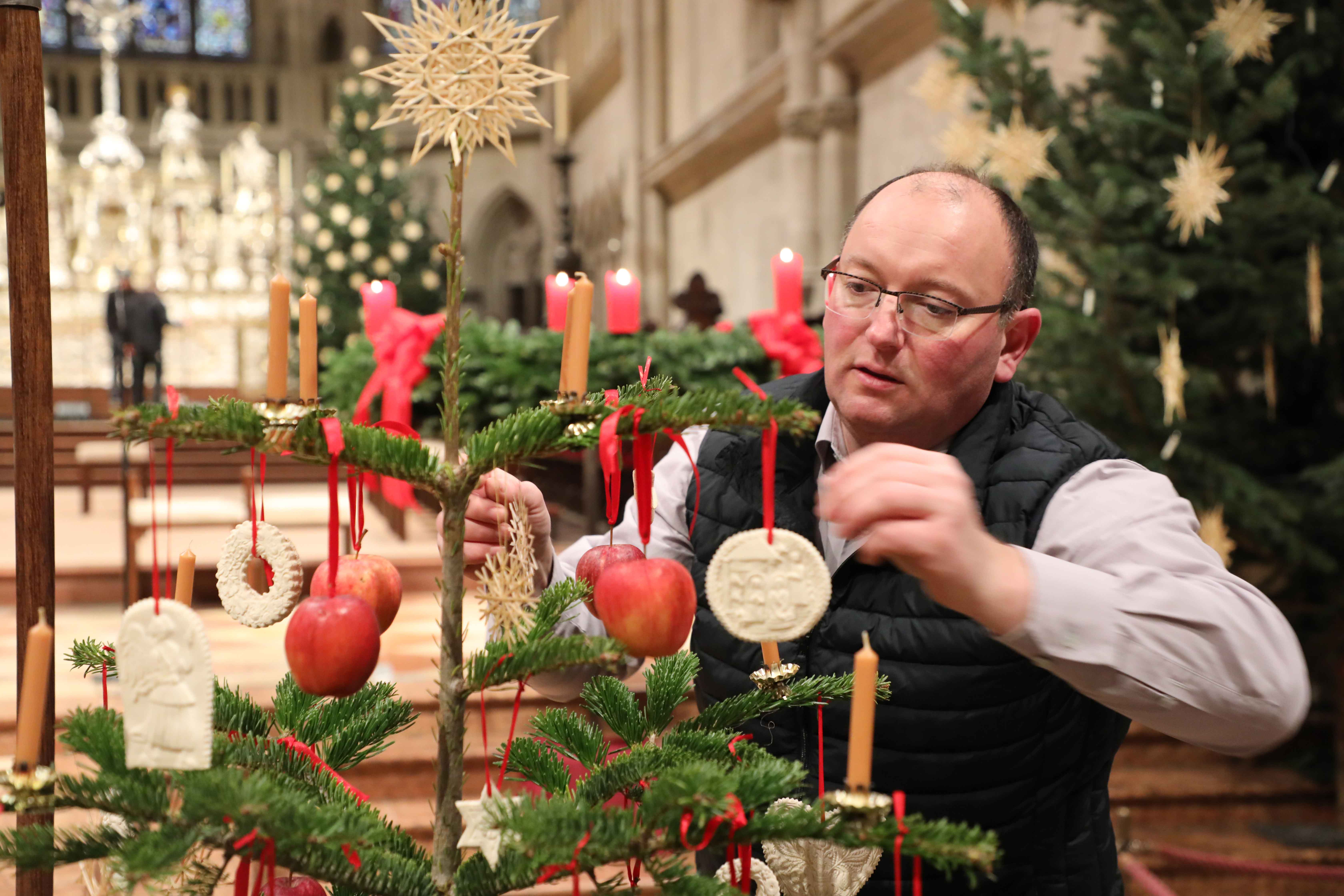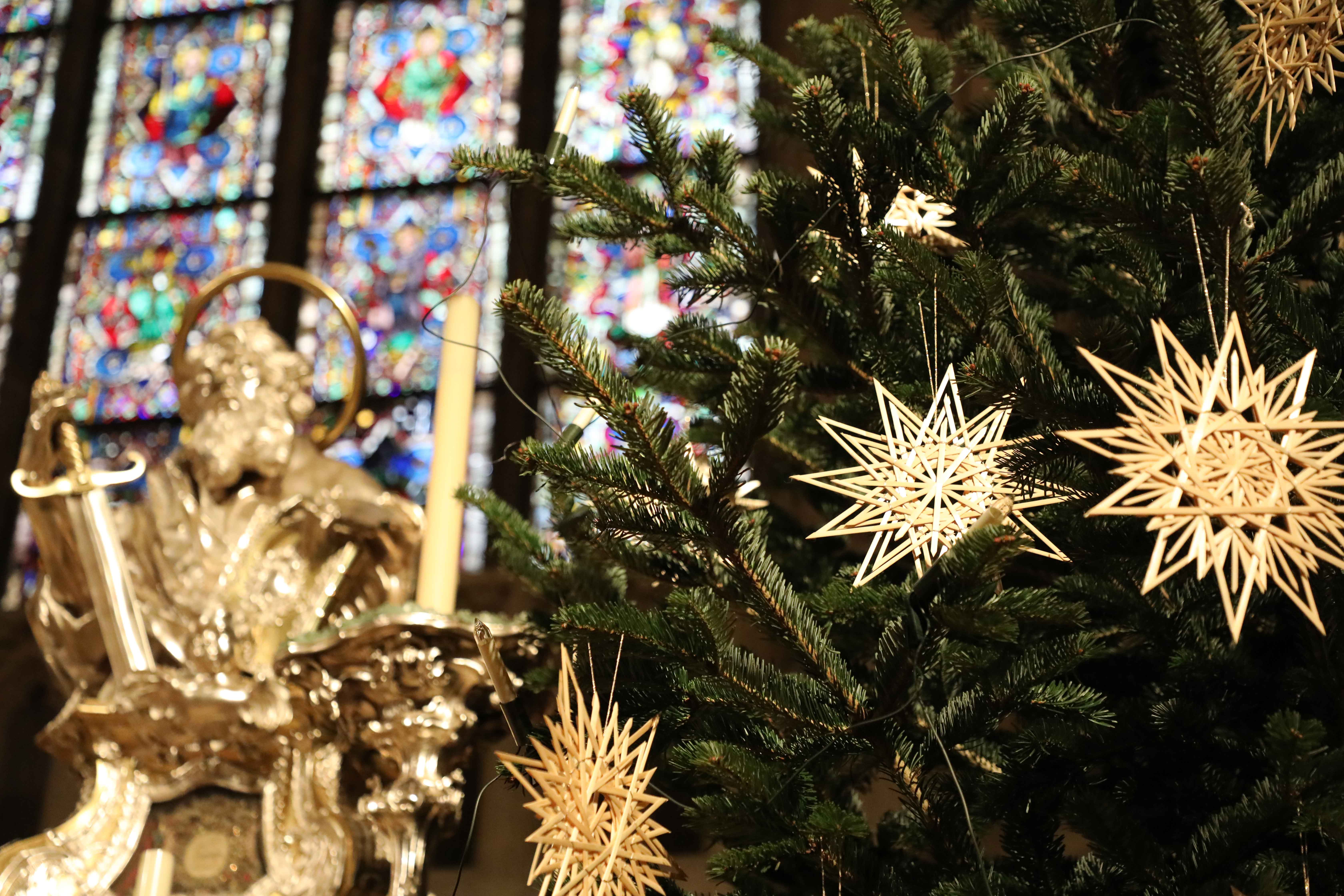 Die letzten Vorbereitungen für Weihnachten im Regensburger Dom St. Peter laufen auch Hochtouren. Die großen Christbäume sind bereits geschmückt – traditionell mit Strohsternen und Lichterketten. An allen Ecken wird noch geputzt und alles wird für die Christmette morgen Abend auf Hochglanz gebracht. Eine der letzten Arbeiten für Dommesner Robert Feigl ist das Aufstellen und Schmücken des Christbaumes für Bischof Rudolf Voderholzer auf den Stufen vor dem Volksaltar im Dom St. Peter.