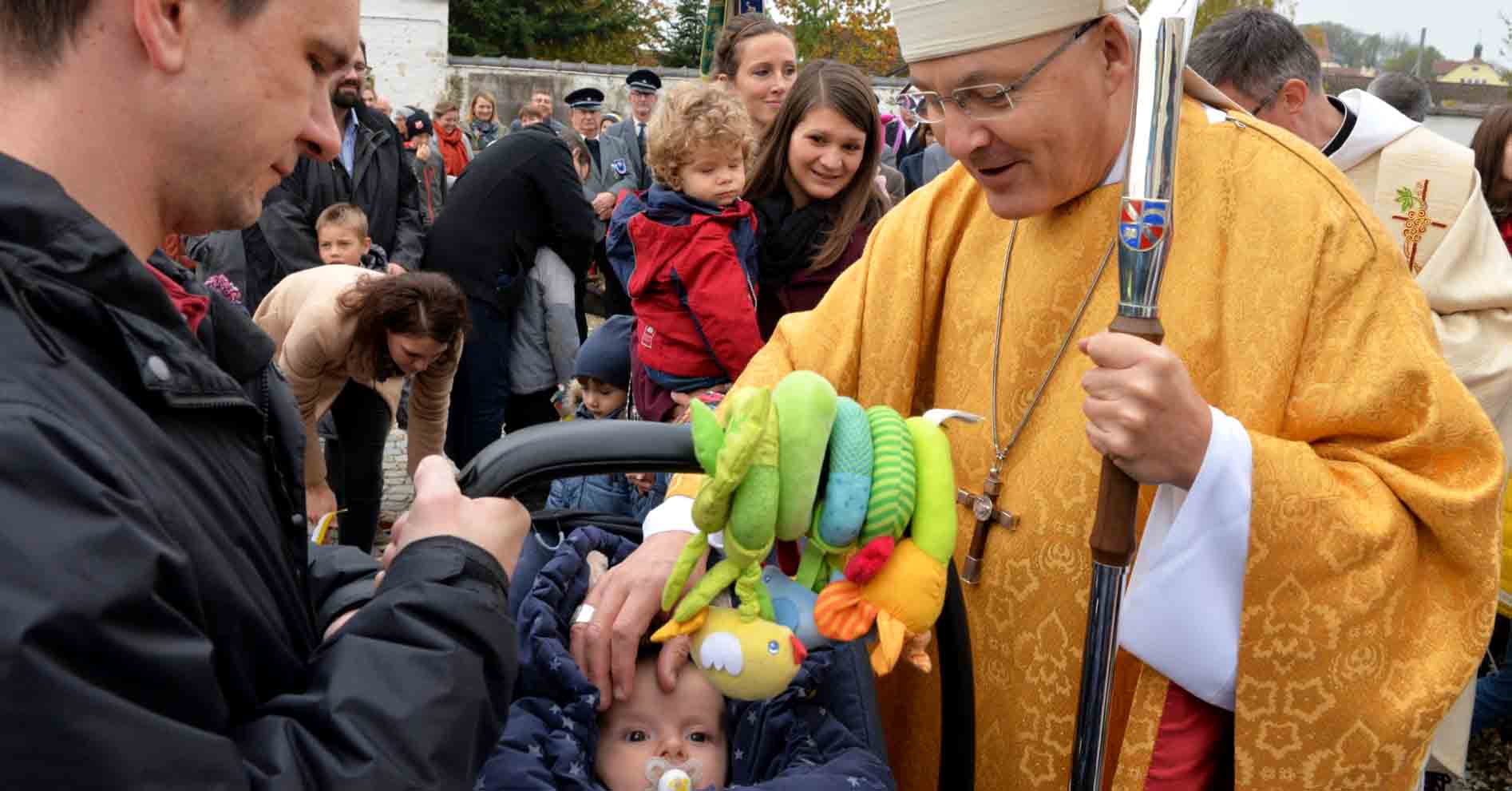 "Zächäus, komm schnell herunter! Denn ich muss heute Gast in deinem Haus sein" zitierte Bischof Rudolf aus dem Sonntagsevangelium und meinte, es hätte nicht besser passen können. Der Sonntag war ein großer Tag für die Pfarrgemeinde Sankt Michael in Steinach (Landkreis Straubing-Bogen), denn die Wiedereröffnung der Pfarrkirche wurde gefeiert und dazu war auch Bischof Rudolf auf seinem Weg "Hinein ins Bistum" zum Pastoralbesuch gekommen. Innerhalb der letzten 11 Monate war der Innenraum des Gotteshauses saniert worden. Zu Beginn bekam Bischof Rudolf vorübergehend die "Schlüsselgewalt" für die Pfarrkirche - er öffnete damit die drei Eingangstüren und nach dem Einzug der Ministranten und Priester füllte sich die große Kirche schnell mit Pfarrangehörigen, Gästen und Vereinsabordnungen mit Fahnen.